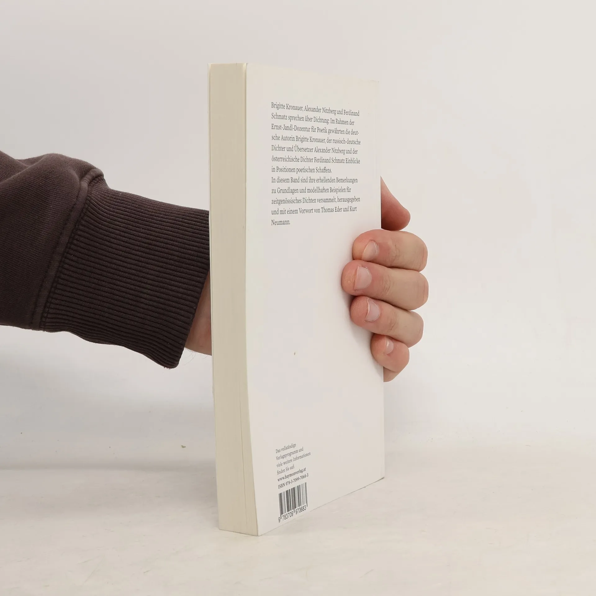 Brigitte Kronauer, Alexander Nitzberg und Ferdinand Schmatz sprechen über Dichtung: Im Rahmen der Ernst-Jandl-Dozentur für Poetik gewährten die deutsche Autorin Brigitte Kronauer, der russisch-deutsche Dichter und Übersetzer Alexander Nitzberg und der österreichische Dichter Ferdinand Schmatz Einblicke in Positionen poetischen Schaffens. In diesem Band sind ihre erhellenden Bemerkungen zu Grundlagen und modellhaften Beispielen für zeitgenössisches Dichten versammelt, herausgegeben und mit einem Vorwort von Thomas Eder und Kurt Neumann. Ferdinand Schmatz, geboren 1953, Dichter, Essayist und Romancier. Ausgezeichnet u.a. mit dem H.C.-Artmann-Preis (2006) und dem Ernst-Jandl-Preis (2009). Leiter des Instituts für Sprachkunst in Wien. Bei Haymon u.a. quellen. Gedichte (2010) und Portierisch. Nachrichten aus dem Berge in Courier New (HAYMONtb 2012).