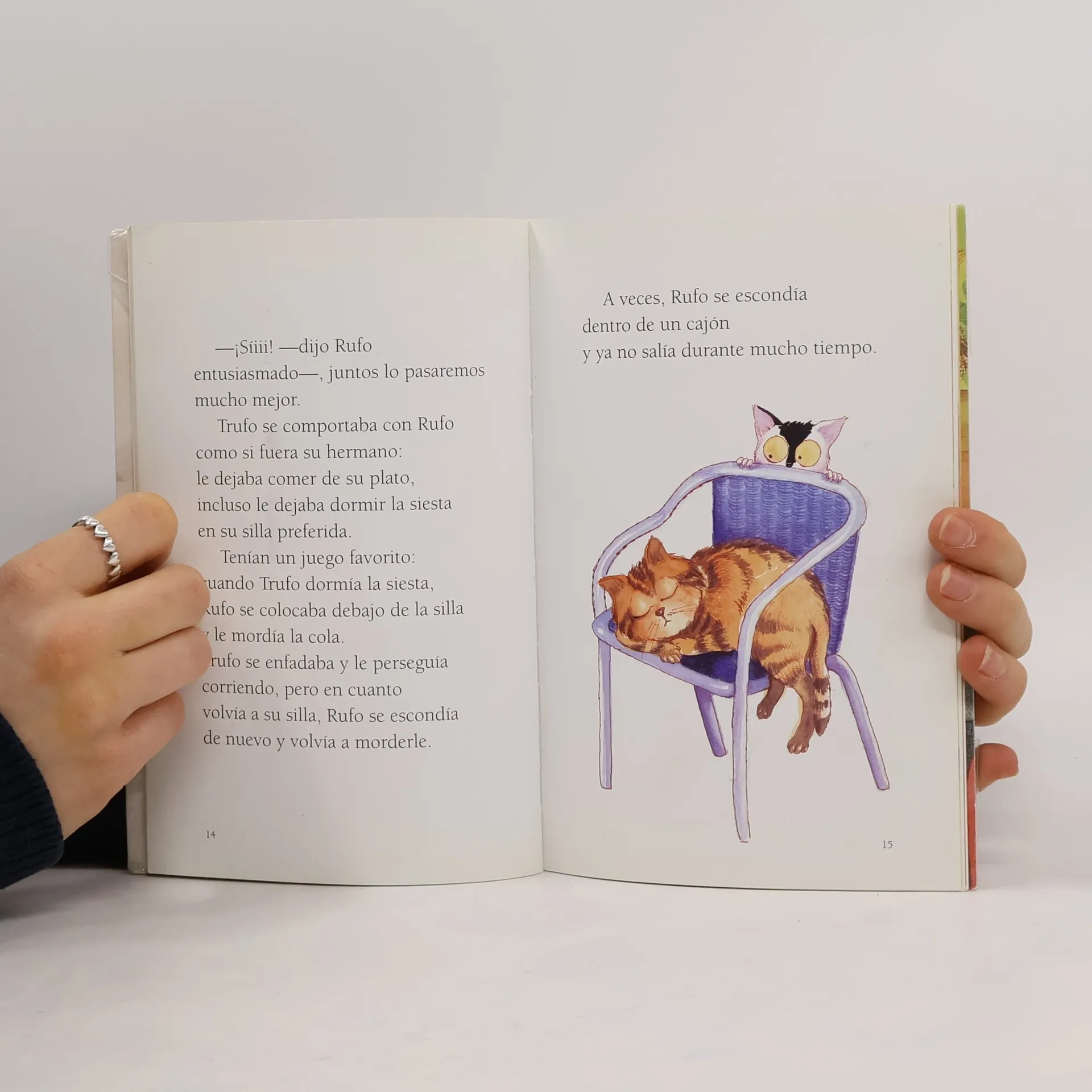 Trufo es un gato rayado que tiene que compartir el pasillo, el tejado y su manta con Rufo, un gato más pequeño de manchas negras.