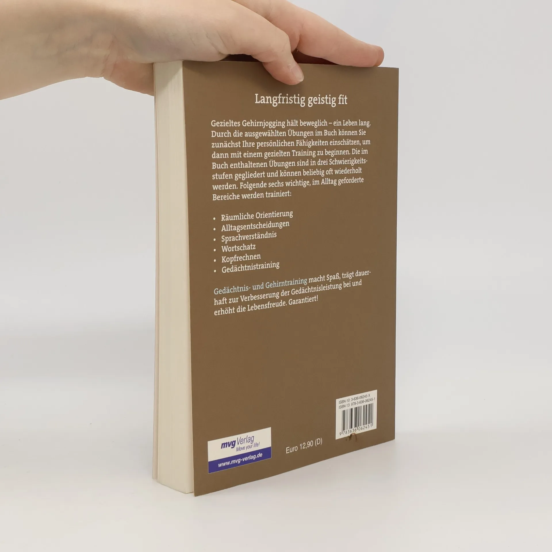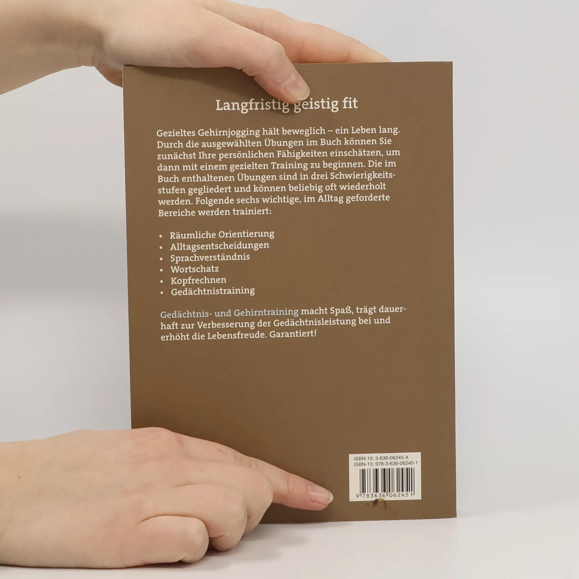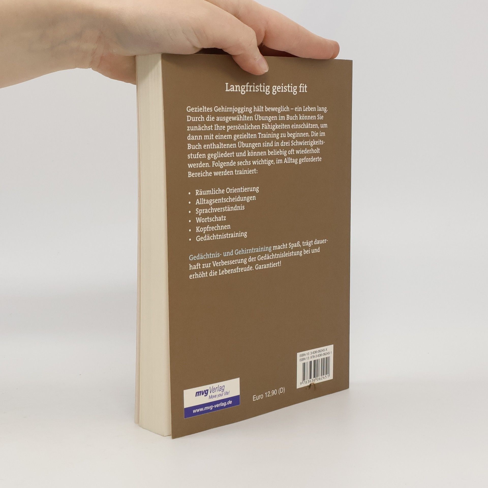 Gezieltes Gehirnjogging im Alter macht beweglich. Mit Hilfe eines Tests können Leserinnen und Leser zunächst ihre Fähigkeiten einschätzen. Die anschließenden Übungen sind in drei Schwierigkeitsstufen gegliedert und können beliebig oft wiederholt werden. Folgende sechs wichtige Bereiche im Alltag werden trainiert und verbessern die Gedächtnisleistung: - Räumliche Orientierung - Alltagsentscheidungen - Sprachverständnis - Wortschatz - Kopfrechnen - Gedächtnistraining