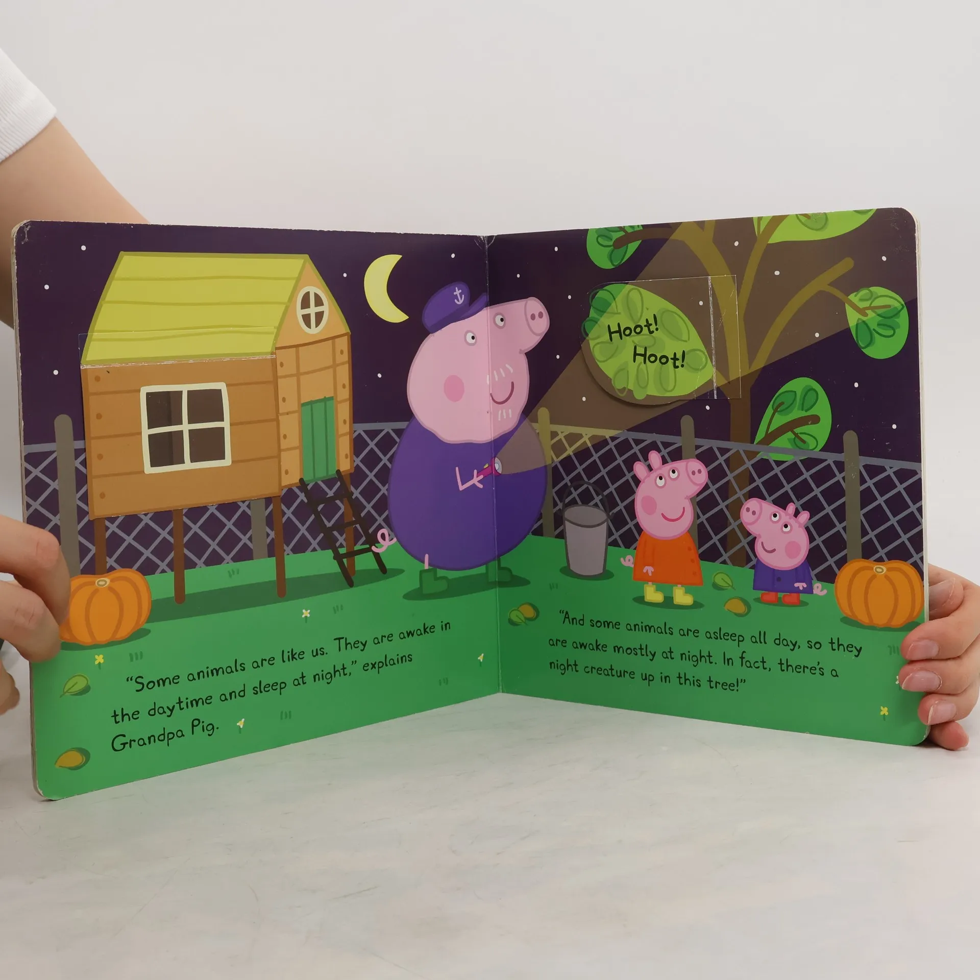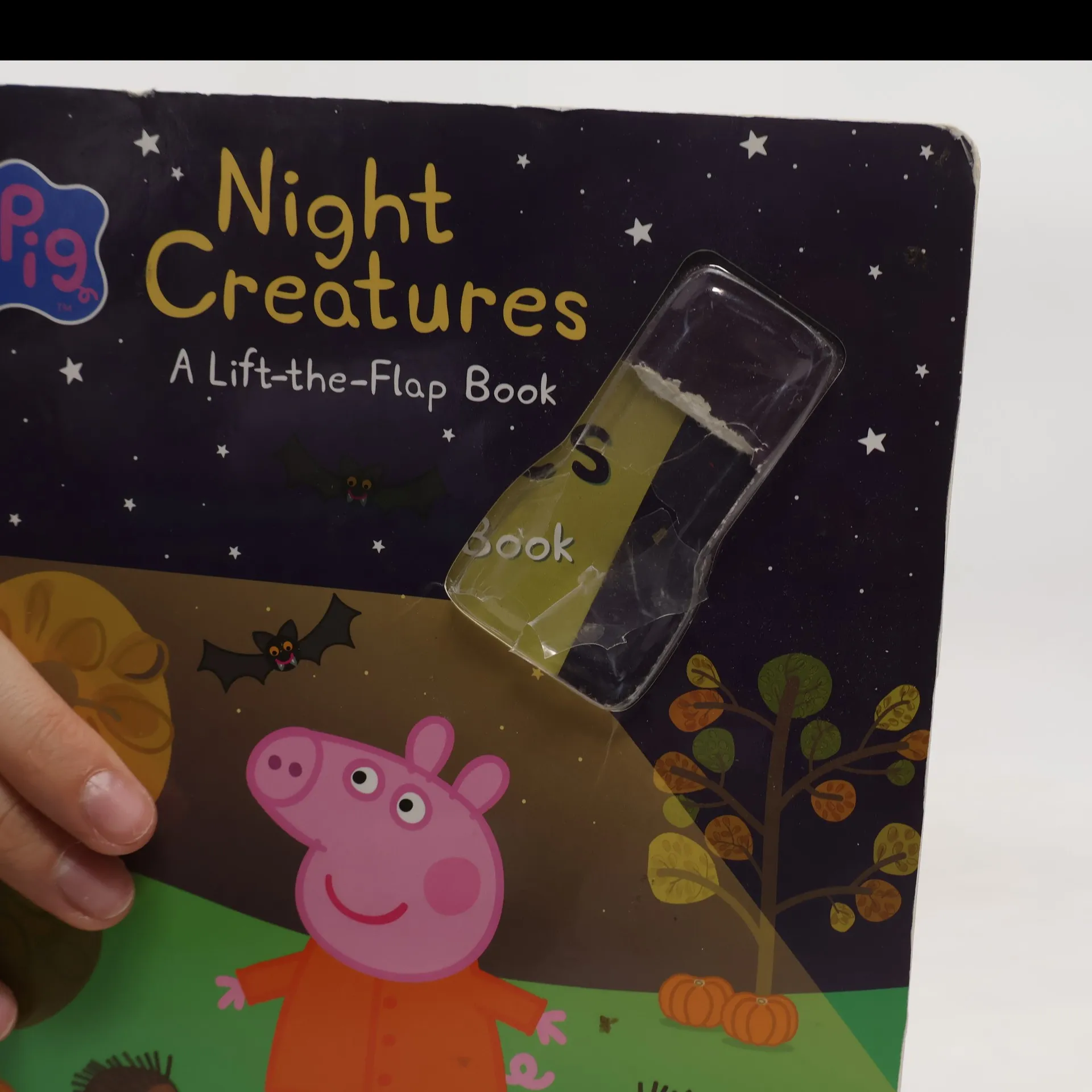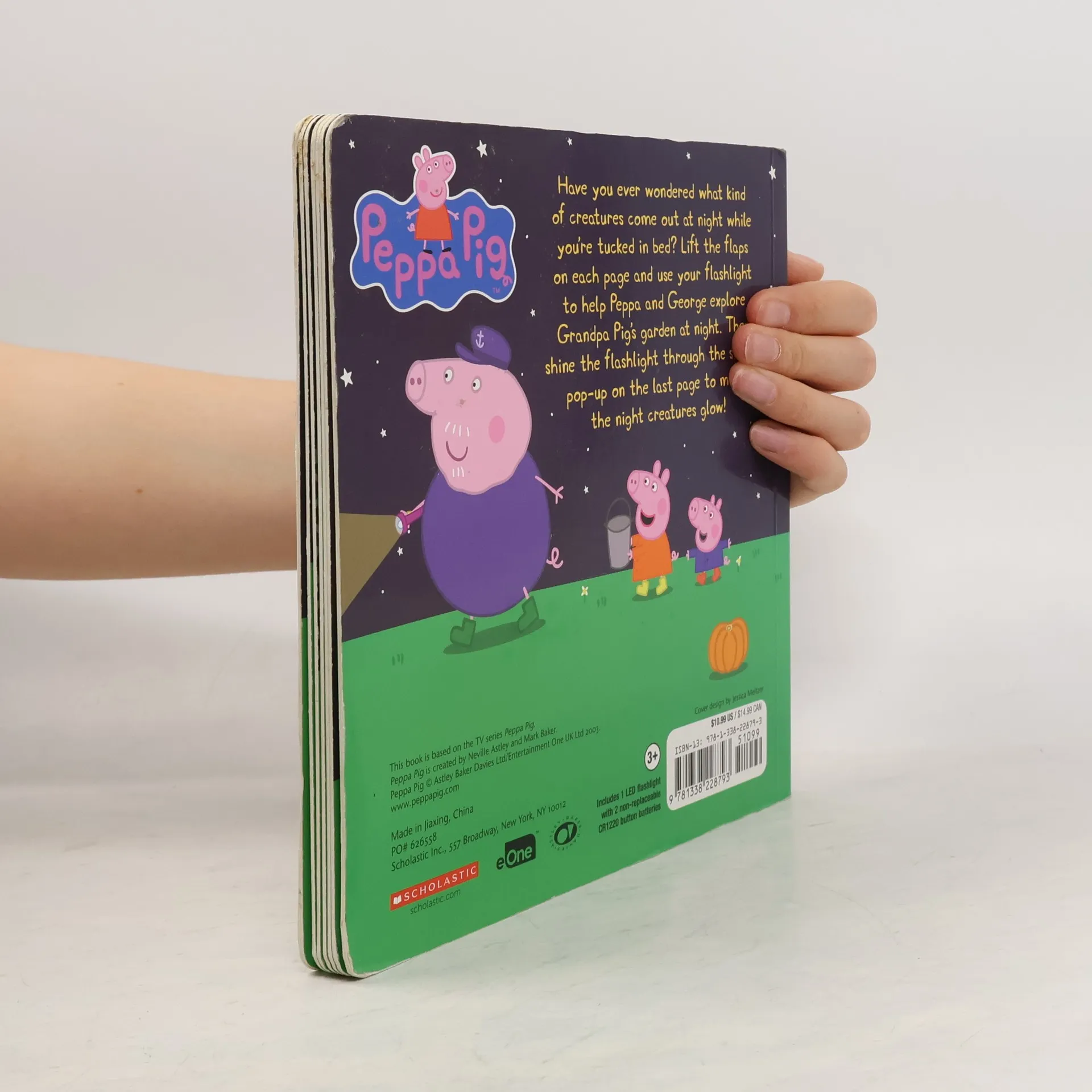 Lift the flaps on every spread of this storybook to discover the creatures who live in Grandpa Pig's garden at night! This board book includes an exclusive mini Peppa Pig flashlight. Have you ever wondered what kind of creatures come out at night while you're tucked in bed? Join Peppa Pig and her little brother George as they explore Grandpa Pig's garden at nighttime and see owls and slugs and hedgehogs, oh my! Lift the flaps on every spread and use the exclusive Peppa Pig flashlight to find the creatures hidden in the dark.