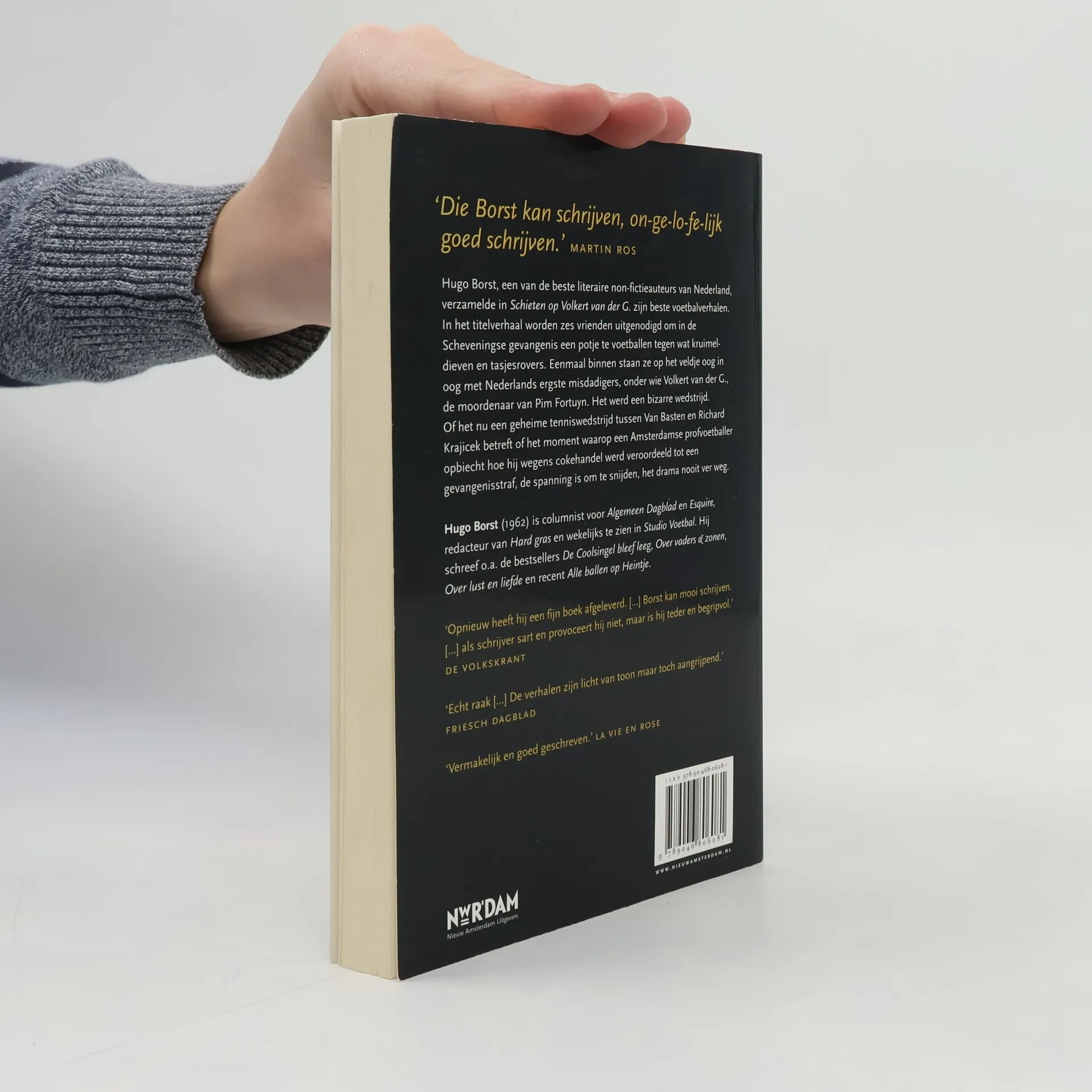Op een dagen worden zes vrienden door een medewerker van de gevangenis in Scheveningen uitgenodigd om 'binnen' een potje te voetballen tegen wat kruimeldieven en tasjesrovers. Ze twijfelen, maar doen het. Eenmaal binnen staan ze op het veldje oog in oog met Nederlands ergste misdadigers, onder wie de schietgrage overvaller Appie A., seriemoordenaar Willem van E. en Martin C., de moordenaar van de 13-jarige Sybine Jansons. Dan zien ze wie er op doel staat. Ongelofelijk: de moordenaar van Pim Fortuyn. In het titelverhaal 'Schieten op Volkert van der G.' beschrijft Hugo Borst deze bizarre wedstrijd.Borst - die volgens de auteurs van het boek 'Meer dan de feiten' samen met Martin Bril, Joris Luyendijk, Geert Mak en Annejet van der Zijl tot de beste literaire non-fictieauteurs van Nederland behoort - verzamelde in dit boek zijn beste voetbalverhalen. Of het nu een geheime tenniswedstrijd tussen Van Basten en Richard Krajicek betreft of het moment waarop een Amsterdamse profvoetballer opbiecht hoe hij wegens cokehandel werd veroordeeld tot gevangenisstraf; de spanning is om te snijden, het drama nooit ver weg.
