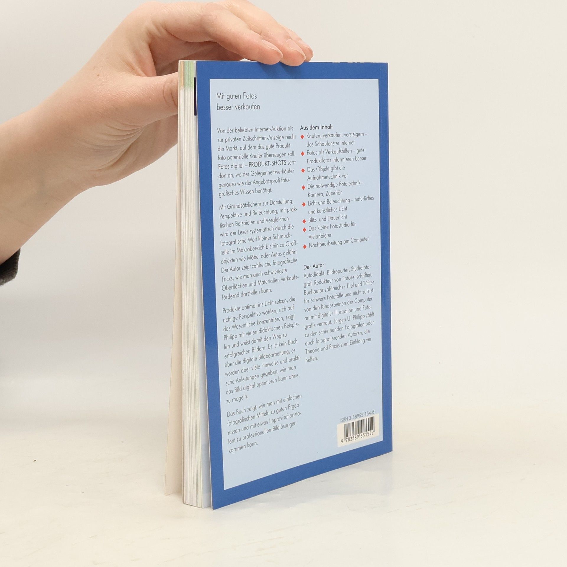 „Fotos digital – Produkt-Shots“ zeigt, wie man mit einfachen Mitteln zu guten Bild-Ergebnissen, mit Einfallsreichtum und Improvisation zu professionellen fotografischen Lösungen kommen kann. Ein breit gefächertes fotografisches Thema, präzise aufbereitet für eine immer größer werdende Zielgruppe: Alle ebay Anbieter und die große Gruppe derjenigen, die Ihre Produkte im eigenen Prospekt oder Internet-shop anbieten und durch gute Bilder besser verkaufen wollen brauchen dieses Buch. Kompakt und kompetent geschrieben mit zahlreichen Illustrationen und Fallbeispielen.