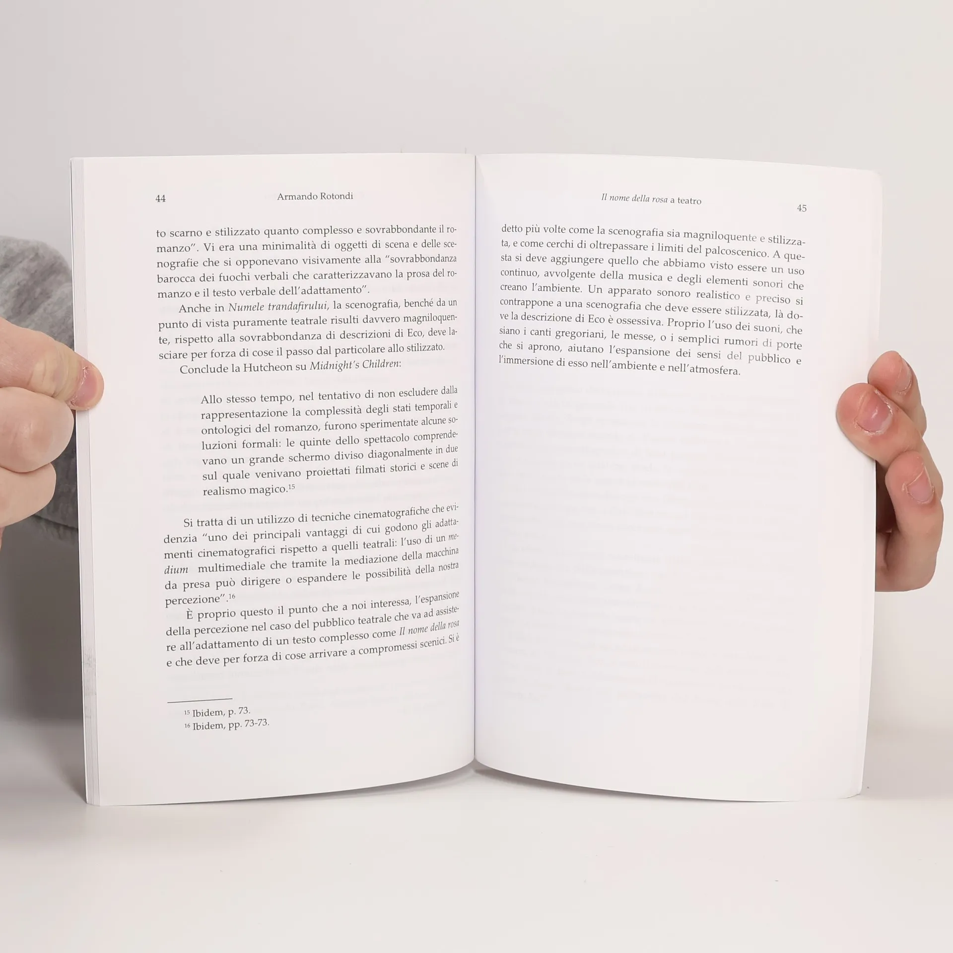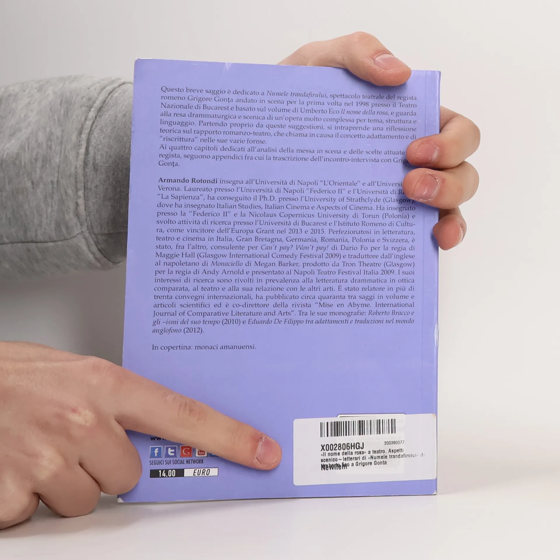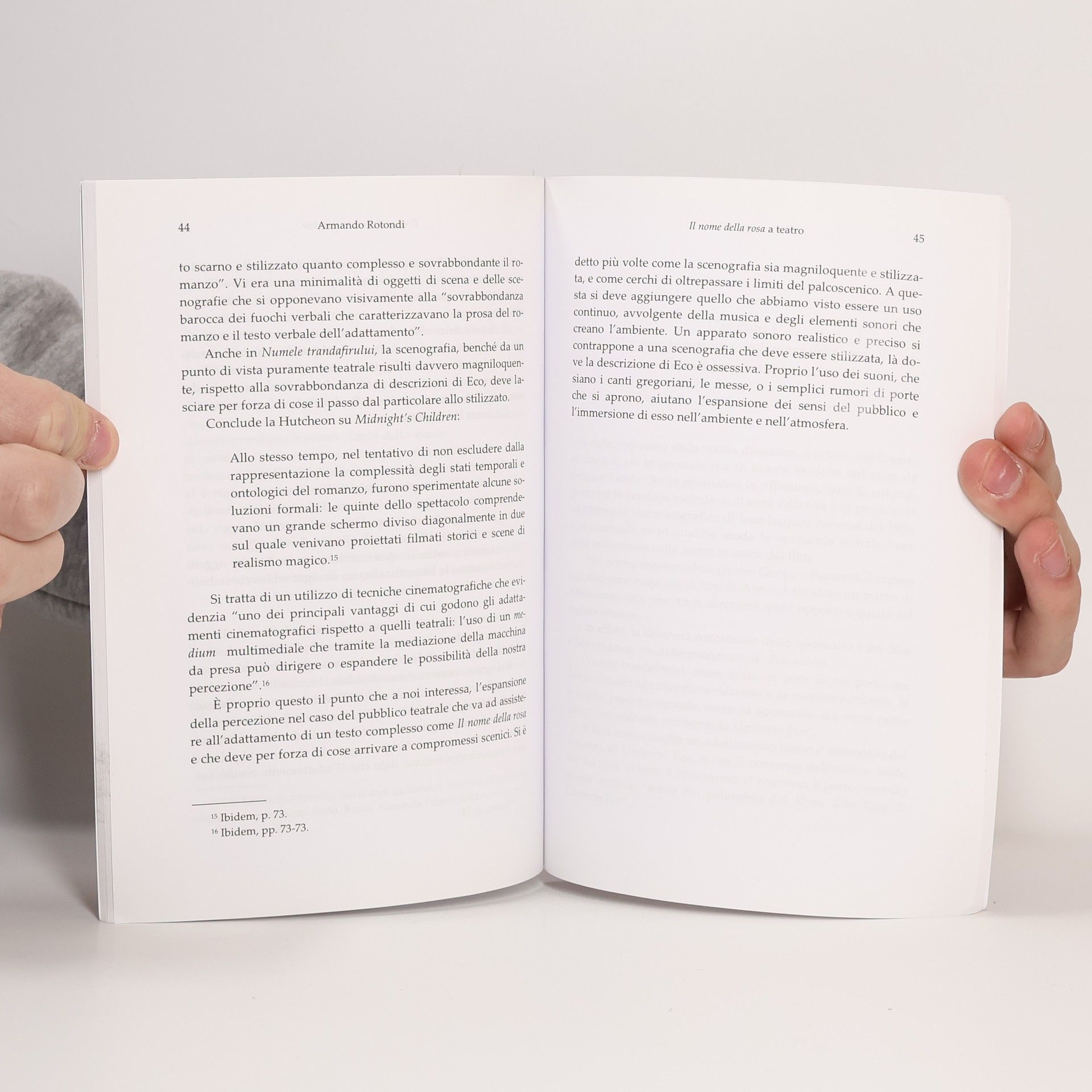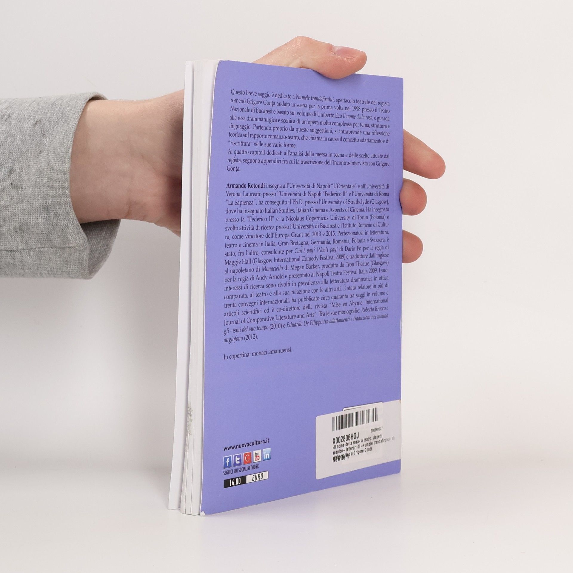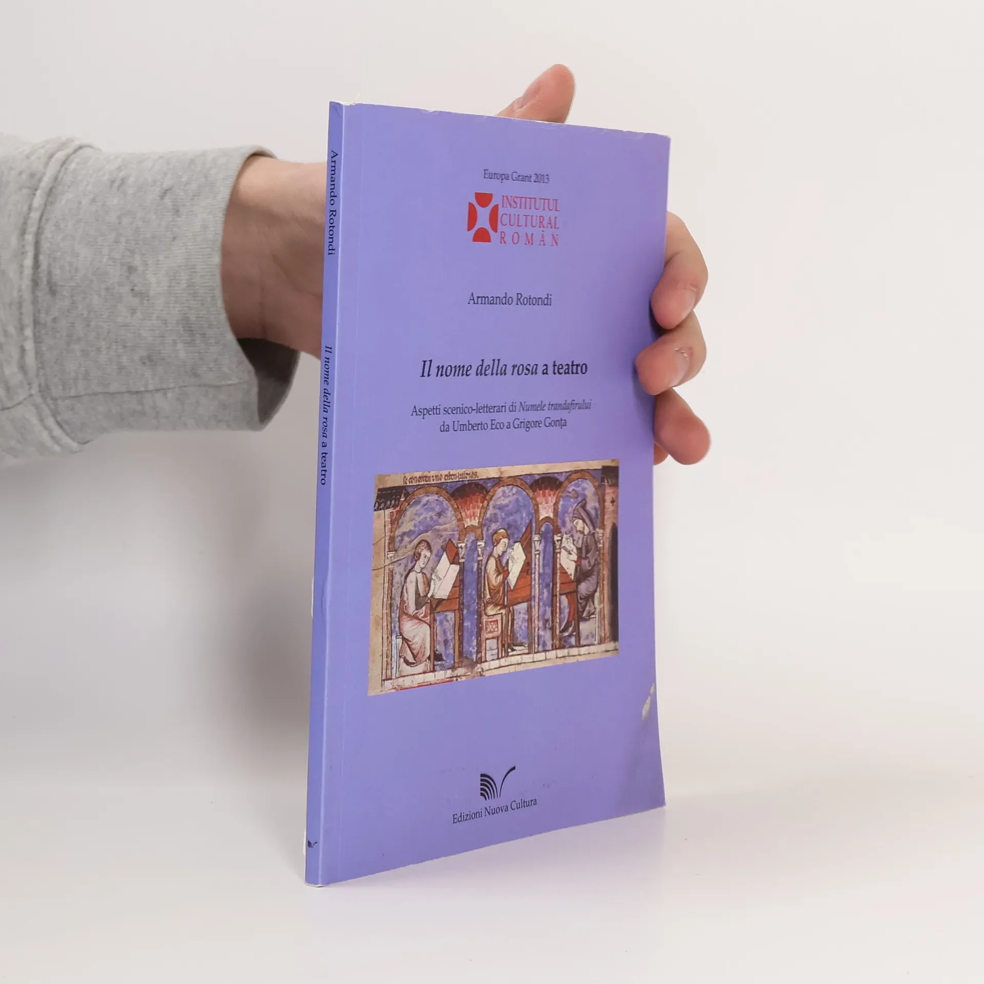 Questo breve saggio è dedicato a Numele trandafirului, spettacolo teatrale del regista romeno Grigore Gonţa andato in scena per la prima volta nel 1998 presso il Teatro Nazionale di Bucarest e basato sul volume di Umberto Eco Il nome della rosa, e guarda alla resa drammaturgica e scenica di un’opera molto complessa per tema, struttura e linguaggio. Partendo proprio da queste suggestioni, si intraprende una riflessione teorica sul rapporto romanzo-teatro, che chiama in causa il concetto adattamento e di “riscrittura” nelle sue varie forme. Ai quattro capitoli dedicati all’analisi della messa in scena e delle scelte attuate dal regista, seguono appendici fra cui la trascrizione dell’incontro-intervista con Grigore Gonţa.