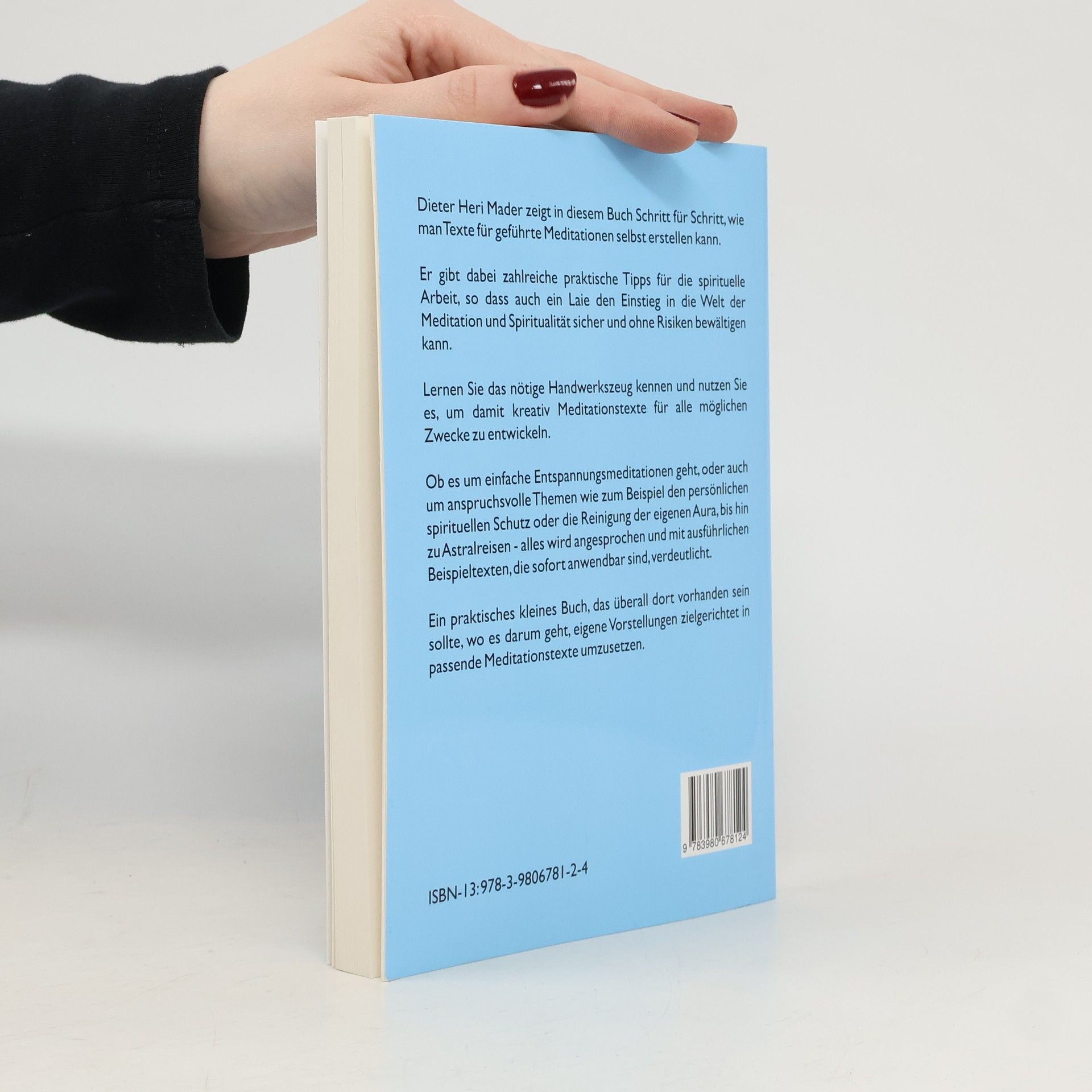 Dieter Heri Mader zeigt in diesem Buch Schritt für Schritt, wie man Texte für geführte Meditationen selbst erstellen kann. Er gibt dabei zahlreiche praktische Tipps für die spirituelle Arbeit, so dass auch ein Laie den Einstieg in die Welt der Meditation und Spiritualität sicher und ohne Risiken bewältigen kann. Lernen Sie das nötige Handwerkszeug kennen und nutzen Sie es, um damit kreativ Meditationstexte für alle möglichen Zwecke zu entwickeln. Ob es um einfache Entspannungsmeditationen geht, oder auch um anspruchsvolle Themen wie zum Beispiel den persönlichen spirituellen Schutz oder die Reinigung der eigenen Aura, bis hin zu Astralreisen - alles wird angesprochen und mit ausführlichen Beispieltexten, die sofort anwendbar sind, verdeutlicht. Ein praktisches kleines Buch, das überall dort vorhanden sein sollte , wo es darum geht, eigene Vorstellungen zielgerichtet in passende Meditationstexte umzusetzen.