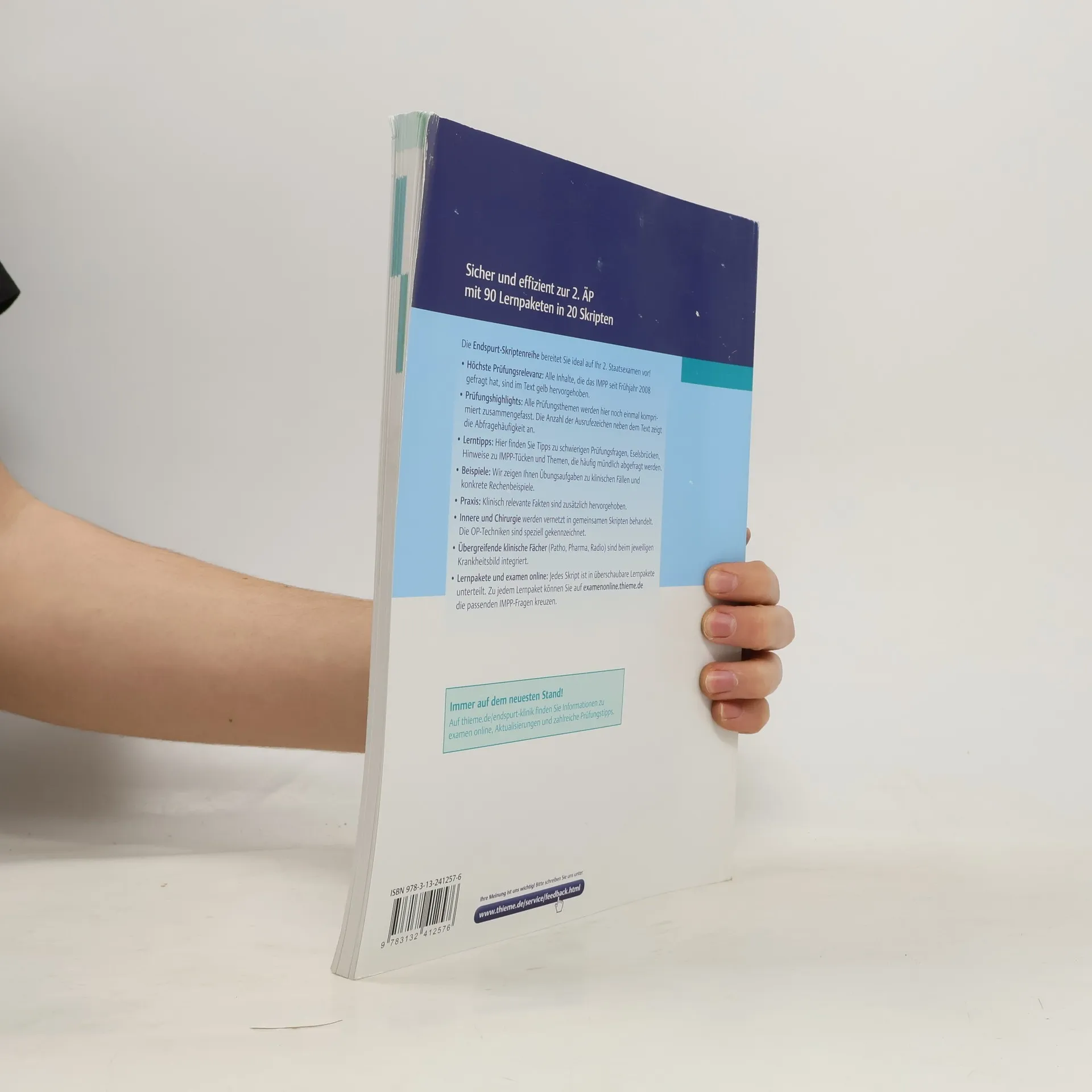 Bereit fürs 2. Staatsexamen? Mit Endspurt Klinik kannst du dich gezielt und zeitsparend auf die 2. ÄP vorbereiten und kommst sicher durch die Prüfung. Alle prüfungsrelevanten Themen sind strukturiert und verständlich zusammengefasst, ohne überflüssiges Drumherum. - alle vom IMPP seit Frühjahr 2008 geprüften Inhalte sind im Text gelb hervorgehoben - in den Prüfungshighlights werden alle Prüfungsthemen komprimiert dargestellt - Ausrufezeichen neben dem Text zeigen die Abfragehäufigkeit an - hilfreiche Tipps, Beispiele, Eselsbrücken und Infos zur mündlichen Prüfung - klinisch relevante Fakten, Übungsaufgaben und konkrete Rechenbeispiele - Innere Medizin und Chirurgie werden vernetzt in gemeinsamen Skripten behandelt - übergreifende klinische Fächer sind beim jeweiligen Krankheitsbild integriert - jedes Skript ist in überschaubare Lernpakete unterteilt, die passenden IMPP- Fragen kannst du auf examenonline.thieme.de kreuzen In der 2. Auflage wurden alle Inhalte auf den aktuellsten Stand gebracht und neue Frageninhalte eingearbeitet. Mehr Infos zu examen online, Aktualisierungen zu den Skripten und zahlreiche Prüfungstipps gibt's unter thieme.de/endspurt-klinik.