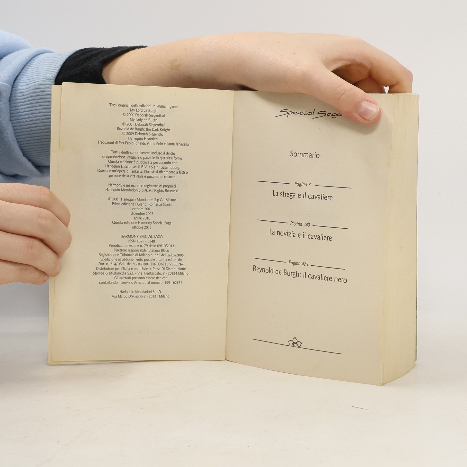 Inghilterra, XIII secolo - Figli del Conte di Campion, i nobili fratelli de Burgh sono ognuno alla ricerca della propria strada e della donna giusta da amare. Stephen, il più bello e viziato dei sette, è costretto a scortare fino in Galles la giovane Brighid, ma quello che all'inizio gli sembra solo uno sgradevole incarico si rivela in realtà un'avventura appassionante. Robin, deciso a non cadere vittima del sortilegio che ha fatto innamorare i fratelli, si rifugia in un convento e si perde negli splendidi occhi di una dolce novizia. Reynold, infine, convinto che la gamba malata non gli permetta di avere la fortuna dei fratelli in fatto di donne, parte dal castello di famiglia senza una meta precisa. Non immagina che quel viaggio si rivelerà una impresa leggendaria, alla fine della quale anche lui troverà l'anima gemella. LA STREGA E IL CAVALIERE LA NOVIZIA E IL CAVALIERE REYNOLD DE BURGH: IL CAVALIERE NERO
