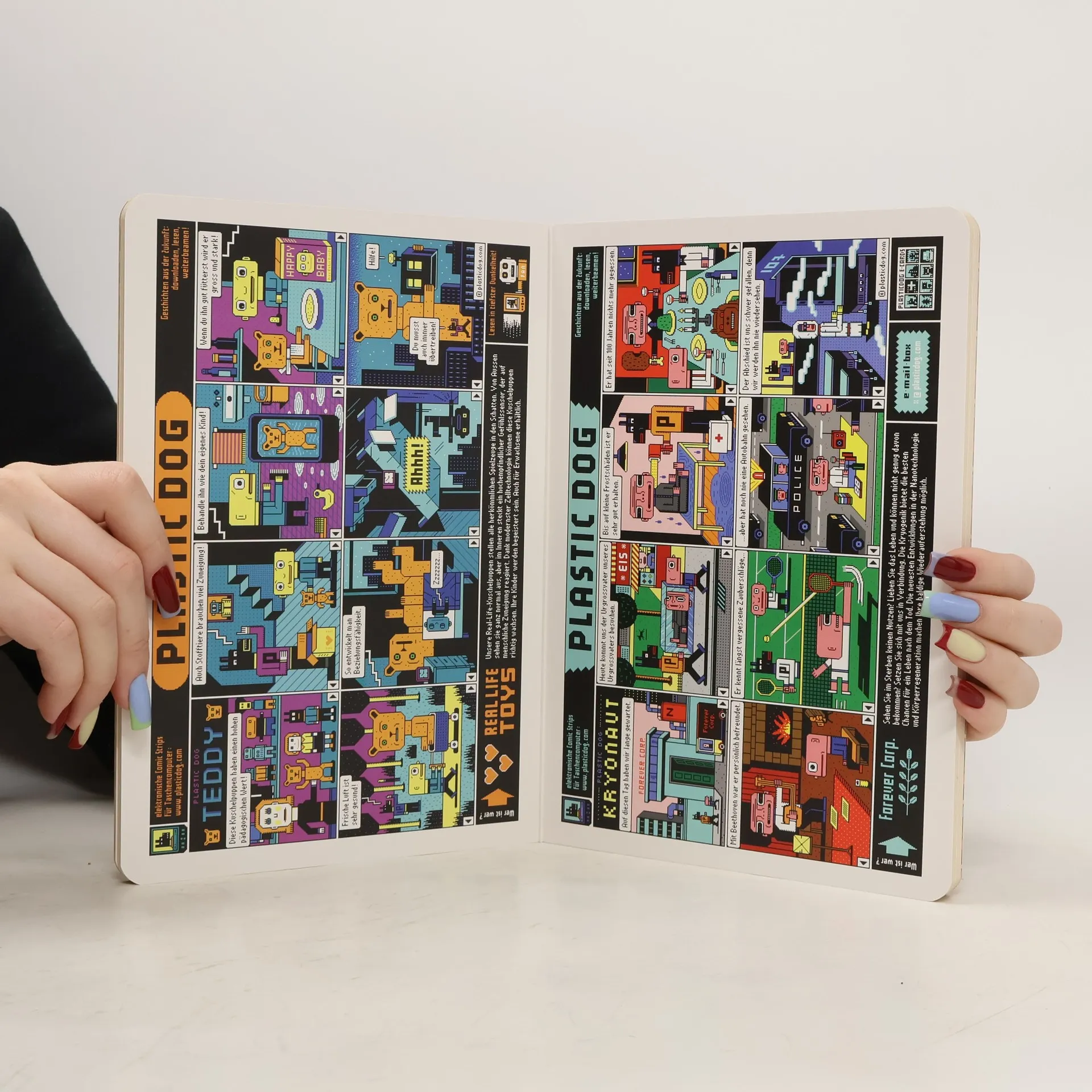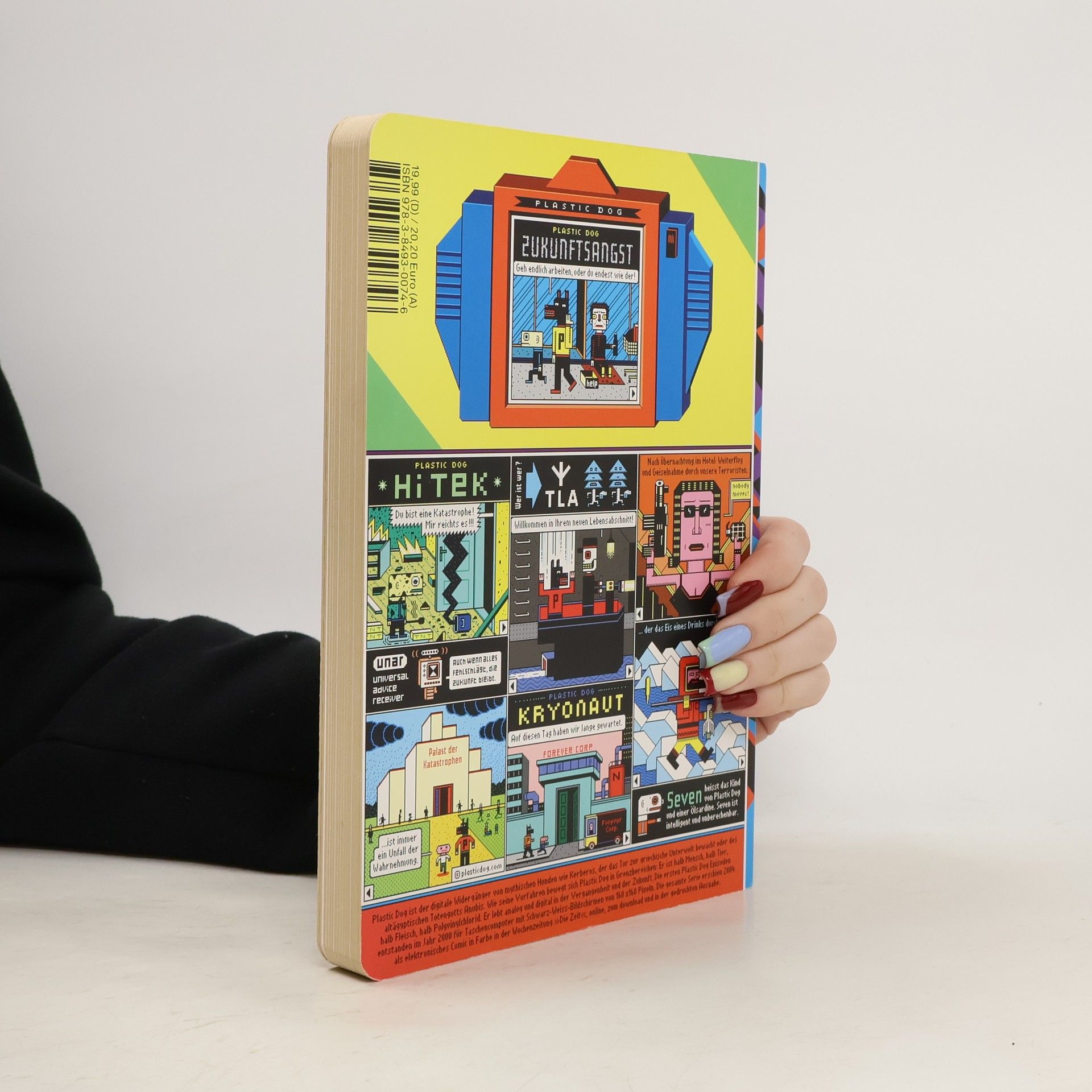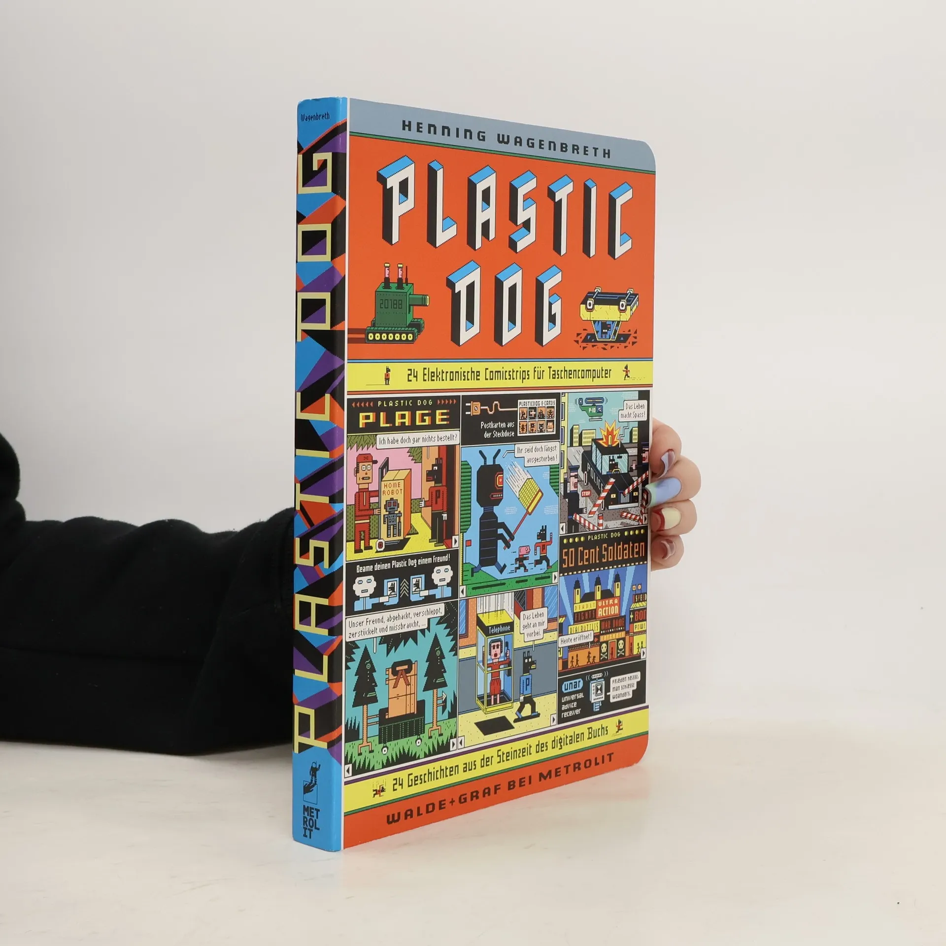 In Zeiten von Bluescreen und realistischer 3D-Animation wirkt die grobe 8bit-Ästhetik der frühen Heimcomputer altmodisch. Diese Ästhetik nutzt der Künstler Henning Wagenbreth in seinen Plastic-Dog-Kurzcomics, die an die Computerspiele der 1980er Jahre erinnern: kantige Figuren vor perspektivlosem Hintergrund, während die Handlung in der Zukunft spielt. Im Zentrum stehen 24 ganzseitige Abenteuer von Plastic Dog. Man kann sich das so vorstellen: "Die Augen gewöhnen sich an die Dunkelheit. Ein alter Roboter spielt verpixelte Atari-Games. Zwischen zersprungenen E-Readern steht eine Vitrine mit uralten Büchern. 'Ja', schnarrt der Roboter, 'Sie dürfen das Plastic-Dog-Buch in die Hand nehmen. Es ist über 500 Jahre alt. Was für ein Anachronismus! Digitale Comics als Pappbilderbuch. Wie naiv sich die Leute damals die Zukunft vorgestellt haben.'" Wagenbreth bietet messerscharfe Beobachtungen aus der High-Tech-Welt, die auch heute noch aktuell sind. Die Sammlung präsentiert eine schräge Parallelwelt, in der Plastic Dog kapitalistischen Arbeitsverträgen und besserwisserischen Robotern begegnet und an missverstandenen Revolutionen teilnimmt. In 24 Episoden entfaltet sich ein absurd buntes, unterhaltsames Zukunfts-Panorama, das intelligenten Humor mit einer schräg-bunten Pixel-Ästhetik verbindet.