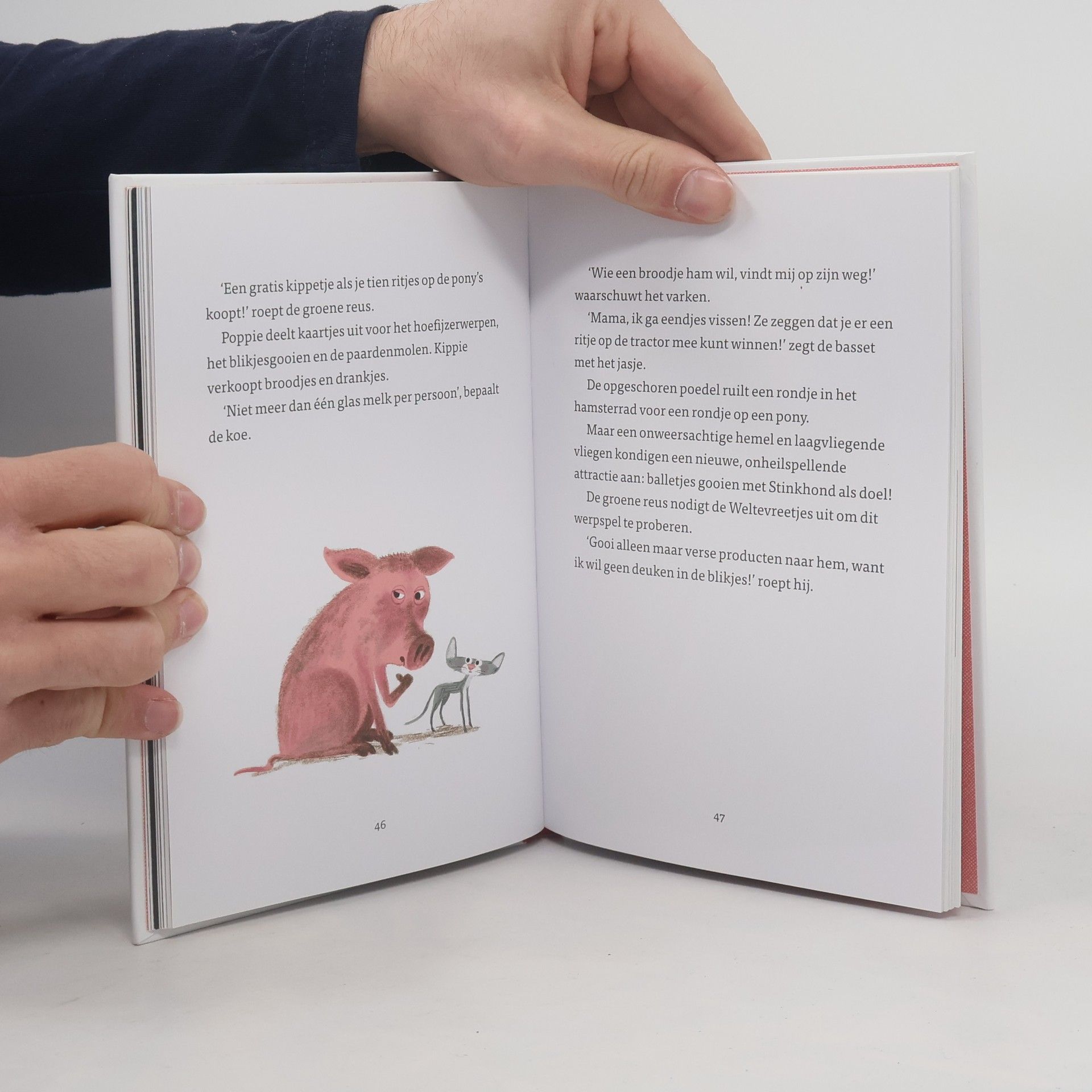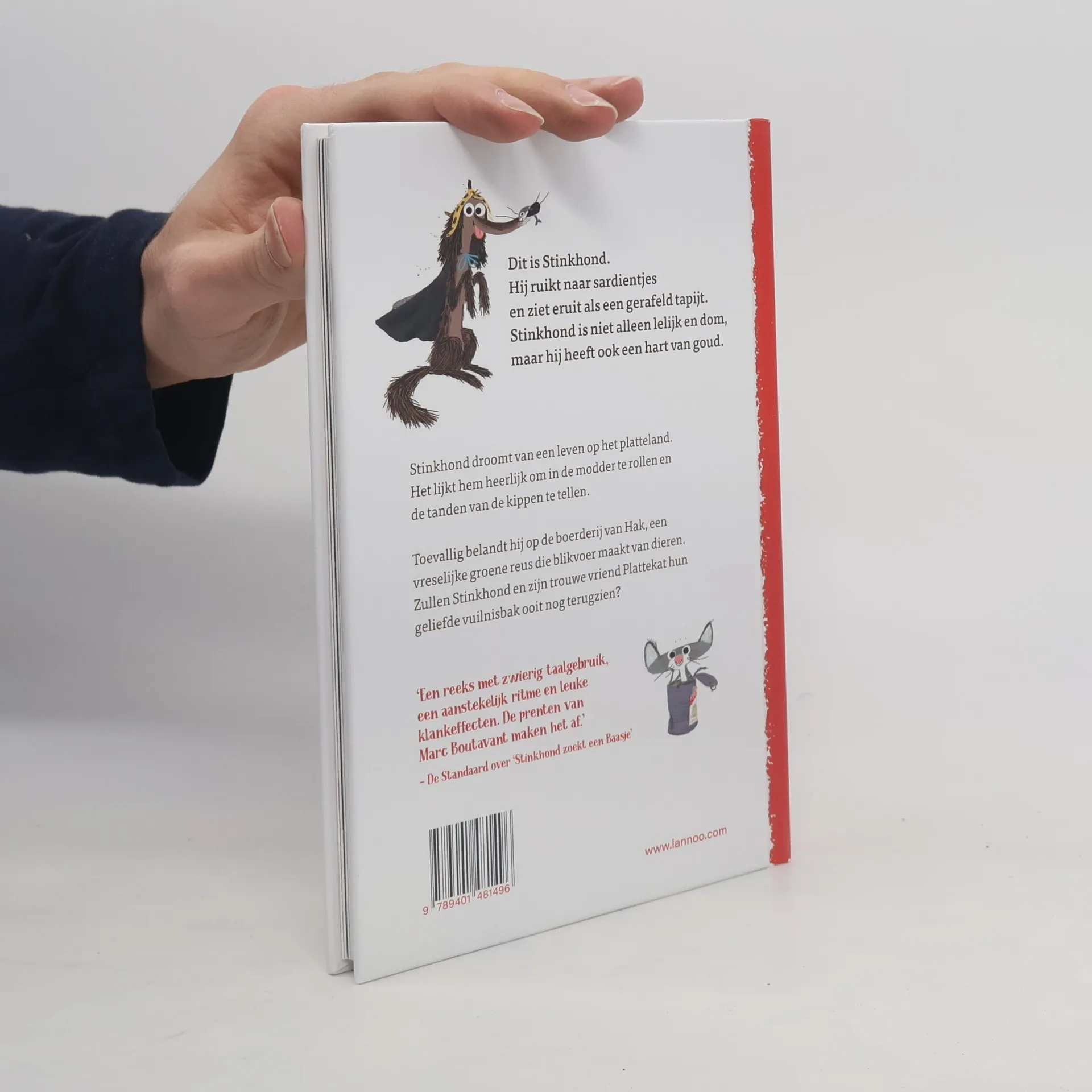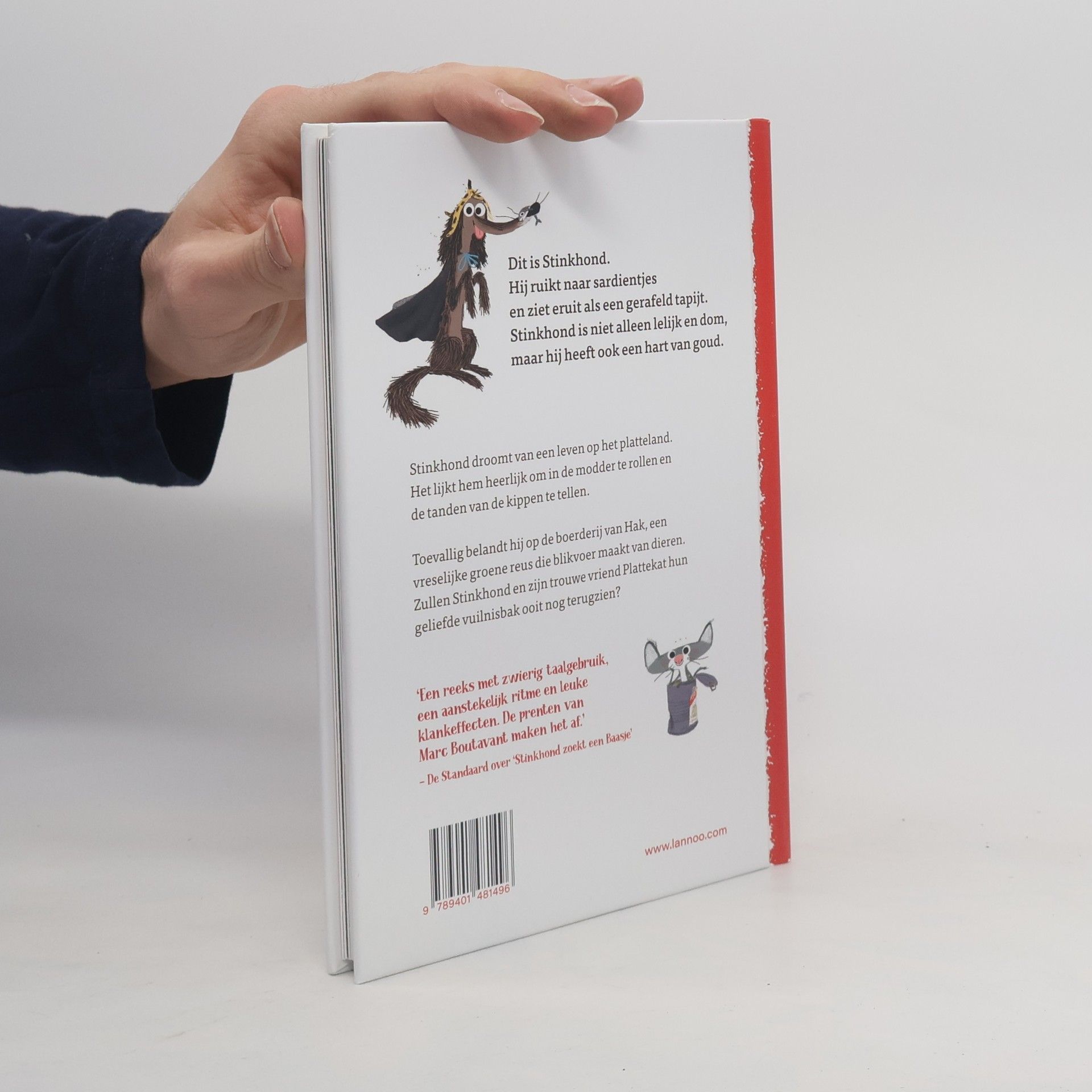 Dit is Stinkhond.Hij ruikt naar sardientjesen ziet eruit als een gerafeld tapijt.Stinkhond is niet alleen lelijk en dom,maar hij heeft ook een hart van goud.Stinkhond droomt van een leven op het platteland. Het lijkt met heerlijk om in de modder te rollen en de tanden van de kippen te tellen. Toevallig belandt hij op de boederij van Hak, een vreselijke groene reus die blikvoer maakt van dieren. Zullen Stinkhond en zijn trouwe vriend Plattekat hun geliefde vuilnisbak ooit nog terugzien?