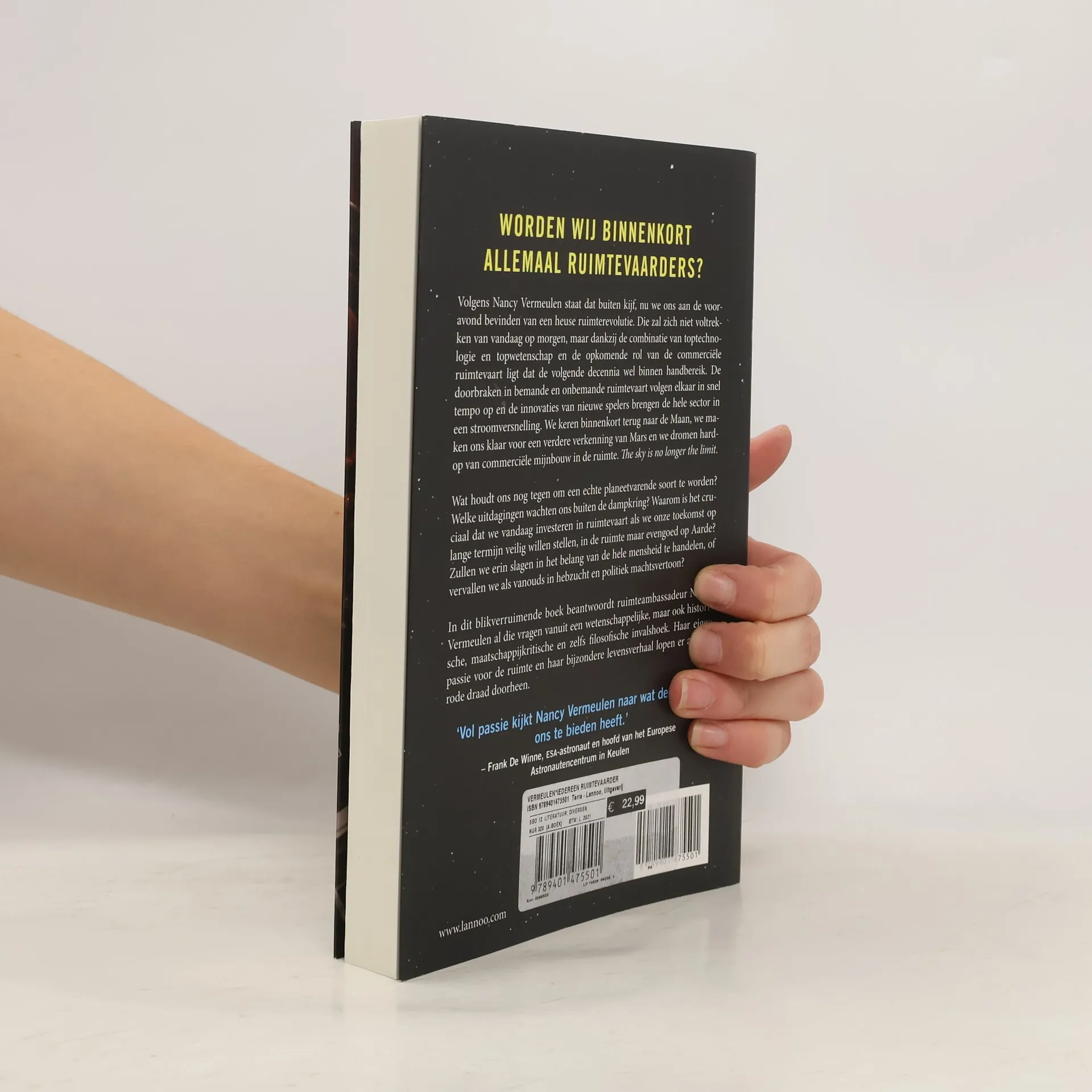 Levensverhaal van kandidaat astronaut Nancy Vermeulen, aangevuld met wat de ruimtevaart ons tot nu toe heeft opgeleverd en de uitdagingen die ons wachten op financieel, technologisch en medisch gebied.