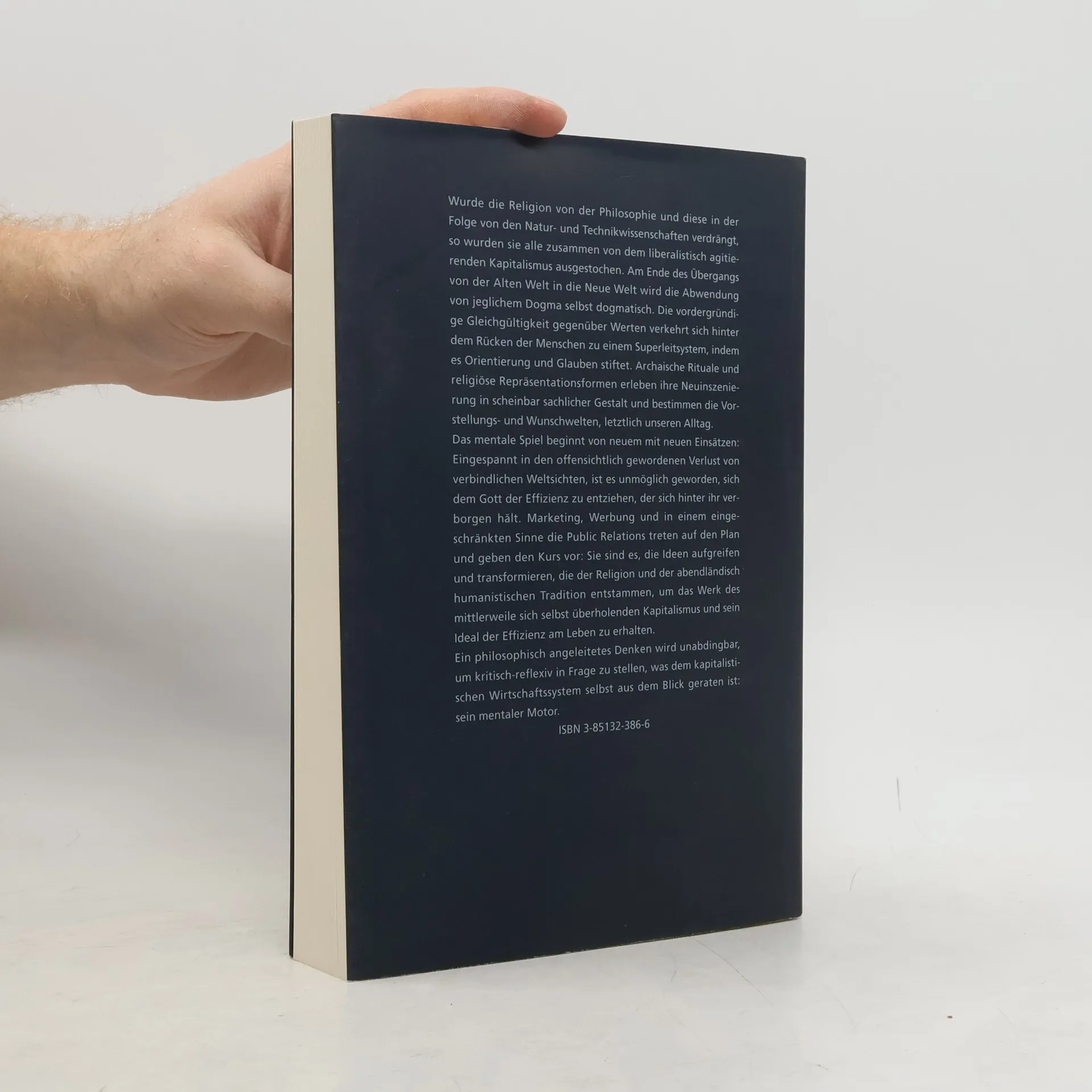 Wurde die Religion von der Philosophie und diese in der Folge von den Natur- und Technikwissenschaften verdrängt, so wurden sie alle zusammen von dem liberalistisch agitierenden Kapitalismus ausgestochen. Am Ende des Übergangs von der Alten Welt in die Neue Welt wird die Abwendung von jeglichem Dogma selbst dogmatisch. Die vordergründige Gleichgültigkeit gegenüber Werten verkehrt sich hinter dem Rücken der Menschen zu einem Superleitsystem, indem es Orientierung und Glauben stiftet. Archaische Rituale und religiöse Repräsentationsformen erleben ihre Neuinszenierung in scheinbar sachlicher Gestalt und bestimmen die Vorstellungs- und Wunschwelten, letztlich unseren Alltag. Das mentale Spiel beginnt von neuem mit neuen Einsätzen: Eingespannt in den offensichtlich gewordenen Verlust von verbindlichen Weltsichten, ist es unmöglich geworden, sich dem Gott der Effizienz zu entziehen, der sich hinter ihr verborgen hält. Marketing, Werbung und in einem eingeschränkten Sinne die Public Relations treten auf den Plan und geben den Kurs vor: Sie sind es, die Ideen aufgreifen und transformieren, die der Religion und der abendländisch humanistischen Tradition entstammen, um das Werk des mittlerweile sich selbst überholenden Kapitalismus und sein Ideal der Effizienz am Leben zu erhalten. Ein philosophisch angeleitetes Denken wird unabdingbar, um kritisch-reflexiv in Frage zu stellen, was dem kapitalistischen Wirtschaftssystem selbst aus dem Blick geraten ist: sein mentaler Motor.