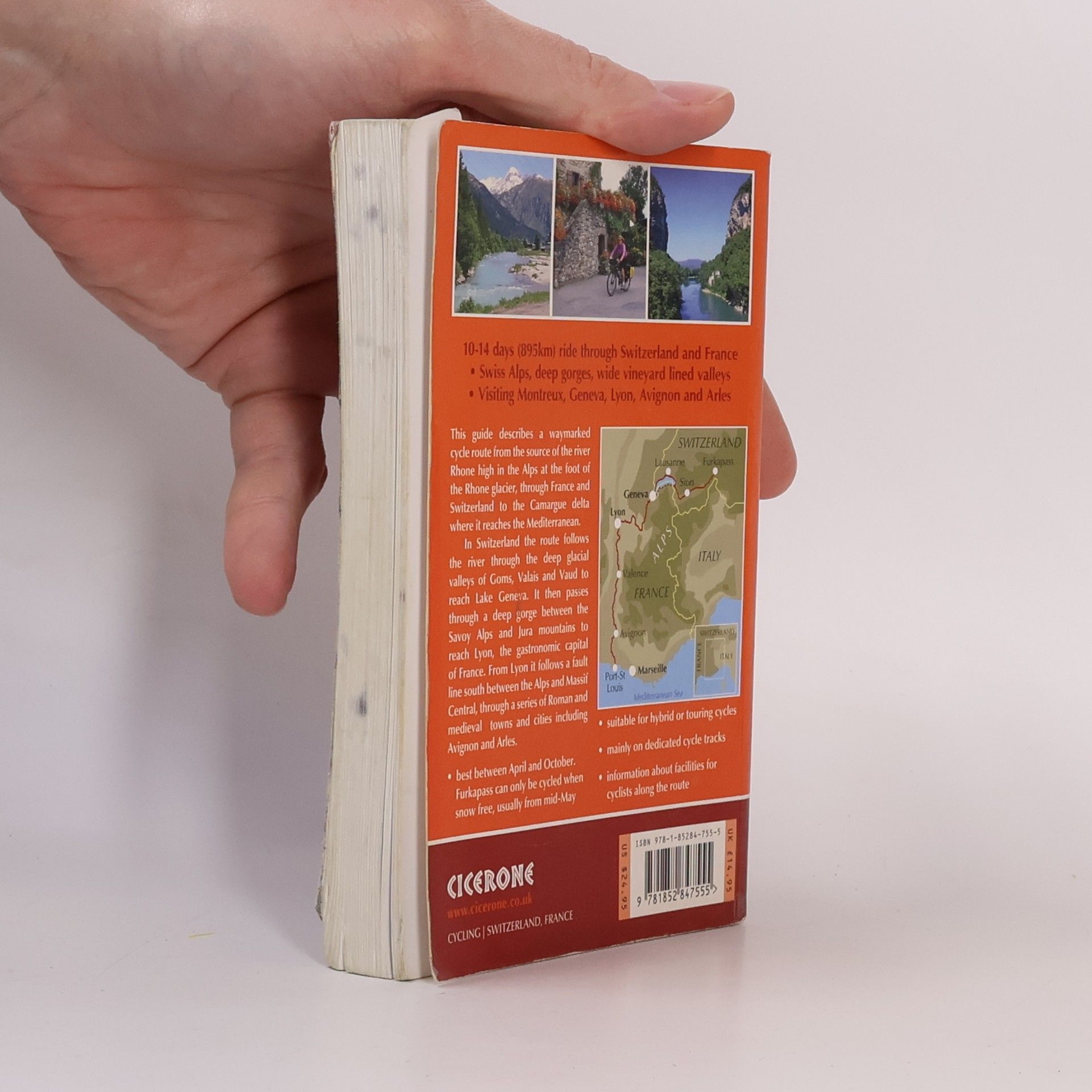 Guide to The River Rhone Cycle Route, an 895km bicycle ride starting high in the Alps of central Switzerland and finishing at the Mediterranean Sea, near Marseille. The route - which is mostly downhill - is divided into 20 stages (averaging 45km per stage) and can be completed by most cyclists in 12-14 days. The described route uses two waymarked national cycle trails: the Swiss R1 Rhone Route and the French ViaRhôna, which together have been adopted by the ECF (European Cyclists' Federation) as EuroVélo route EV17. The guide provides detailed route descriptions and 1:150,000 mapping for each stage, together with plenty of practical advice such as preparing for the journey, transport options there and back, what to take, accommodation en route and more. A Swiss/French glossary is also included. Taking in dramatic mountain vistas, Lake Geneva's enchanting beauty and the coastal delights of southern France, the route showcases some of the region's most spectacular scenery, making it a veritable gem for any tour cyclist looking to stretch their legs in stunning surrounds. If a visual feast is not enough, cyclists can indulge in the gastronomic wonders of the region. And need we mention the fact that the Rhone flows through some of the greatest wine producing regions of both Switzerland and France?