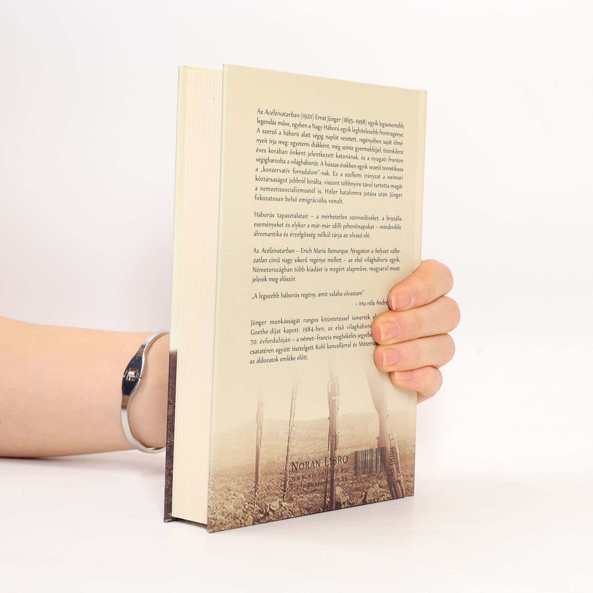 Az Acélzivatarban (1920) Ernst Jünger (1895-1998) egyik legismertebb, legendás műve, egyben a Nagy Háború egyik leghitelesebb frontregénye. A szerző a háború alatt végig naplót vezetett, regényében saját élményeit írja meg: egyetemi diákként, még szinte gyermekfejjel, tizenkilenc éves korában önként jelentkezett katonának, és a nyugati fronton végigharcolta a világháborút. A húszas években egyik vezető teoretikusa a „konzervatív forradalom”-nak. Ez a szellemi irányzat a weimari köztársaságot jobbról bírálta, viszont többnyire távol tartotta magát a nemzeti szocializmustól is. Hitler hatalomra jutása után Jünger fokozatosan belső emigrációba vonult. Háborús tapasztalatait – a mérhetetlen szenvedéseket, a brutális eseményeket és olykor a már-már idilli pihenőnapokat – mindenféle álromantika és érzelgősség nélkül tárja az olvasó elé. Az Acélzivatarban – Erich Maria Remarque Nyugaton a helyzet változatlan című nagy sikerű regénye mellett – az első világháború egyik, Németországban több kiadást is megért alapműve, magyarul most jelenik meg először. „A legszebb háborús regény, amit valaha olvastam” -írta róla André Gide. Jünger munkásságát rangos kitüntetéssel ismerték el, 1982-ben Goethe-díjat kapott, 1984-ben, az első világháború kitörésének 70. évfordulóján – a német-francia megbékélés jegyében – a verduni csatatéren együtt tisztelgett Kohl kancellárral és Mitterrand elnökkel az áldozatok emléke előtt.