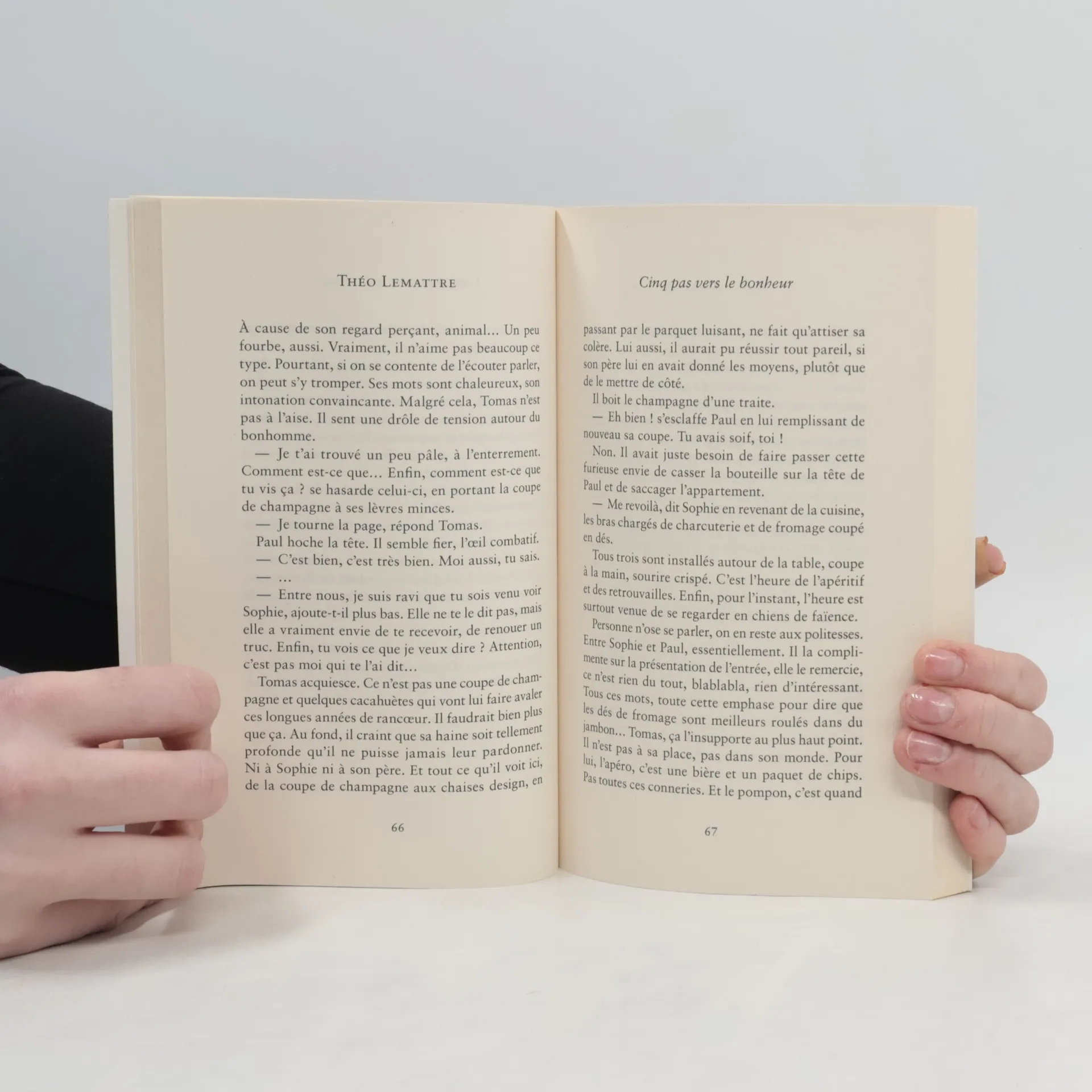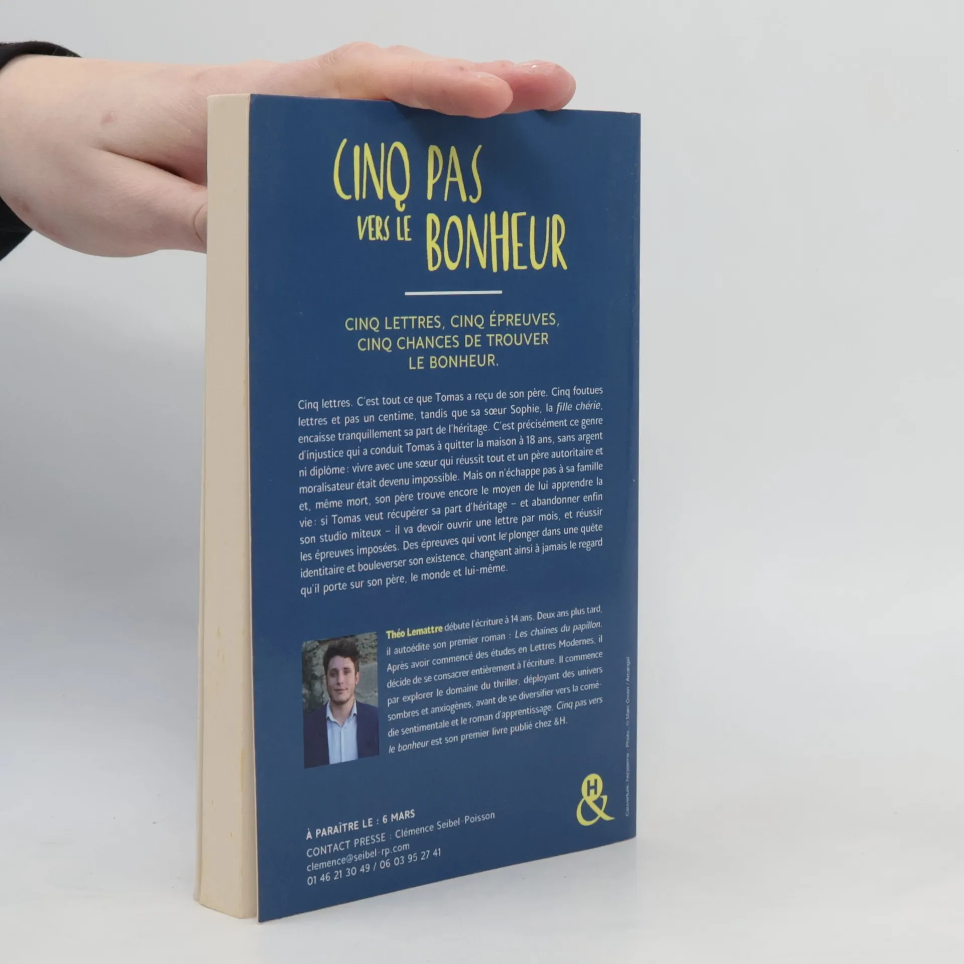 Cinq lettres, cinq épreuves, cinq chances de trouver le bonheur. Cinq lettres. C'est tout ce que Tomas a reçu de son père. Cinq foutues lettres et pas un centime, tandis que sa soeur Sophie, la fille chérie, encaisse tranquillement sa part de l'héritage. C'est précisément ce genre d'injustice qui a conduit Tomas à quitter la maison à 18 ans, sans argent ni diplôme : vivre avec une soeur qui réussit tout et un père autoritaire et moralisateur était devenu impossible. Mais on n'échappe pas à sa famille et, même mort, son père trouve encore le moyen de lui apprendre la vie : si Tomas veut récupérer sa part d'héritage - et abandonner enfin son studio miteux - il va devoir ouvrir une lettre par mois, et réussir les épreuves imposées. Des épreuves qui vont le plonger dans une quête identitaire et bouleverser son existence, changeant ainsi à jamais le regard qu'il porte sur son père, le monde et lui-même. A propos de l'auteur Théo Lemattre débute l'écriture à 14 ans. Deux ans plus tard, il autoédite son premier roman : Les chaînes du papillon. Après avoir commencé des études en Lettres Modernes, il décide de se consacrer entièrement à l'écriture. Il commence par explorer le domaine du thriller, déployant des univers sombres et anxiogènes, avant de se diversifier vers la comédie sentimentale et le roman d'apprentissage. Cinq pas vers le bonheur est son premier livre publié chez &H.