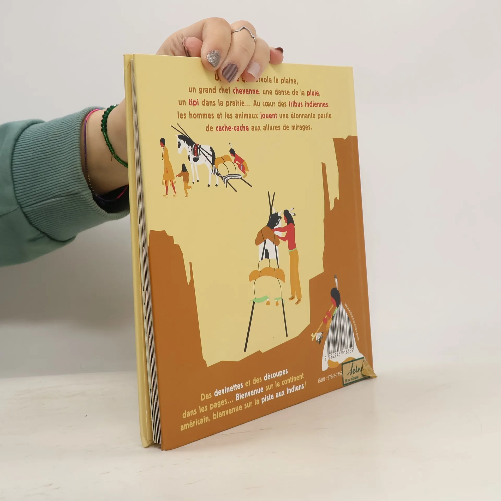 Un aigle qui survole la plaine, un grand chef cheyenne, une danse de la pluie, un tipi dans la prairie... Au cœur des tribus indiennes, les hommes et les animaux jouent une étonnante partie de cache-cache aux allures de mirages. Des devinettes et des découpes dans les pages... Bienvenue sur le continent américain, bienvenue sur la piste des Indiens !