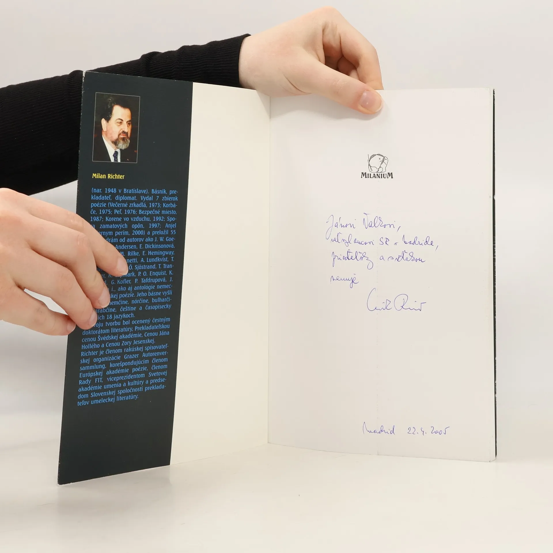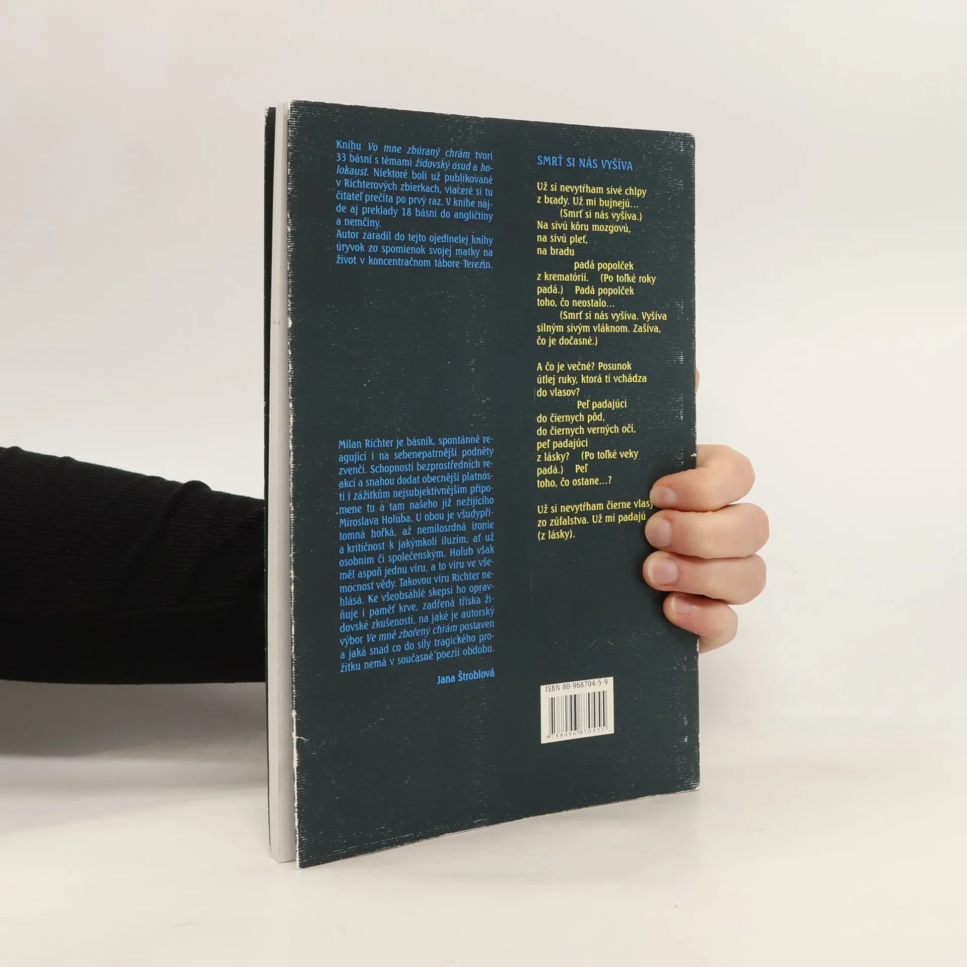 33 básní v slovenčine a 18 básni v nemeckom alebo anglickom preklade spájajú témy židovský osud a holokaust. Ako v predslove píše popredná česká poetka Jana Štroblová, „Richter je básník, spontánně reagující i na sebenepatrnější podněty zvenčí. Schopností bezprostředních reakcí asnahou dodat obecnější platnosti i zážitkům nejsubjektivnějším pripomene tu a tam našeho již nežijícího Miroslava Holuba. U obou je všudepřítomná hořká, až nemilosrdná ironie a kritičnost k jakýmkoli iluzím, ať už osobním či společenským. Holub však měl aspoň jednu víru, a to víru ve všemocnost vědy. Takovou víru Richter nehlásá. Ke všeobsáhlé skepsi ho opravňuje i paměť krve, zadřená tříska židovské zkušenosti (...), jaká snad co do síly tragického prožitku nemá v současné poezii obdobu.“