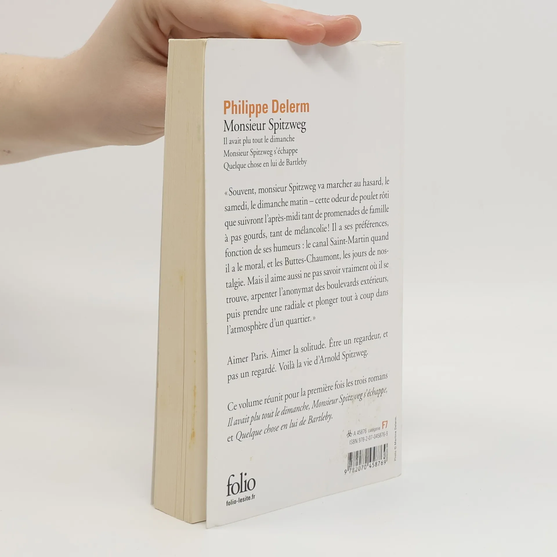«Souvent, monsieur Spitzweg va marcher au hasard, le samedi, le dimanche matin cette odeur de poulet rôti que suivront l’apres-midi tant de promenades de famille a pas gourds, tant de mélancolie! Il a ses préférences, fonction de ses humeurs : le canal Saint-Martin quand il a le moral, et les Buttes- Chaumont, les jours de nostalgie. Mais il aime aussi ne pas savoir vraiment ou il se trouve, arpenter l'anonymat des boulevards extérieurs, puis prendre une radiale et plonger tout a coup dans l’atmosphere d’un quartier.» Aimer Paris. Aimer la solitude. Etre un regardeur, et pas un regardé. Voila la vie d’Arnold Spitzweg.