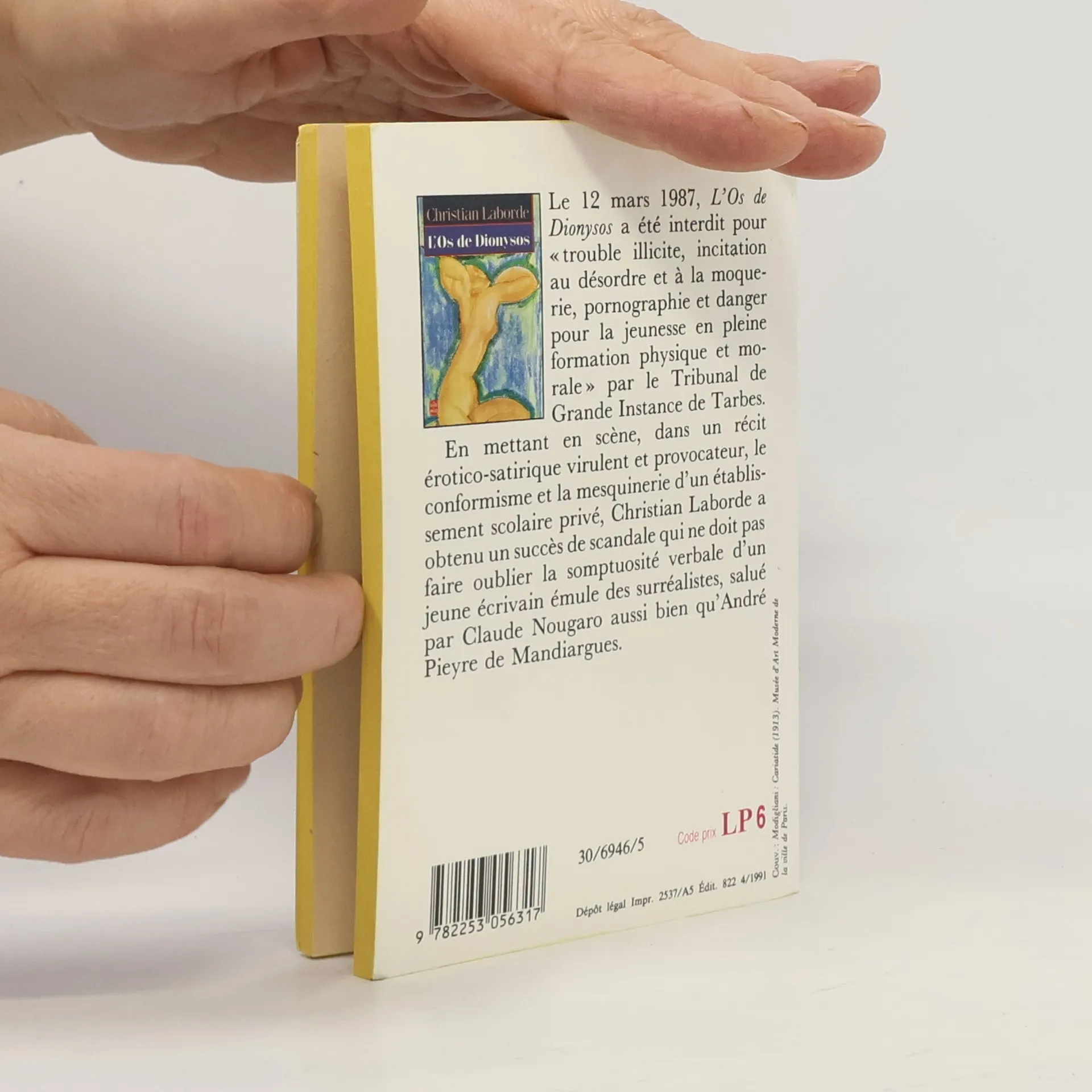 "Le 12 mars 1987, L'Os de Dionysos a été interdit pour " trouble illicite, incitation au désordre et à la moquerie, pornographie et danger pour la jeunesse en pleine formation physique et morale " par le Tribunal de Grande Instance de Tarbes.En mettant en scène, dans un récit érotico-satirique virulent et provocateur, le conformisme et la mesquinerie d'un établissement scolaire privé, Christian Laborde a obtenu un succès de scandale qui ne doit pas faire oublier la somptuosité verbale d'un jeune écrivain émule des surréalistes, salué par Claude Nougaro aussi bien qu'André Pieyre de Mandiargues."