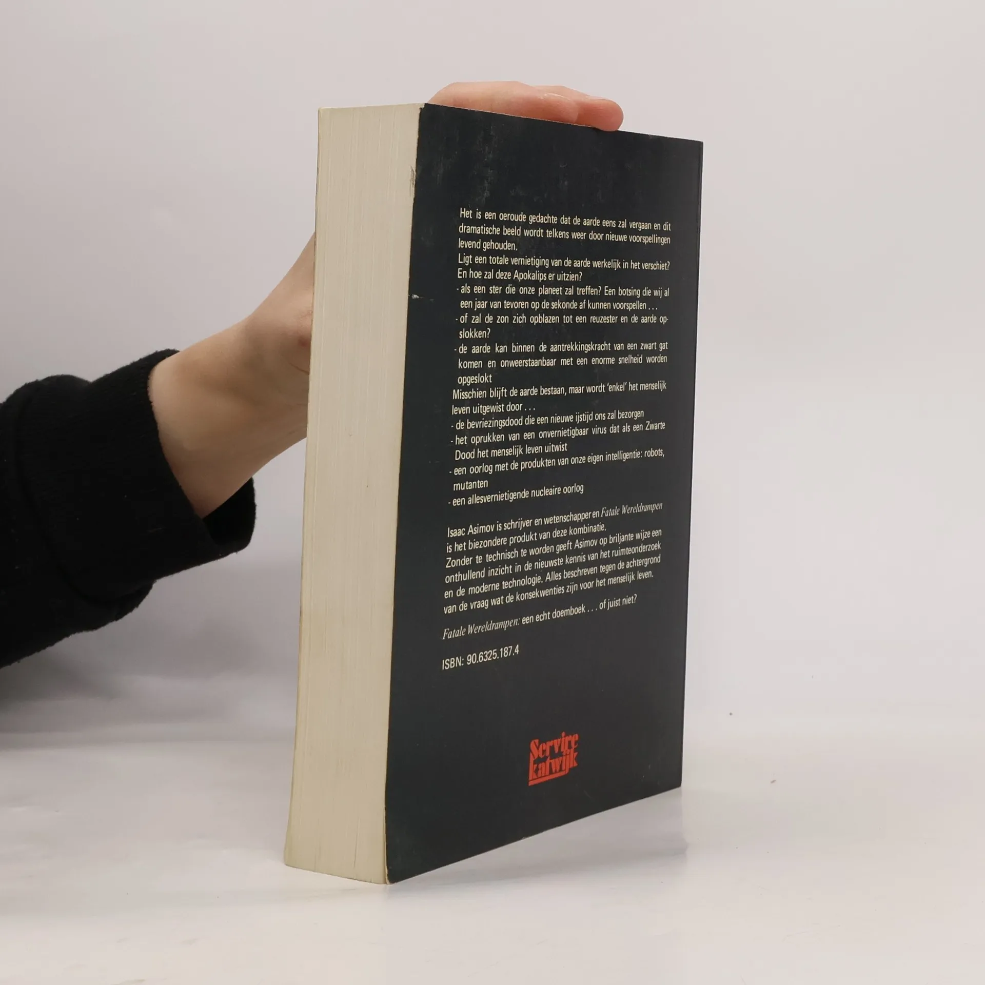 Het is een oeroude gedachte dat de aarde eens zal vergaan en dit dramatische beeld wordt telkens weer door nieuwe voorspellingen levend gehouden. Ligt een totale vernietiging van de aarde werkelijk in het verschiet? En hoe zal deze Apocalips er uitzien? -als een ster die onze planeet zal treffen? Een botsing die wij al een jaar van tevoren op de sekonde af kunnen voorspellen . . . - of zal de zon zich opblazen tot een reuzester en de aarde opslokken? - de aarde kan binnen de aantrekkingskracht van een zwart gat komen en onweerstaanbaar met een enorme snelheid worden opgeslokt Misschien blijft de aarde bestaan, maar wordt 'enkel' het menselijk leven uitgewist door. . . - de bevriezingsdood die een nieuwe ijstijd ons zal bezorgen - het oprukken van een onvernietigbaar virus dat als een Zwarte Dood het menselijk leven uitwist - een oorlog met de produkten van onze eigen intelligentie: robots, mutanten - een allesvernietigende nucleaire oorlog Isaac Asimov is schrijver en wetenschapper en Fatale Wereldrampen is het biezondere product van deze combinatie. Zonder te technisch te worden geeft Asimov op briljante wijze een onthullend inzicht in de nieuwste kennis van het ruimteonderzoek en de moderne technologie. Alles beschreven tegen de achtergrond van de vraag wat de consequenties zijn voor het menselijk leven. Fatale Wereldrampen: een echt doemboek ... of juist niet?