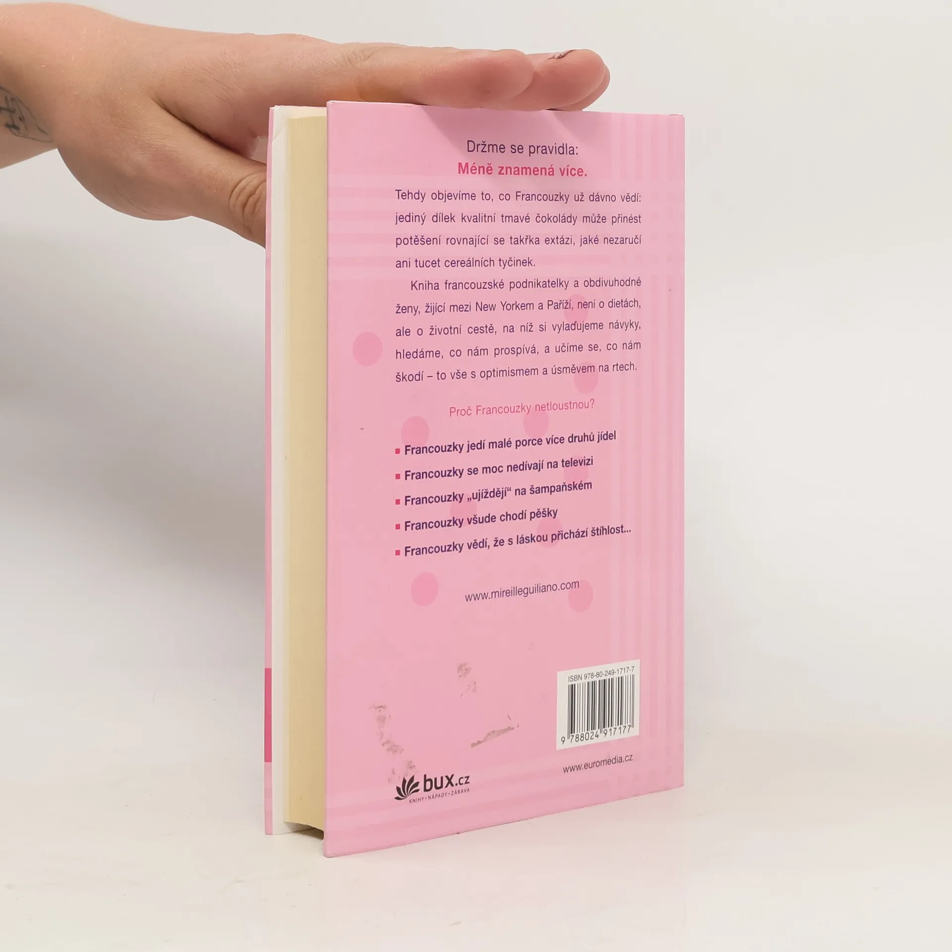 Autorka radí ženám, jak si, podle francouzského vzoru, upravit životosprávu a stravovací návyky a po celý život si udržet ideální hmotnost. Trik spočívá v tom, že nikdy nesmíte hladovět, naopak ke každému jídlu si dopřát několik chodů, ale pouze v malém množství. Občas si můžete dát i kousek svého oblíbeného vysoce kalorického jídla, ale musíte to v brzké době vykompenzovat větší zdrženlivostí. Cílovým pocitem má být uspokojení a radost z jídla, v žádném případě ne strádání. Stravovací návyky je třeba doplnit pitným režimem a pohybovou aktivitou (nikoli však týráním se v tělocvičnách). Dobrý dojem poněkud kalí poznání, že k dosažení uspokojivého výsledku musíte tento nový životní styl praktikovat už do konce života. Součástí textu jsou zajímavé recepty.