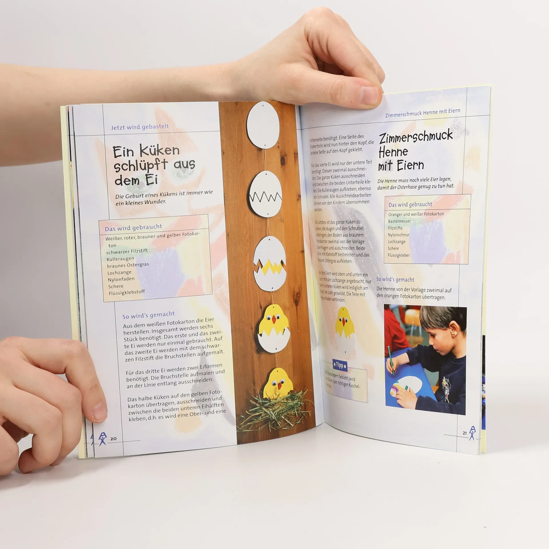 Aus verschiedenen kostengünstigen Materialien, die in jedem Haushalt zu finden sind, entstehen Fensterbilder und Mobiles, Tischschmuck oder kleine Spielsachen für Ostern, die bereits von Kindern ab 2 Jahren gebastelt werden können.