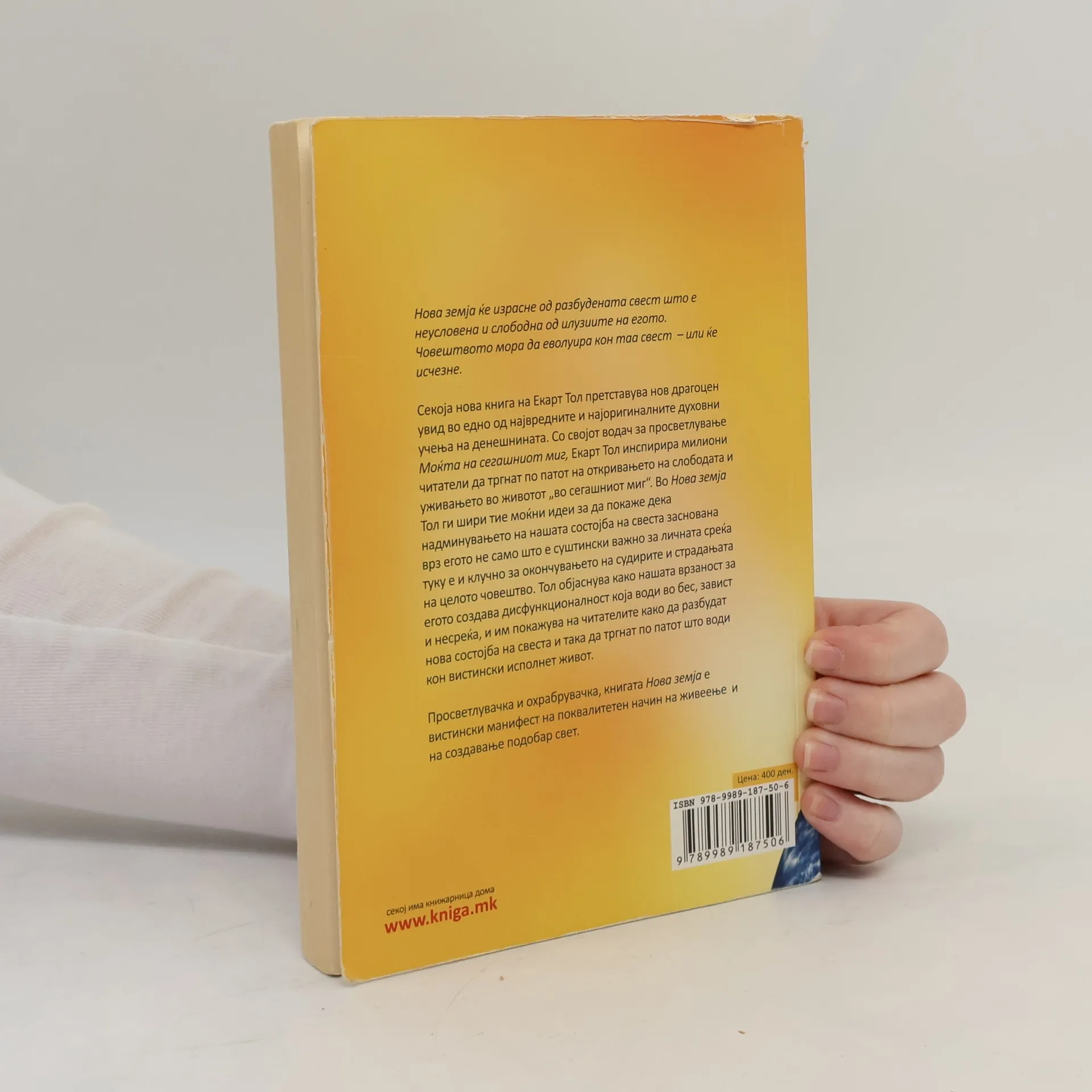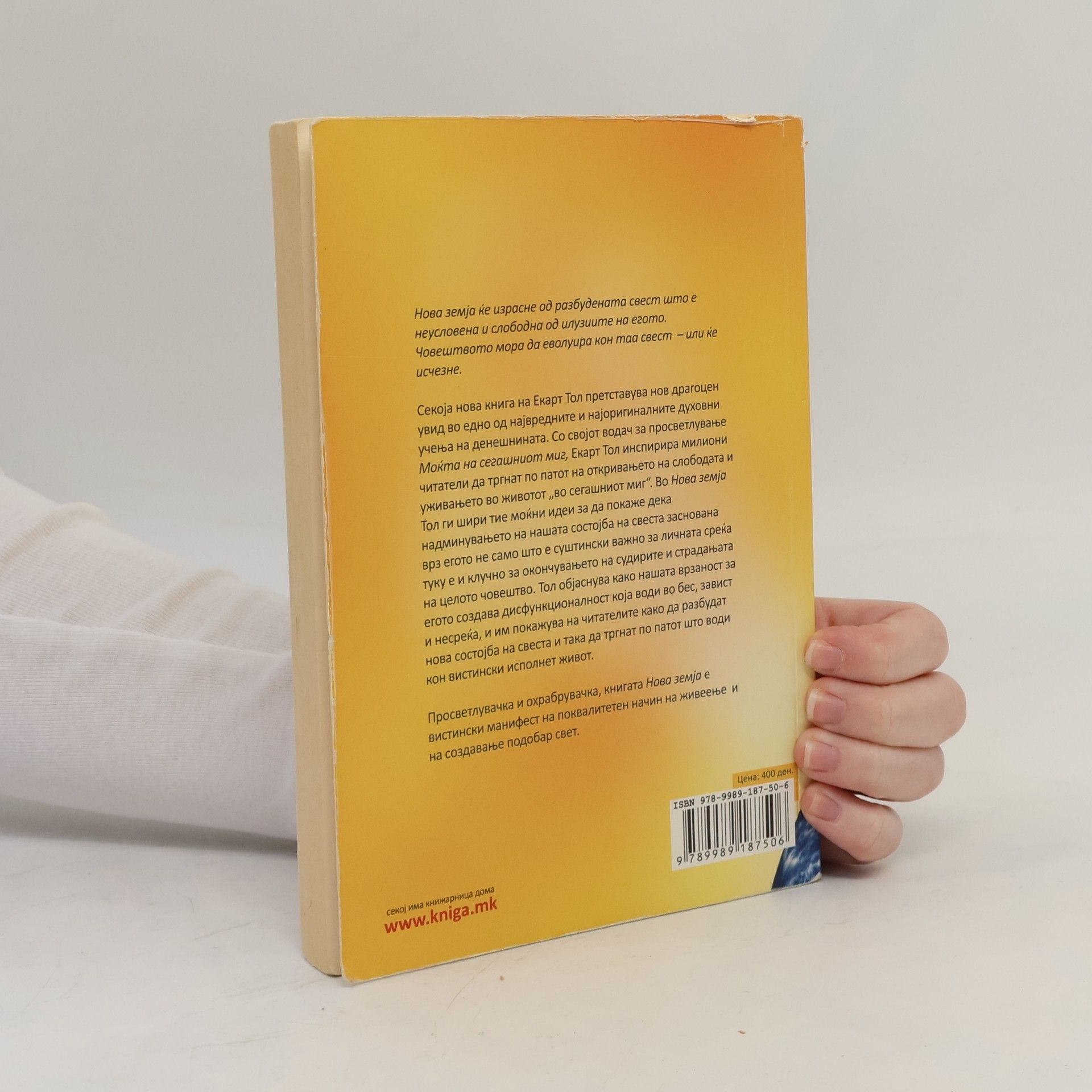 Со својот водач за просветлување Моќта на сегашниот миг, Екарт Тол инспирирал милиони читатели да тргнат по патот на откривањето на слободата и уживањето во животот во сегашниот миг. Во Нова земја Тол ги шири тие моќни идеи за да покаже дека надминувањето на нашата состојба на свеста заснована врз егото не само што е суштински важно за личната среќа туку е и клучно за окончувањето на судирите и страдањата на целото човештво. Тол објаснува како нашата врзаност за егото создава дисфункционалност која води во бес, завист и несреќа, и им покажува на читателите како да пробудат нова состојба на свеста и така да тргнат по патот што води кон вистински исполнет живот. Просветлувачка и охрабрувачка, книгата Нова земја е вистински манифест на поквалитетниот начин на живеење и на создавањето на подобар свет. Екарт Тол е наш современик, духовен учител кој често патува пренесувајќи ја својата порака во сите краишта на светот. Нова земја е последната книга која Опра ја препорача во својот клуб на читатели (Oprah Book Club), нашироко прифатена од милиони читатели ширум светот.
