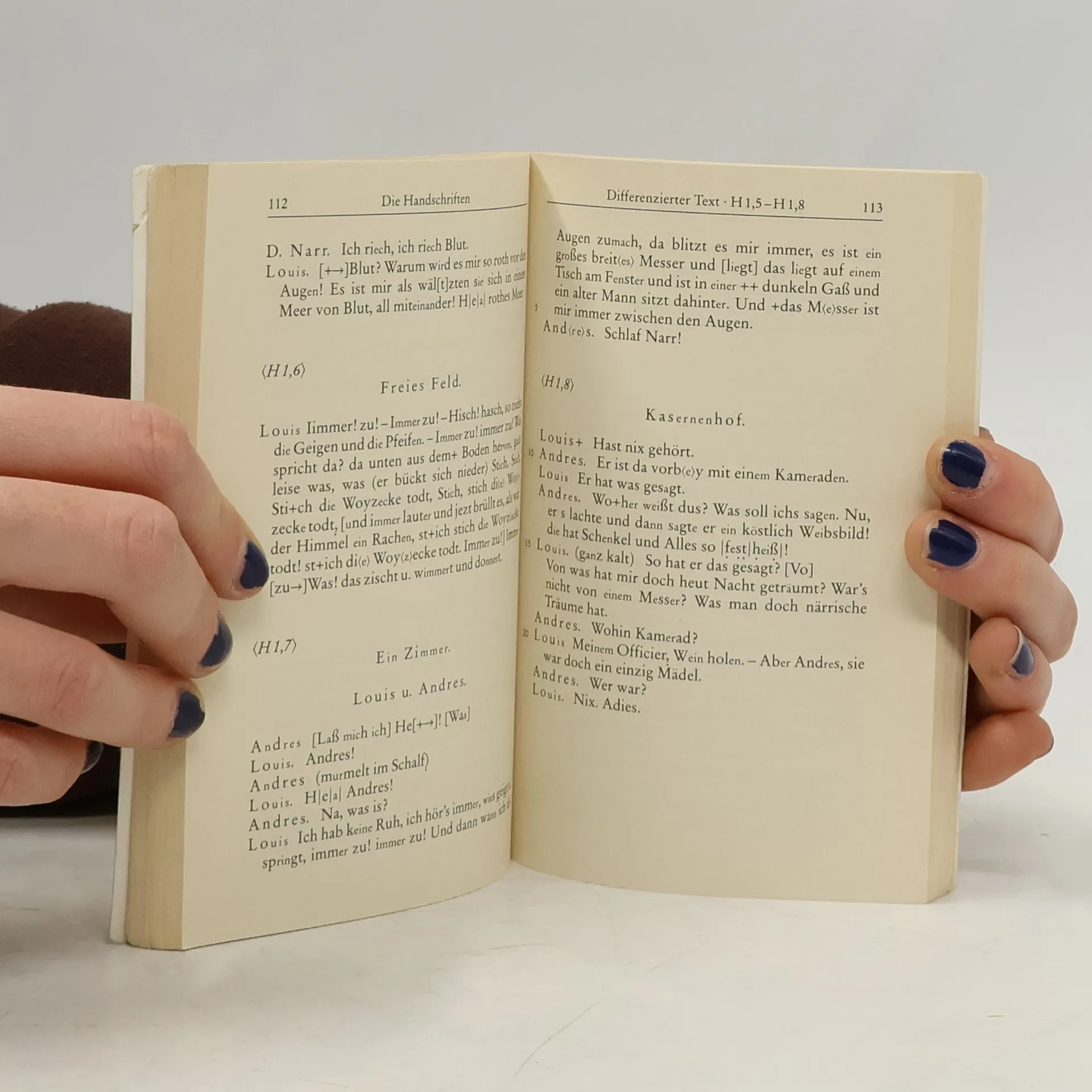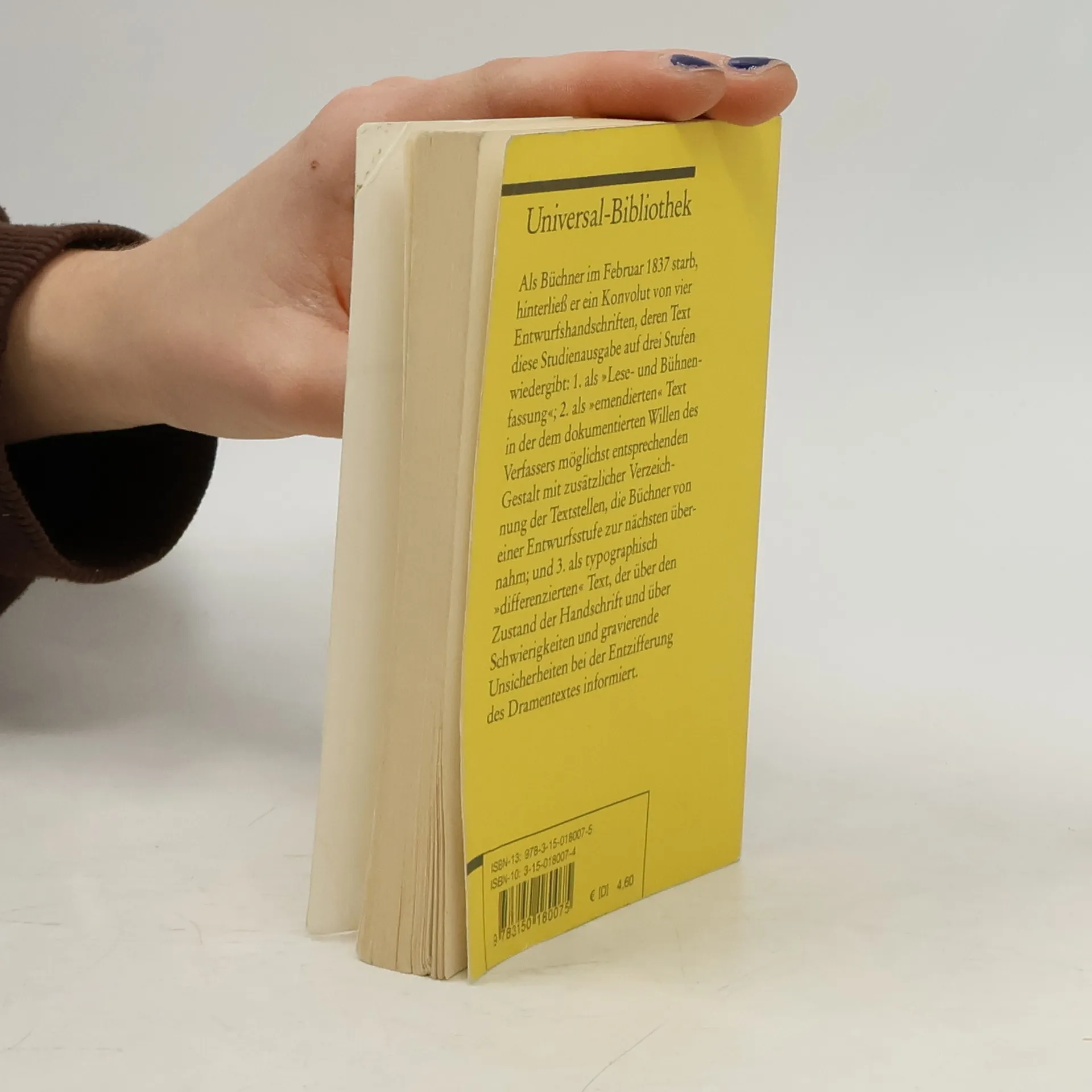 Als Büchner im Februar 1837 starb, hinterließ er ein Konvolut von vier Entwurfshandschriften, deren Text diese Studienausgabe auf drei Stufen wiedergibt: 1. als »Lese- und Bühnenfassung«; 2. als »emendierten« Text in der dem dokumentierten Willen des Verfassers möglichst entsprechenden Gestalt mit zusätzlicher Verzeichnung der Textstellen, die Büchner von einer Entwurfsstufe zur nächsten übernahm; und 3. als typographisch »differenzierten« Text, der über den Zustand der Handschrift und über Schwierigkeiten und gravierende Unsicherheiten bei der Entzifferung des Dramentextes informiert.