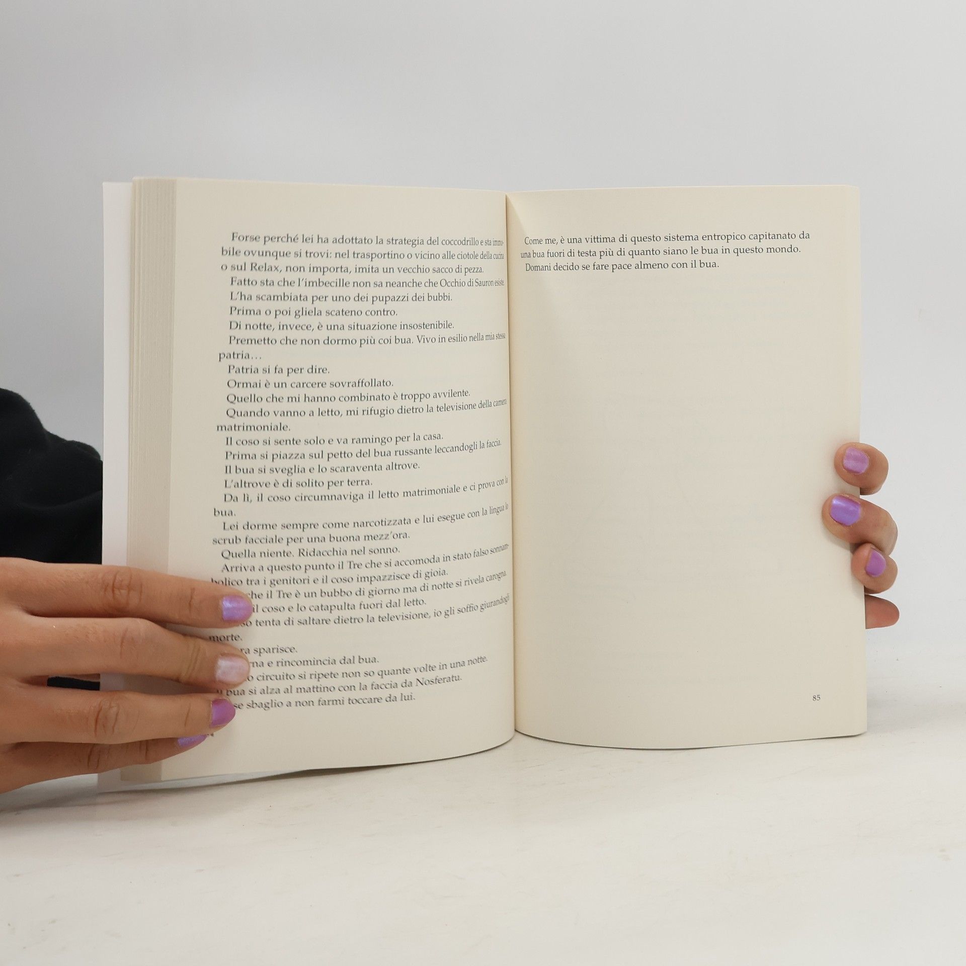 Molte persone credono che il proprio animale domestico le osservi. Ma quante, invece, sanno che il proprio gatto le sta giudicando e psicanalizzando? Luna, la protagonista di questo romanzo, è una Gatta di razza Scottish Fold che si ritrova catapultata dalla gabbia del negozio di animali a una gabbia piena di individui e oggetti dove deve sottostare alle regole folli di una famiglia. Oltre ai bambini, Luna dividerà il sovraffollatissimo appartamento con una Persiana affetta da vari problemi organici che soprannominerà Occhio di Sauron, fino all’arrivo di “coso”, un presunto British che sconvolgerà ancora di più i precari equilibri.