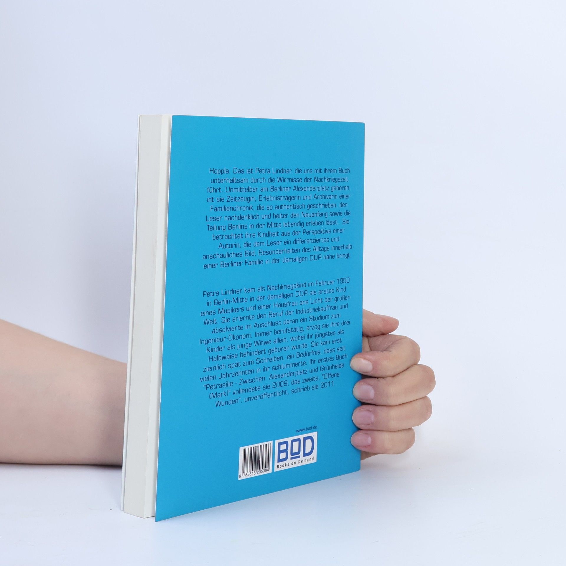 Hoppla. Das ist Petra Lindner, die uns mit ihrem Buch unterhaltsam durch die Wirrnisse der Nachkriegszeit führt. Unmittelbar am Berliner Alexanderplatz geboren, ist sie Zeitzeugin, Erlebnisträgerin und Archivarin einer Familienchronik, die so authentisch geschrieben, den Leser nachdenklich und heiter den Neuanfang sowie die Teilung Berlins in der Mitte lebendig erleben lässt. Sie betrachtet ihre Kindheit aus der Perspektive einer Autorin, die dem Leser ein differenziertes und anschauliches Bild, Besonderheiten des Alltags innerhalb einer Berliner Familie in der damaligen DDR nahe bringt.