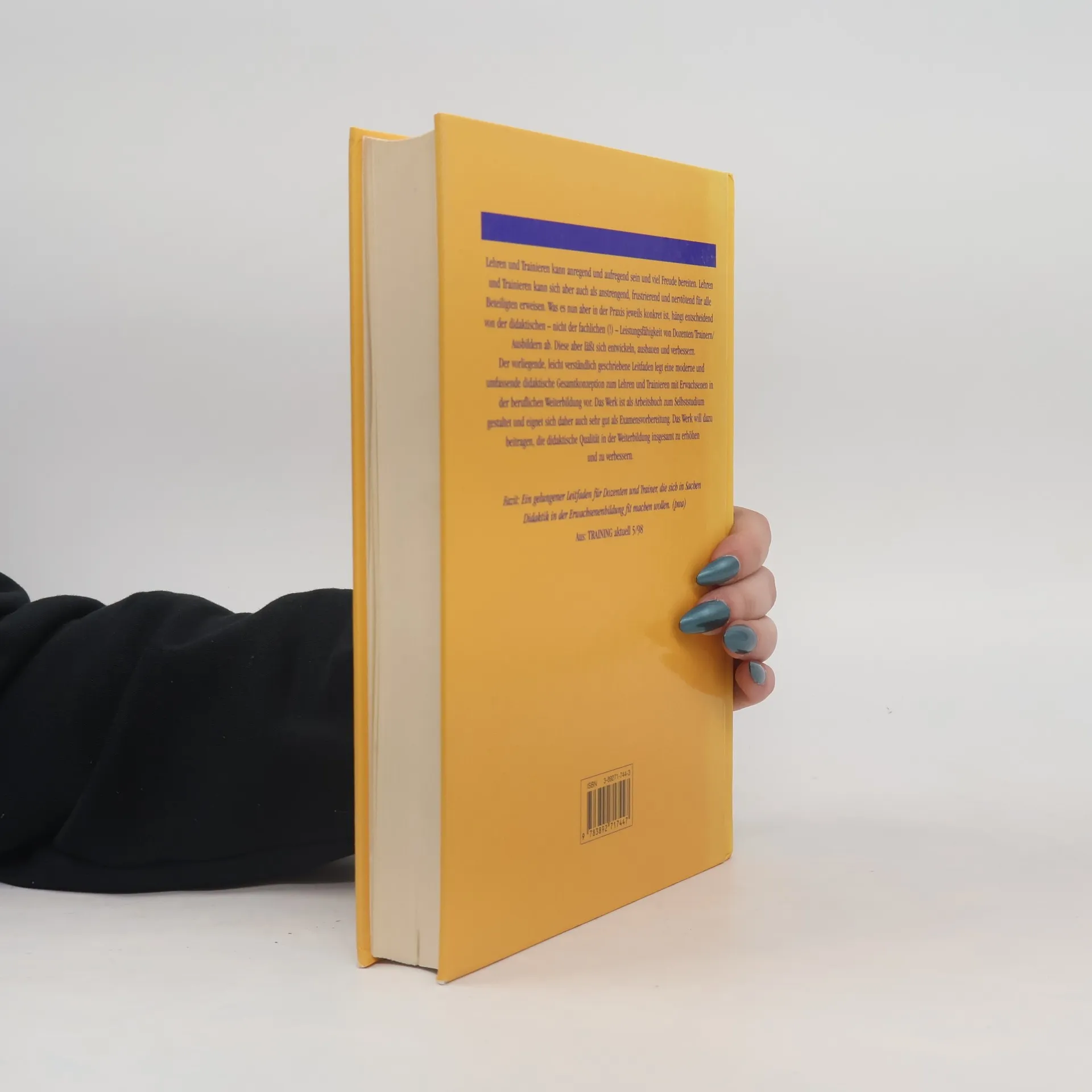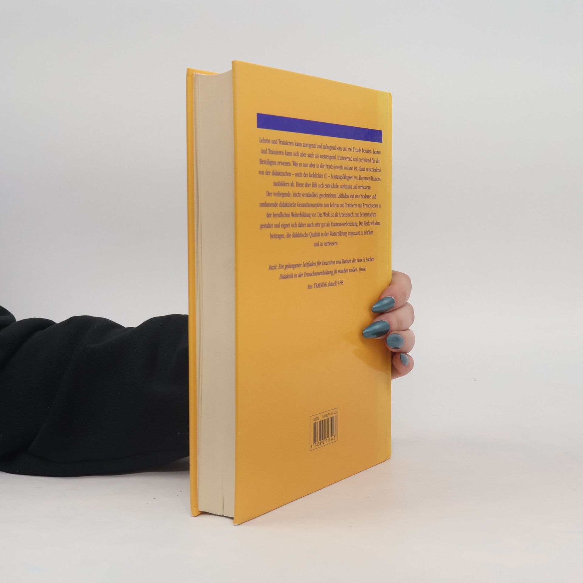 Immer mehr Fachspezialisten sind in der Weiterbildung als Dozenten/Trainer/Ausbilder tätig, ohne dafür speziell didaktisch ausgebildet zu sein. Der vorliegende, umfassende, aber leicht verständlich geschriebene Leitfaden soll helfen, die eigene Lehrfähigkeit zu entwickeln und auszubauen und die Freude am Lehren zu erhalten oder noch zu steigern. Lehren und Trainieren kann anregend und aufregend sein und viel Freude bereiten. Lehren und Trainieren kann sich aber auch als anstrengend, frustrierend und nervtötend für alle Beteiligten erweisen. Was es nun aber in der Praxis jeweils konkret ist, hängt entscheidend von der didaktischen - nicht der fachlichen(!) - Leistungsfähigkeit von Dozenten/Trainern/Ausbildern ab. Diese aber läßt sich entwickeln, ausbauen und verbessern. Der vorliegende, leicht verständlich geschriebene Leitfaden legt eine moderne und umfassende didaktische Gesamtkonzeption zum Lehren und Trainieren mit Erwachsenen in der beruflichen Weiterbildung vor. Das Werk ist als Arbeitsbuch zum Selbststudium gestaltet, eignet sich aber auch sehr gut als Examensvorbereitung. Das Werk will dazu beitragen, die didaktische Qualität in der Weiterbildung insgesamt zu erhöhen und zu verbessern.