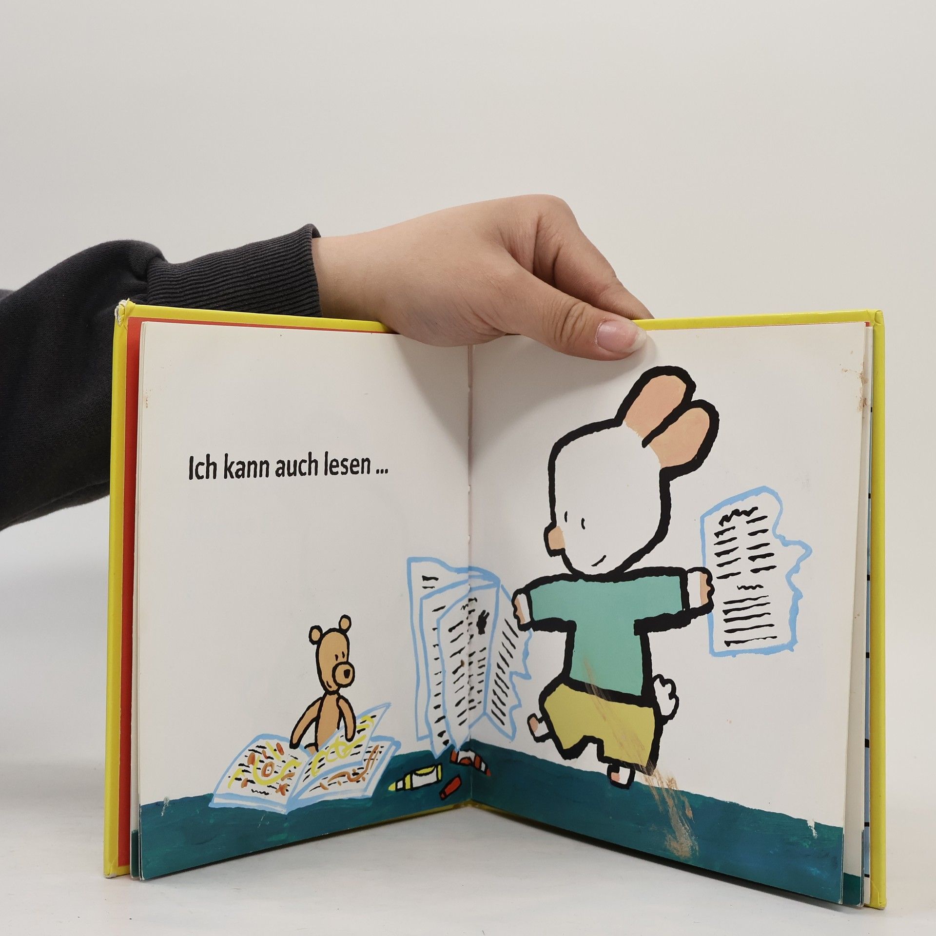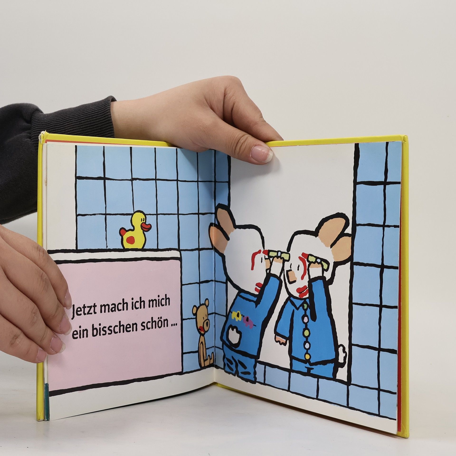 Im Eifer des Spiels spritzt Nino mit Wasser, verwendet die Blätter der Zimmerpflanze als Flügel und malt über das Malpapier hinaus ...