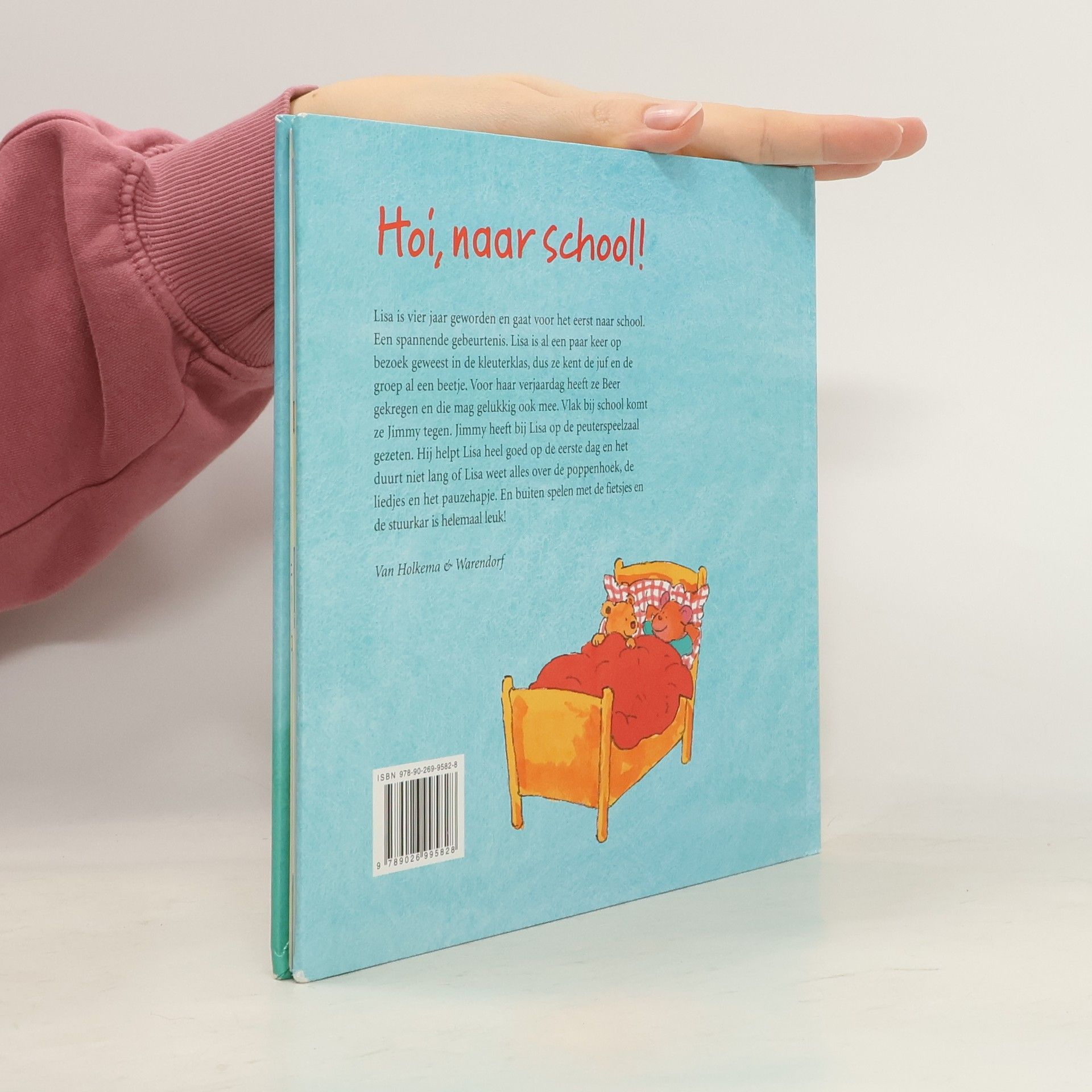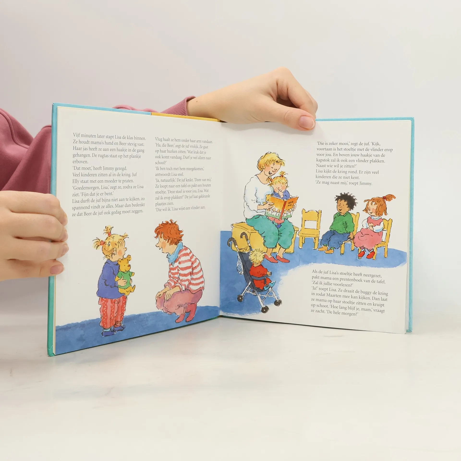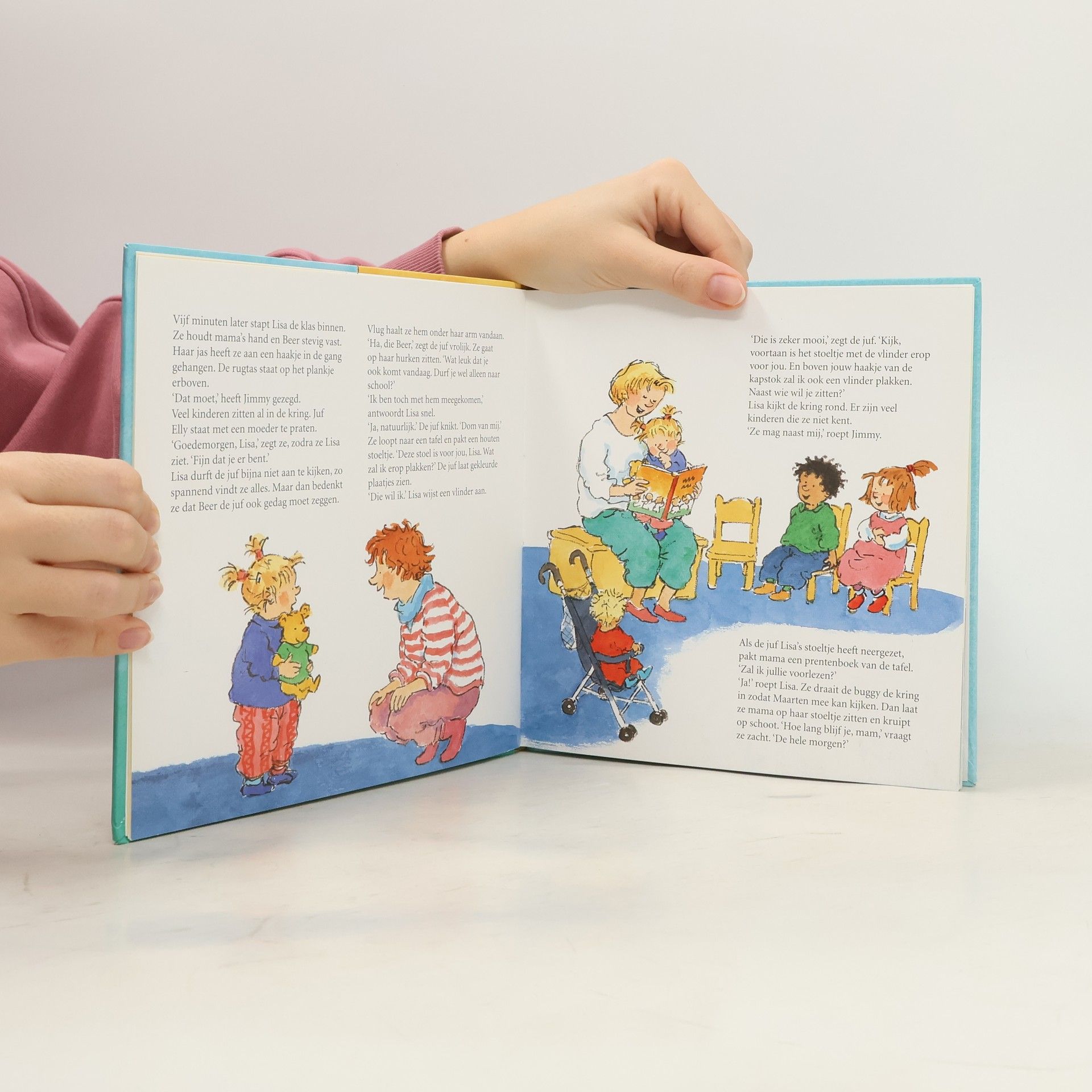 Lisa is vier jaar geworden en gaat voor het eerst naar school. Een spannende gebeurtenis. Lisa is al een paar keer op bezoek geweest in de kleuterklas, dus ze kent de juf en de groep al een beetje. Voor haar verjaardag heeft ze Beer gekregen en die mag gelukkig ook mee. Vlak bij school komt ze Jimmy tegen. Jimmy heeft bij Lisa op de peuterspeelzaal gezeten. Hij helpt Lisa heel goed op de eerste dag en het duurt niet lang of Lisa weet alles over de poppenhoek, de liedjes en het pauzehapje. En buiten spelen met de fietsjes en de stuurkar is helemaal leuk!