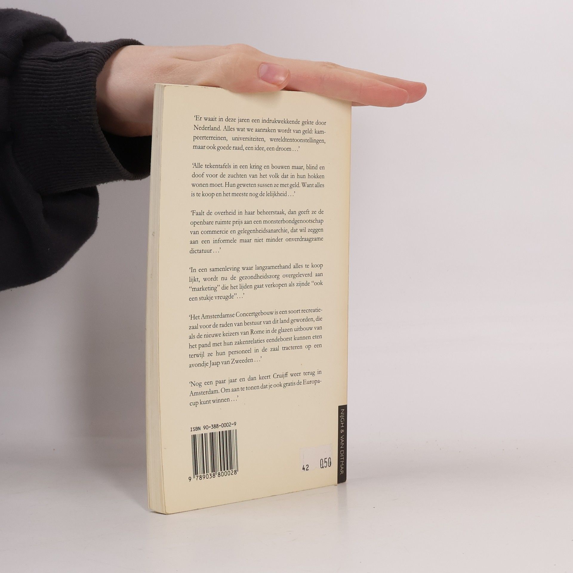 Kritische bijdragen over de gevolgen die het terugtreden van de overheid op diverse terreinen heeft gehad, en de wildgroei van het marketing- en managementdenken die daarvan het gevolg is geweest. De onderwerpen die aan de orde komen zijn het Nederlandse landschap (bijdrage van G. Mak), de architectuur (A. van Dis), de openbare ruimte (H.J.A. Hofland), de zorgsector (J. Jansen van Galen), de kunsten (R. Zwaap), en de sport (H. Smeets).