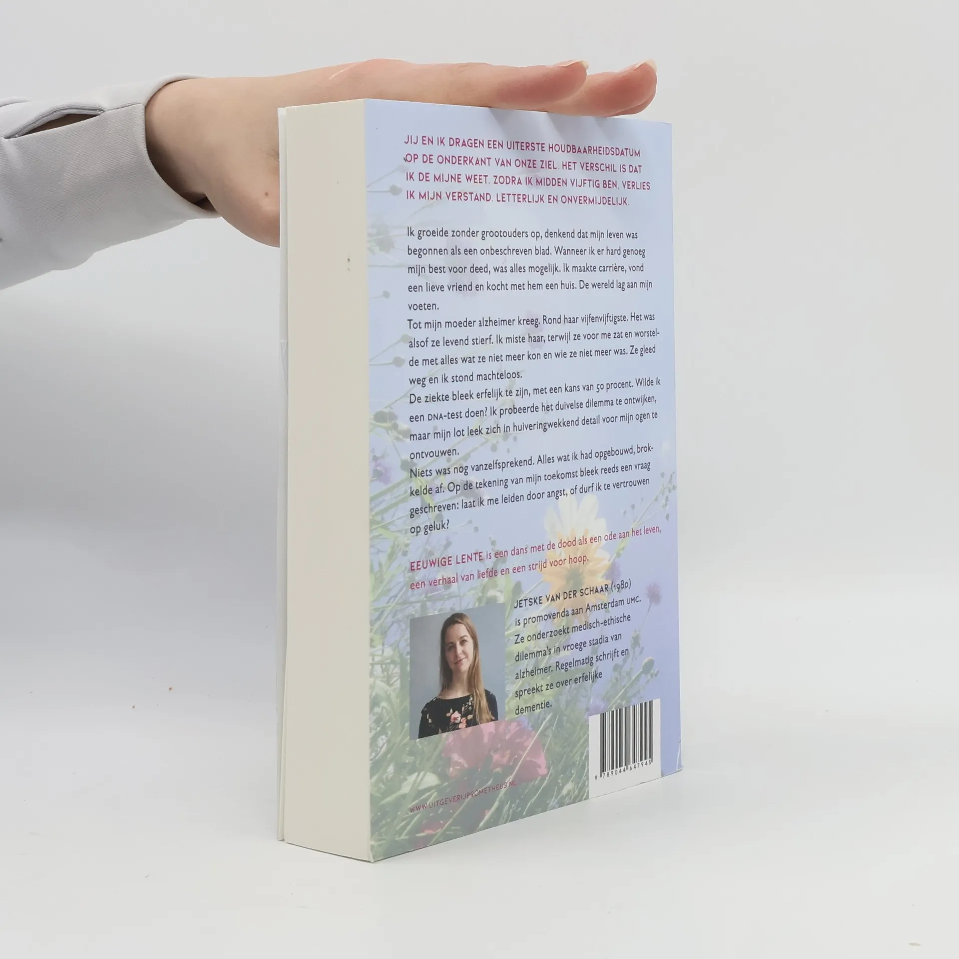 Jij en ik dragen een uiterste houdbaarheidsdatum op de onderkant van onze ziel. Het verschil is dat ik de mijne weet. Zodra ik midden vijftig ben, verlies ik mijn verstand. Letterlijk en onvermijdelijk.Ik groeide zonder grootouders op, denkend dat mijn leven was begonnen als een onbeschreven blad. Wanneer ik er hard genoeg mijn best voor deed, was alles mogelijk. Ik maakte carrière, vond een lieve vriend en kocht met hem een huis. De wereld lag aan mijn voeten.Tot mijn moeder alzheimer kreeg. Rond haar vijfenvijftigste. Het was alsof ze levend stierf. Ik miste haar, terwijl ze voor me zat en worstelde met alles wat ze niet meer kon en wie ze niet meer was. Ze gleed weg en ik stond machteloos.De ziekte bleek erfelijk te zijn, met een kans van 50 procent. Wilde ik een DNA-test doen? Ik probeerde het duivelse dilemma te ontwijken, maar mijn lot leek zich in huiveringwekkend detail voor mijn ogen te ontvouwen.Niets was nog vanzelfsprekend. Alles wat ik had opgebouwd, brokkelde af. Op de tekening van mijn toekomst bleek reeds een vraag geschreven: laat ik me leiden door angst, of durf ik te vertrouwen op geluk?Eeuwige Lente is een dans met de dood als een ode aan het leven, een verhaal van liefde en een strijd voor hoop.