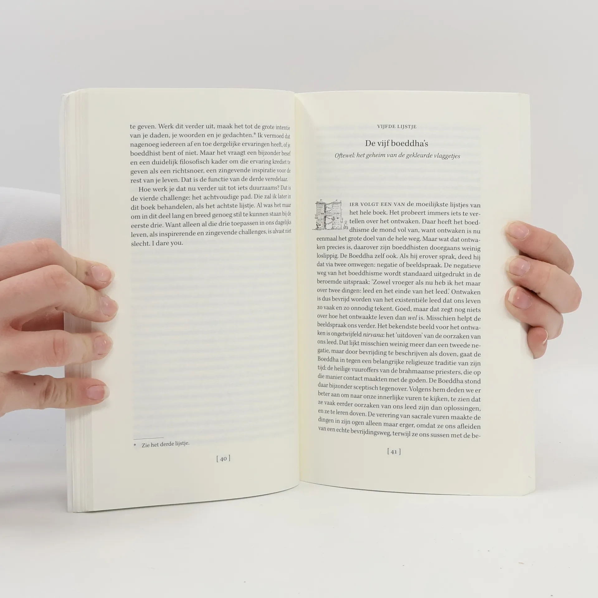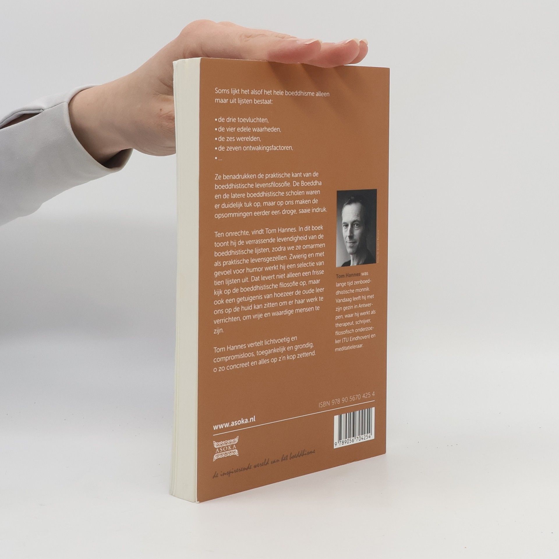 Soms lijkt het alsof het hele boeddhisme alleen maar uit lijsten bestaat: de drie toevluchten, de vier edele waarheden, de zes werelden, de zeven ontwakingsfactoren… Ze benadrukken de praktische kant van de boeddhistische levensfilosofie. De Boeddha en de latere boeddhistische scholen waren er duidelijk tuk op, maar op ons maken de opsommingen eerder een droge, saaie indruk.Ten onrechte, vindt Tom Hannes. In dit boek toont hij een verrassende levendigheid van de boeddhistische lijsten zodra we ze omarmen als praktische levensgezellen. Zwierig en met gevoel voor humor werkt hij een selectie van tien lijsten uit. Dat levert niet alleen een frisse kijk op de boeddhistische filosofie op, maar ook een getuigenis van hoezeer de antieke leer ons op de huid kan zitten om er haar werk te verrichten, om vrije en waardige mensen te zijn.Tom Hannes vertelt lichtvoetig en compromisloos, toegankelijk en grondig, o zo concreet en alles op z’n kop zettend.Tom Hannes was lange tijd zenboeddhistisch monnik. Tegenwoordig leeft hij met zijn gezin in Antwerpen, waar hij werkt als therapeut, schrijver, filosofisch onderzoeker (TU Eindhoven) en meditatieleraar.