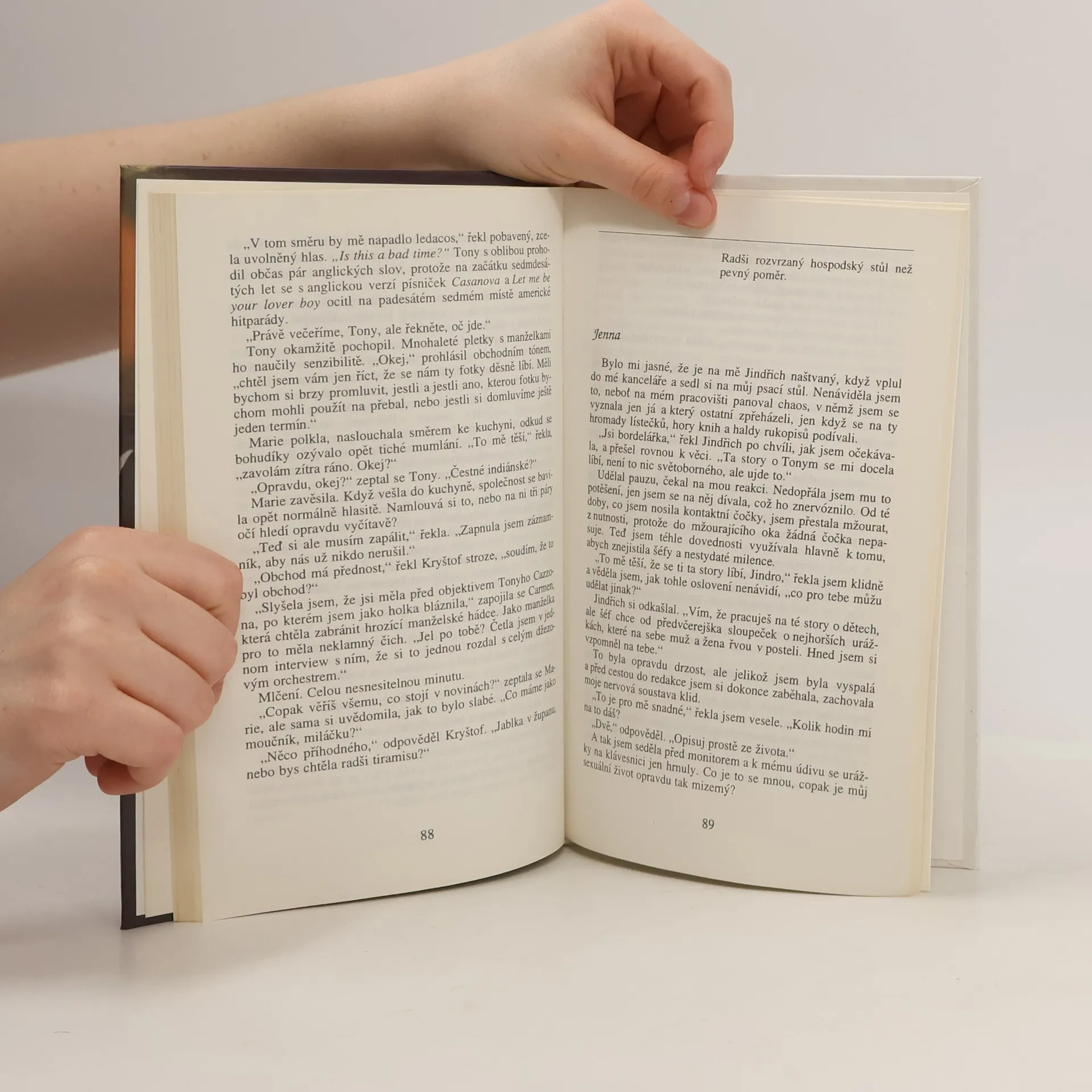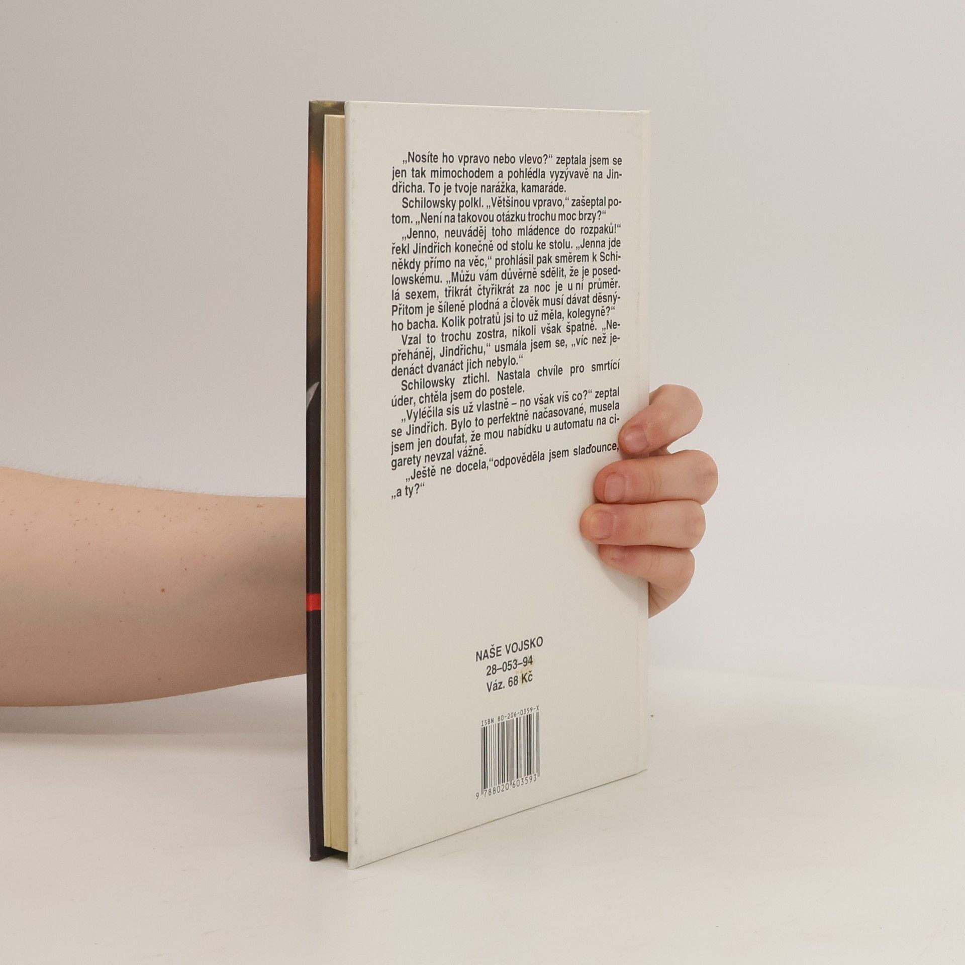 "Nosíte ho vpravo nebo vlevo?" zeptala jsem se jen tak mimochodem a pohlédla vyzývavě na Jindřicha. To je tvoje narážka, kamaráde. Schilowsky polkl. "Většinou vpravo," zašeptal potom. "Není na takovou otázku trochu moc brzy?" "Jenno, neuváděj toho mládence do rozpaků!" řekl Jindřich konečně od stolu ke stolu. "Jenna jde někdy přímo na věc," prohlásil směrem k Schilowskému. "Můžu vám důvěrně sdělit, že je posedlá sexem, třikrát čtyřikrát za noc je u ní průměr. Přitom je šíleně plodná a člověk musí dávat děsnýho bacha."