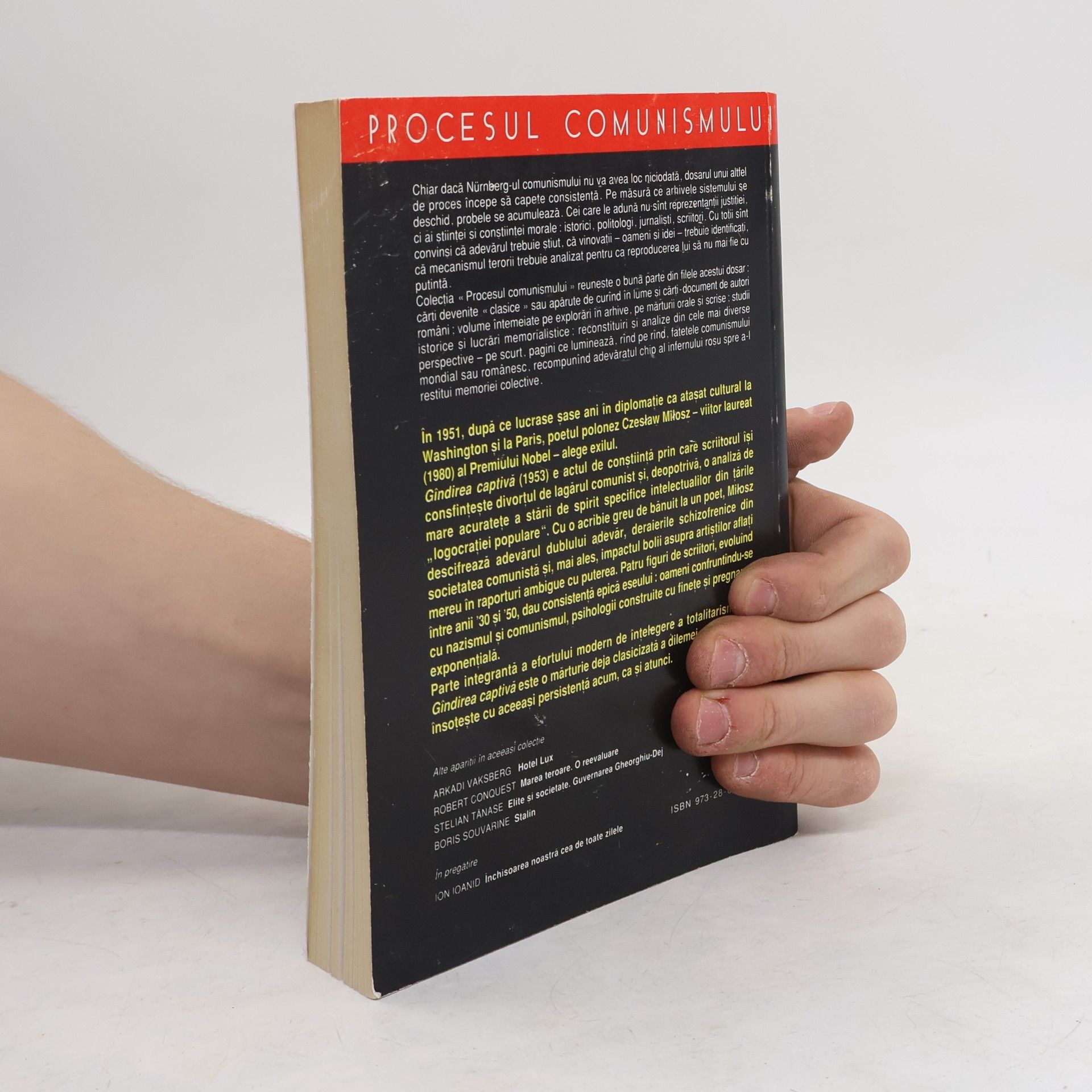 Gandirea captiva (1953) e actul de constiinta prin care scriitorul isi consfinteste divortul de lagarul comunist si, deopotriva, o analiza de mare acuratete a starii de spirit specifice intelectualilor din tarile „logocratiei populare–. Cu o acribie greu de banuit la un poet, Milosz descifreaza adevarul dublului adevar, deraierile schizofrenice din societatea comunista si, mai ales, impactul bolii asupra artistilor aflati mereu in raporturi ambigue cu puterea. Patru figuri de scriitori, evoluand intre anii '30 si '50, dau consistenta epica eseului: oameni confruntandu-se cu nazismul si comunismul, psihologii construite cu finete si pregnanta exponentiala. Parte integranta a efortului modern de intelegere a totalitarismului, Gandirea captiva este o marturie deja clasicizata a dilemei morale ce ne insoteste cu aceeasi persistenta acum, ca si atunci.