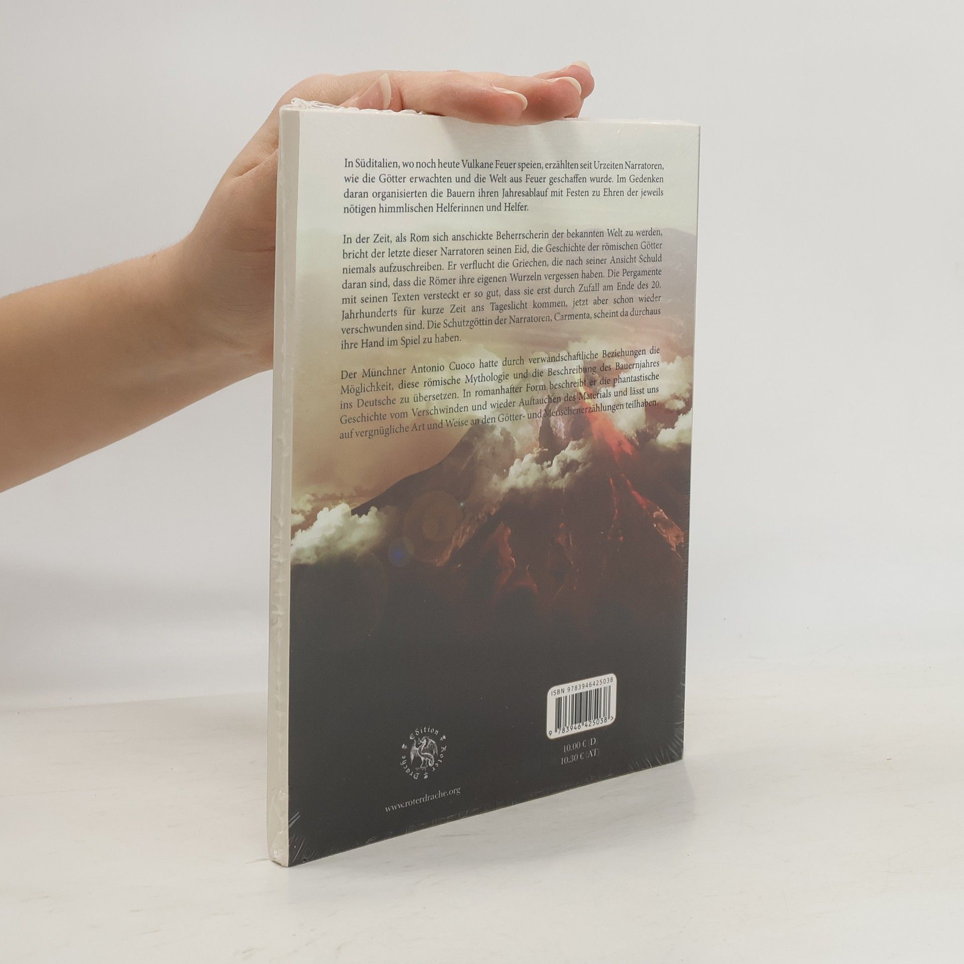 In Süditalien, wo noch heute Vulkane Feuer speien, erzählten seit Urzeiten Narratoren, wie die Götter erwachten und die Welt aus Feuer geschaffen wurde. Im Gedenken daran organisierten die Bauern ihren Jahresablauf mit Festen zu Ehren der jeweils nötigen himmlischen Helferinnen und Helfer.In der Zeit, als Rom sich anschickte Beherrscherin der bekannten Welt zu werden, bricht der letzte dieser Narratoren seinen Eid, die Geschichte der römischen Götter niemals aufzuschreiben. Er verflucht die Griechen, die nach seiner Ansicht Schuld daran sind, dass die Römer ihre eigenen Wurzeln vergessen haben. Die Pergamente mit seinen Texten versteckt er so gut, dass sie erst durch Zufall am Ende des 20. Jahrhunderts für kurze Zeit ans Tageslicht kommen, jetzt aber schon wieder verschwunden sind. Die Schutzgöttin der Narratoren, Carmenta, scheint da durchaus ihre Hand im Spiel zu haben.Der Münchner Antonio Cuoco hatte durch verwandschaftliche Beziehungen die Möglichkeit, diese römische Mythologie und die Beschreibung des Bauernjahres ins Deutsche zu übersetzen. In romanhafter Form beschreibt er die phantastische Geschichte vom Verschwinden und wieder Auftauchen des Materials und lässt uns auf vergnügliche Art und Weise an den Götter- und Menschenerzählungen teilhaben.
