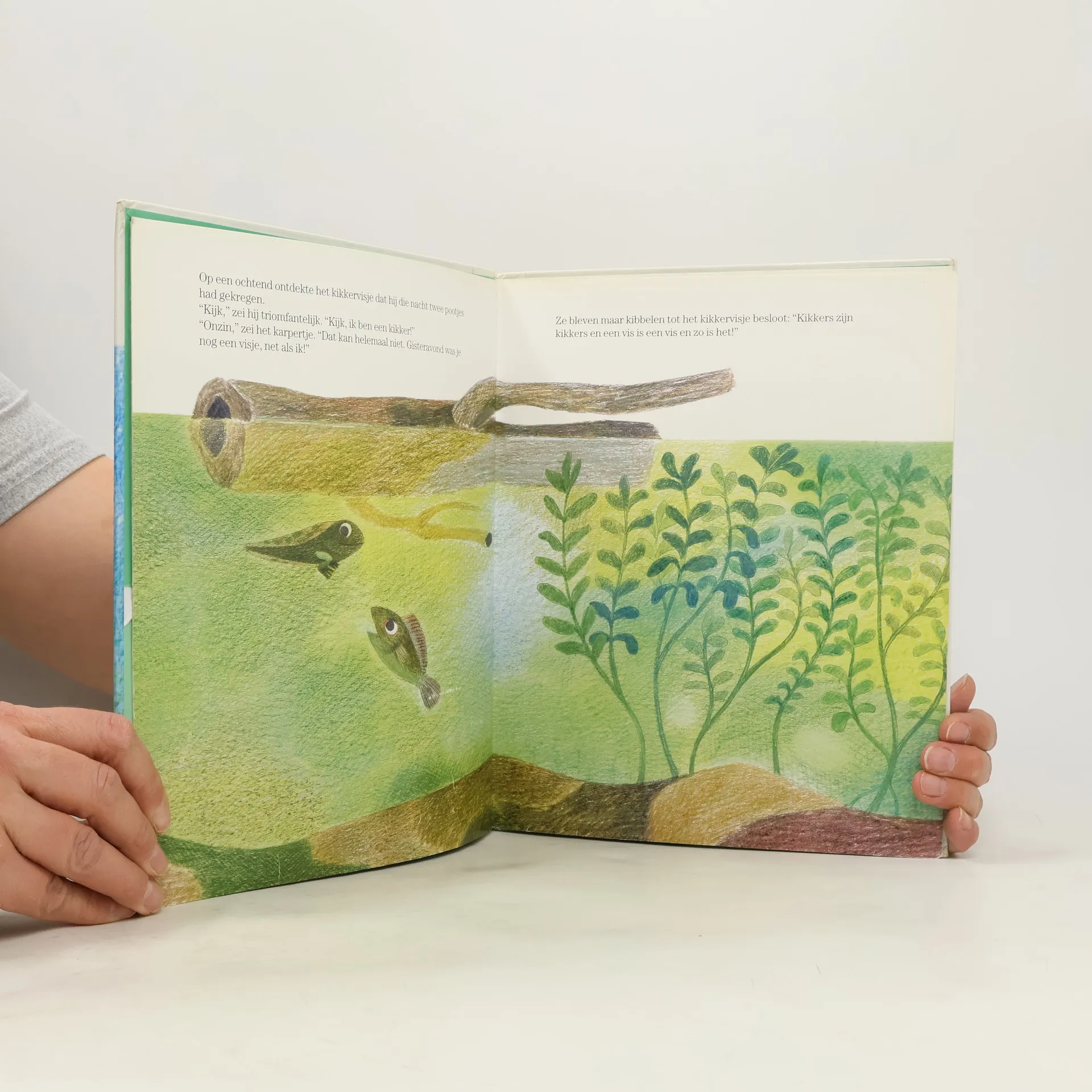 Een kikkervisje en een karper zijn dikke vrienden. Het kikkervisje wordt een kikker en gaat aan land. Dat wil de karper ook, maar of dat zo'n goed idee is? Prentenboek met grote, kleurrijke illustraties. Vanaf ca. 4 jaar.