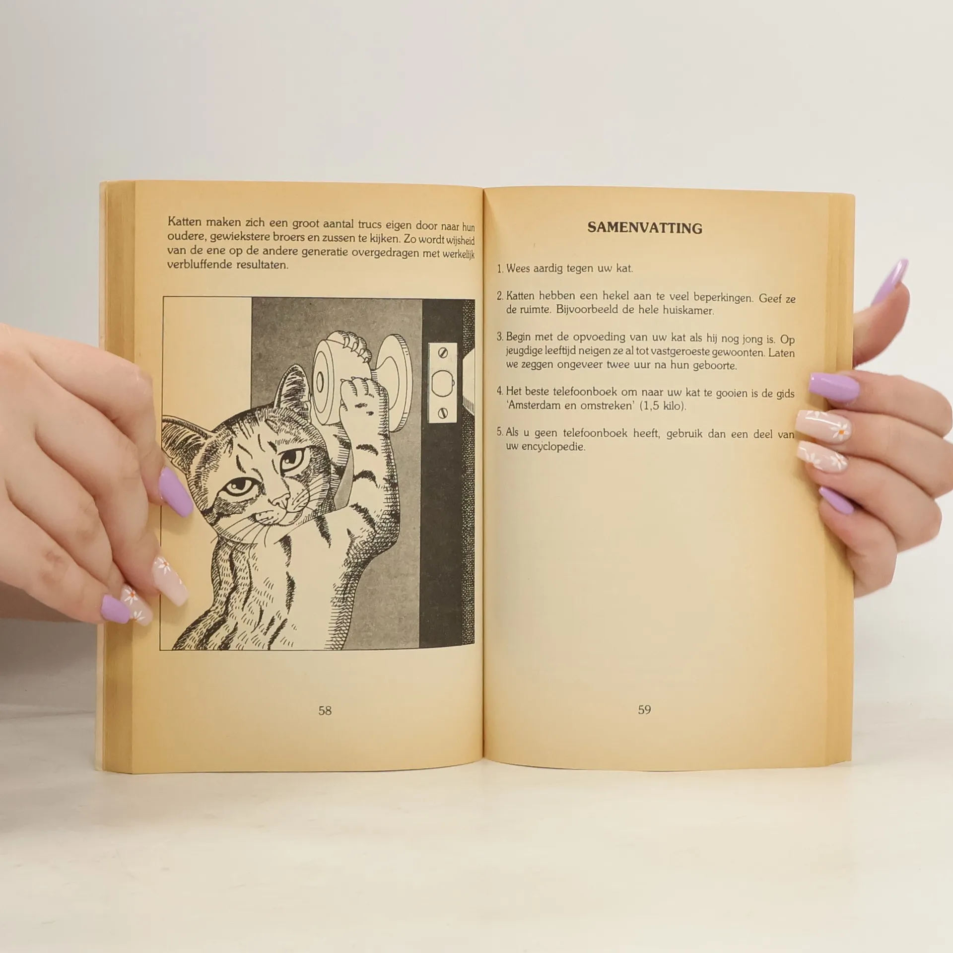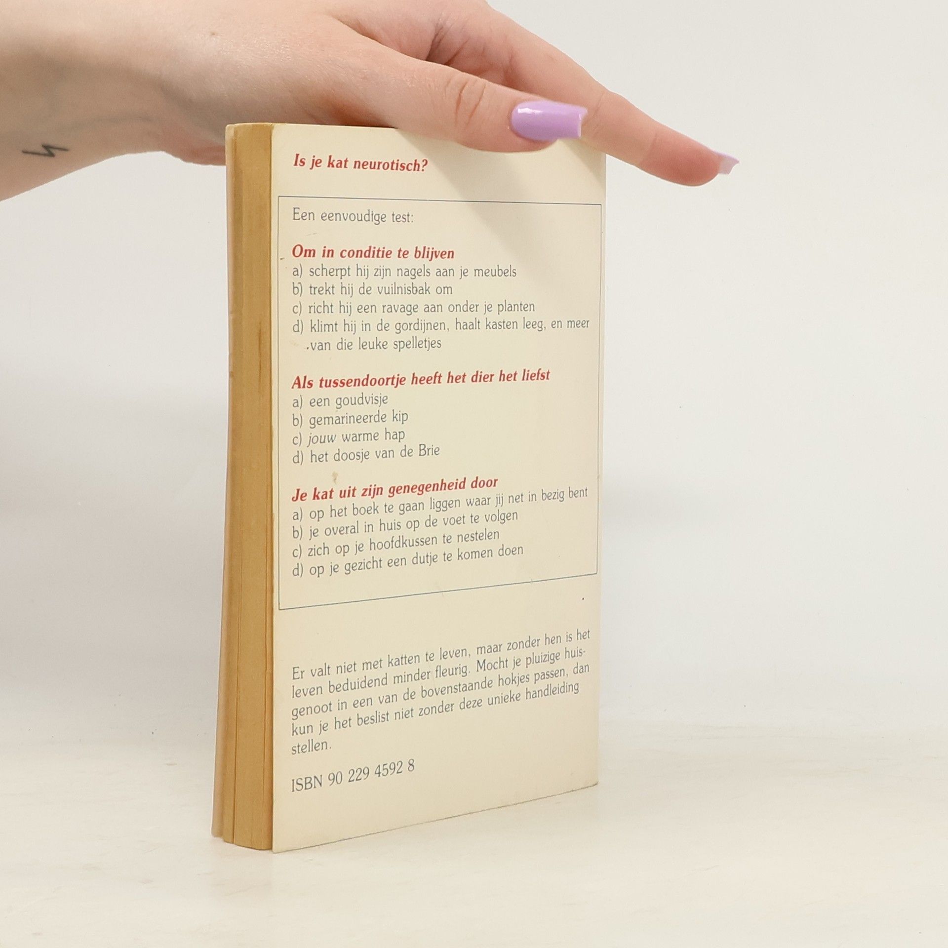 Wie is er de baas? Jij of je kat? Met dit boek in handen verschaf je jezelf de kans kats karakter te doorgronden (zeer wollig), je kat op te voeden (haha!) en je autoriteit te bevestigen (succes!). Is je kat neurotisch? Een eenvoudige test: Om in conditie te blijven a) scherpt hij zijn nagels aan je meubels b) trekt hij de vuilnisbak om c) richt hij een ravage aan onder je planten d) klimt hij in de gordijnen, haalt kasten leeg, en meer van die leuke spelletjes Als tussendoortje heeft het dier het liefst a) een goudvisje b) gemarineerde kip c) jouw warme hap d) het doosje van de Brie Je kat uit zijn genegenheid door a) op het boek te gaan ligggen waar jij net in bezig bent b) je overal in huis op de voet te volgen c) zich op je hoofdkussen te nestelen d) op je gezicht een dutje te komen doen Er valt niet met katten te leven, maar zonder hen is het leven beduidend minder fleurig. Mocht je pluizige huisgenoot in een van de bovenstaande hokjes passen, dan kun je het beslist niet zonder deze unieke handleiding stellen.