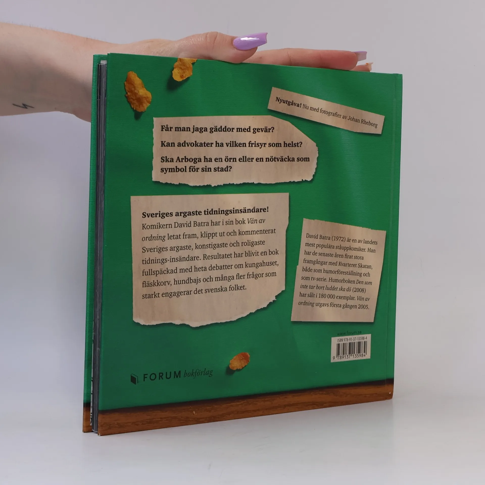 Nyutgåva! Nu med fotografier av Johan Rheborg Batra har samlat Sveriges argaste tidningsinsändare! Får man jaga gäddor med gevär? Kan advokater ha vilken frisyr som helst? Ska Arboga ha en örn eller en nötväcka som symbol för sin stad? Dessa är bara några av de frågor som starkt engagerar svenska folket. Komikern David Batra har i sin bok Vän av ordning letat fram, klippt ut och kommenterat Sveriges argaste, konstigaste och roligaste insändare. Detta har resulterat i en bok fullspäckad med heta debatter om bl.a. hundbajs, kungahuset och fläskkorv. Vän av ordning utgavs första gången 2005.