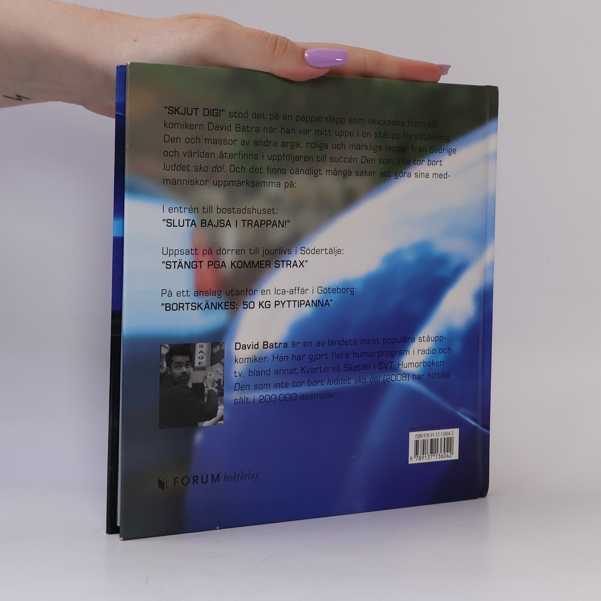 Uppföljare till succén! Ännu fler arga lappar Äntligen en ny bok med svenska folkets argaste lappar från David Batra. Efter succén med "Den som inte tar bort luddet ska dö!" hade David inte planerat att göra en uppföljare, men arga lappar fortsatte att strömma in från läsare runt om i landet och till slut hade brevhögen växt så pass att en ny bok liksom bara krävde att bli skriven. Det här var ju tråkigt är fylld med Sveriges knäppaste, roligaste och argaste lappar upphittade på ICA-butiken, folktandvården, dörren till soprummet och i en tvättstuga nära dig. För när man tittar efter noga finns de arga lapparna överallt och egentligen är det inget konstigt. Det måste vara det perfekta sättet att föra ut sina åsikter och känslor i världens mest konflikträdda land. Boken är genomillustrerad och de flesta lapparna har personliga kommentarer av David Batra. En perfekt presentbok!