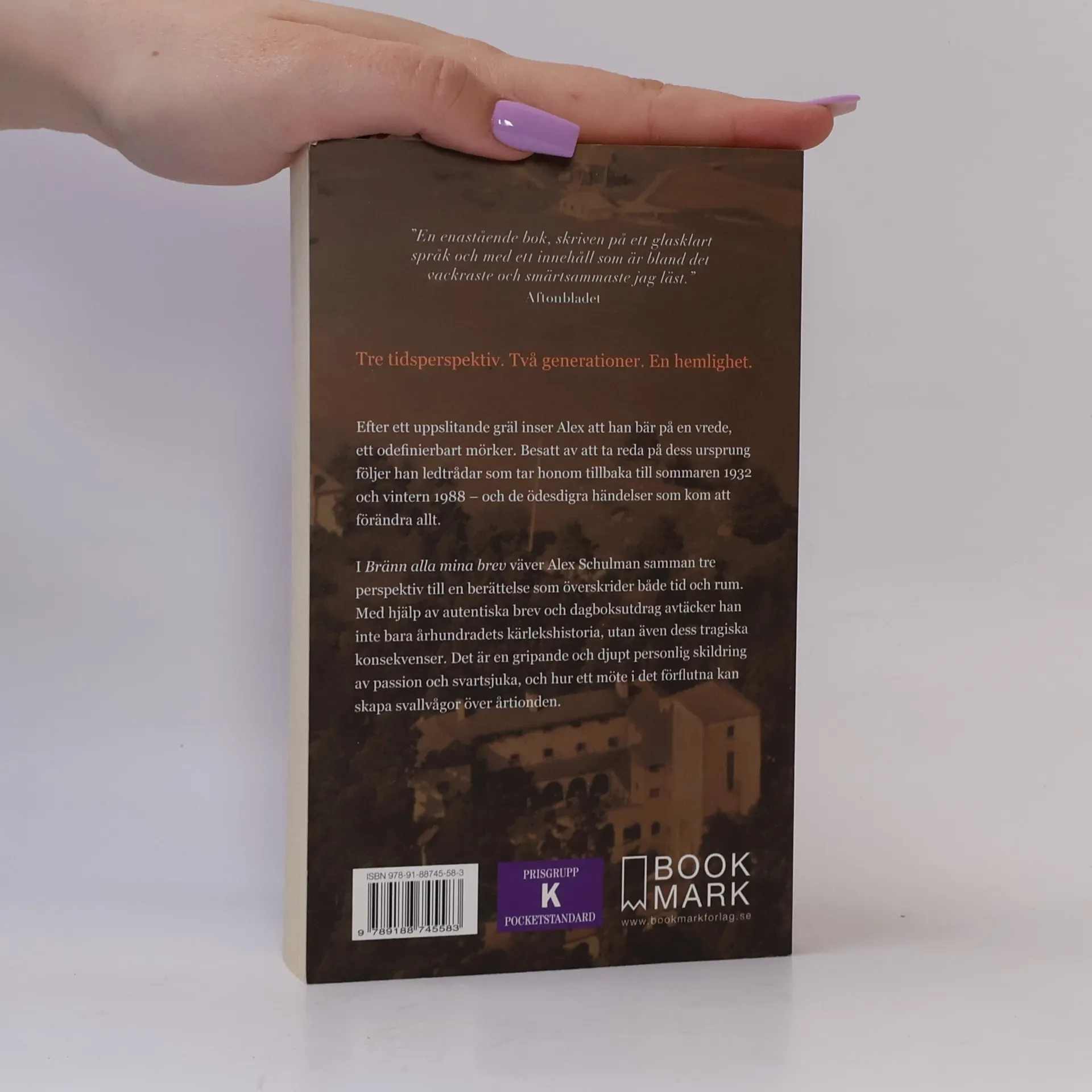 Tre tidsperspektiv. Två generationer. En hemlighet. Det är 1989 och Alex är på ett ödesdigert besök hos sina morföräldrar. Det är något som inte stämmer och han kan inte förstå vad som har orsakat sprickan som ekar mellan väggarna. Det är 2018 och Alex kommer av en slump sin mormors hemliga kärlekshistoria från 1932 på spåren. Ett brev ger honom svaren som han inte visste att han har spenderat ett helt liv att söka efter. Frågan är om han är redo att konfrontera det som kan vara roten till släktens mörker. Med skicklig hand väver Schulman samman en berättelse som överskrider både tid och rum. Det är en gripande och djupt personlig skildring av identitet, familj och hur en händelse kan skapa svallvågor som går genom generationer.