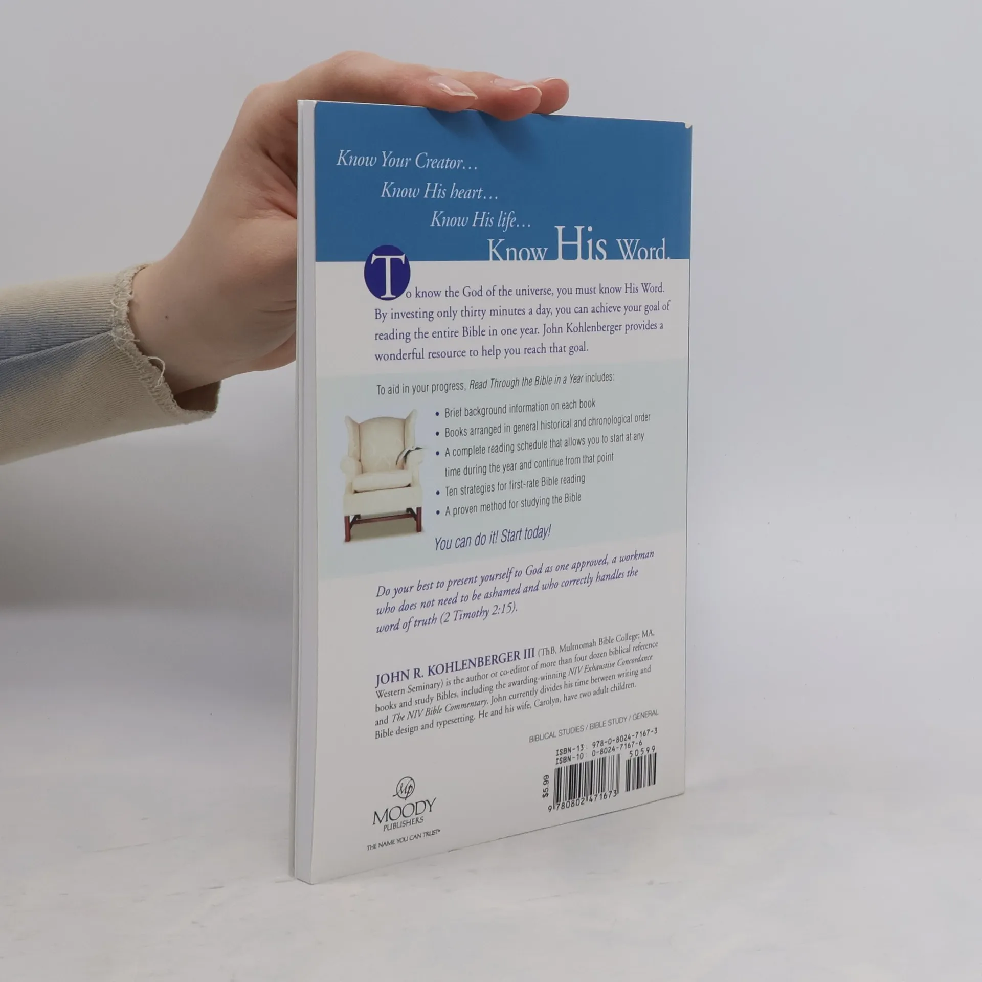 To know the God of the universe, you must know His Word. By investing only thirty minutes a day, you can achieve your goal of reading the entire Bible in one year. John Kohlenberger provides a wonderful resource to help you reach that goal. To aid in your progress, Read Through the Bible in a Year includes: Brief background information on each book Books arranged in general historical and chronological order A complete reading schedule that allows you to start at any time during the year and continue from that point Ten strategies for first-rate Bible reading A proven method for studying the Bible