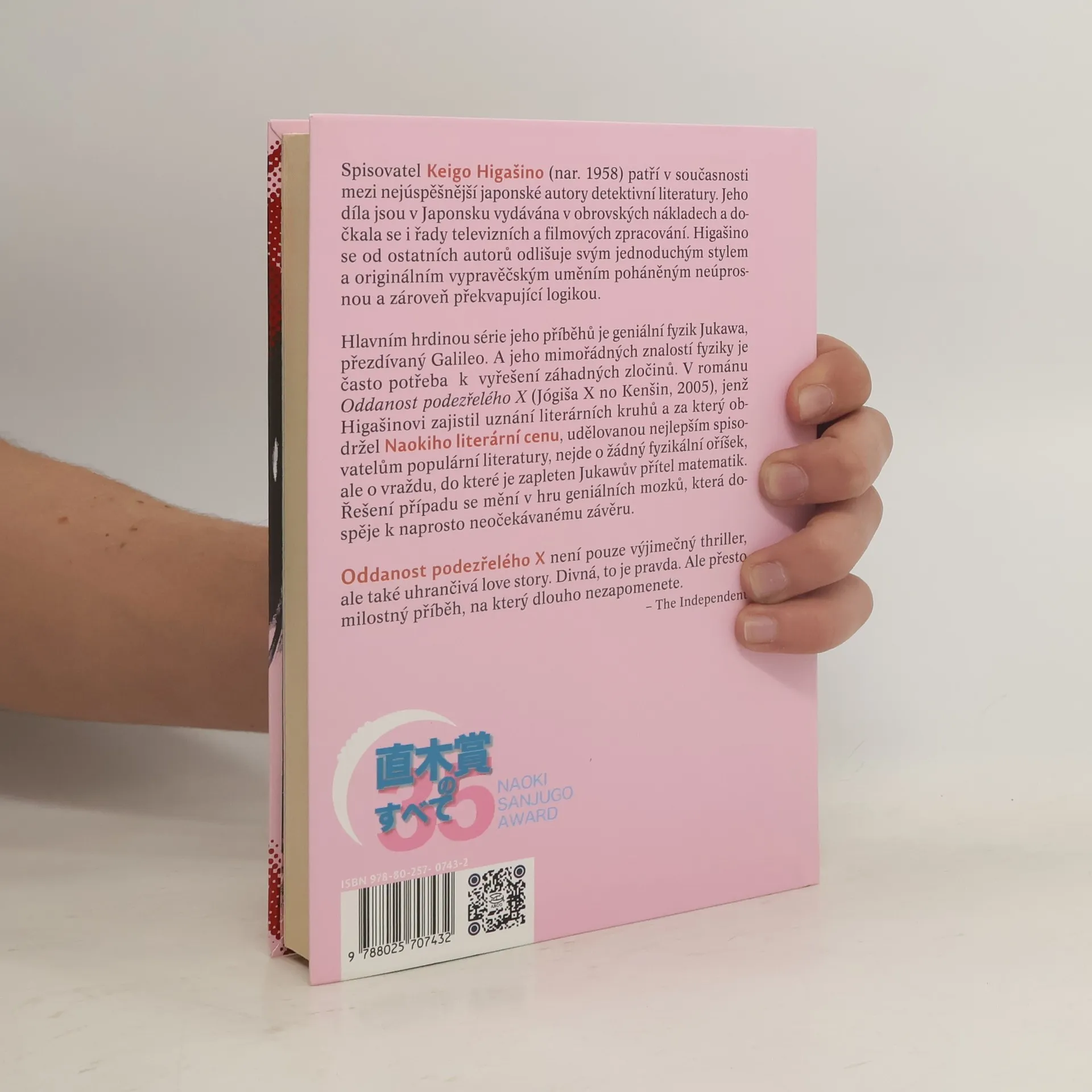 Román Oddanost podezřelého X prozaika Keiga Higašina vypráví příběh Jasuko, která v sebeobraně zavraždila svého bývalého manžela. Všechny stopy se jí snaží pomoci zahladit soused Tecuja Išigami, geniální matematik, jenž je do ní bezmezně zamilován. K vyšetřování zločinu je však přizván profesor Manabu Jukawa, Išigamiho přítel ze studií. Jukawa, známý též pod přezdívkou Galileo, postupně odkrývá pravdu, a to navzdory přerušenému vyšetřování ze strany policie. Román získal několik japonských literárních cen včetně prestižní Naokiho ceny pro spisovatele populární literatury. MEDAILONEK SPISOVATELE: Keigo Higašino (nar. 1958) patří v současnosti k nejčtenějším japonským spisovatelům. Proslavil se hlavně příběhy žánru "mystery", v nichž se často dotýká i společenské problematiky. Původně pracoval jako technik ve firmě Denso, avšak po úspěchu svého prvního románu Po škole (Hókago, 1985) se začal ve svých 27 letech naplno věnovat tvůrčímu psaní. Mezi jeho neznámější romány patří díla Tajemství (Himicu, 1998), Bílá noc (Bjakujakó, 1999) nebo Oddanost podezřelého X (Jógiša X no kenšin, 2005), za který Higašino získal významnou Naokiho cenu, udělovanou spisovatelům populární literatury. Za svá díla obdržel i mnohá jiná ocenění a důkazem jeho oblíbenosti je rovněž fakt, že většina jeho románů a povídek se dočkala filmového nebo televizního zpracování.
