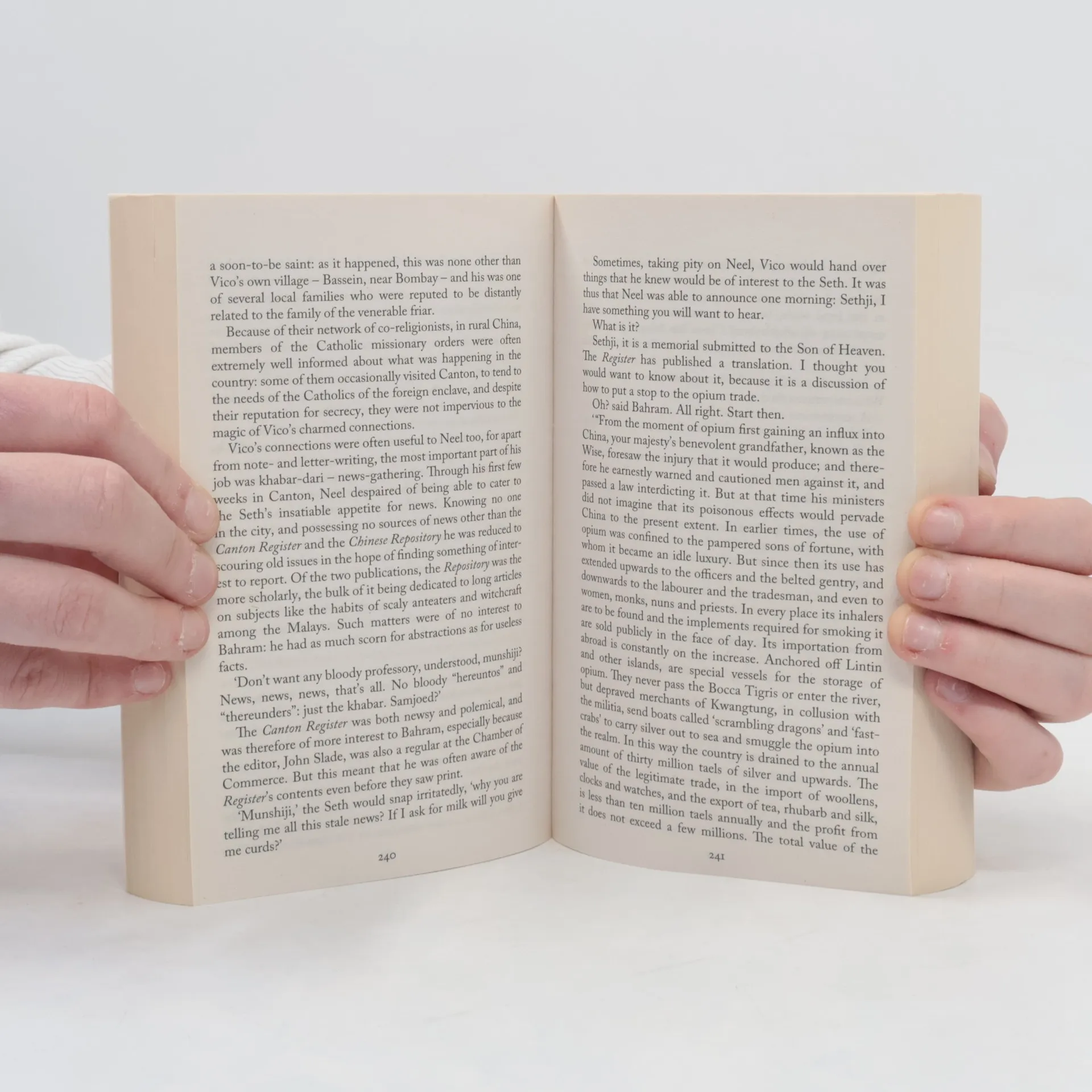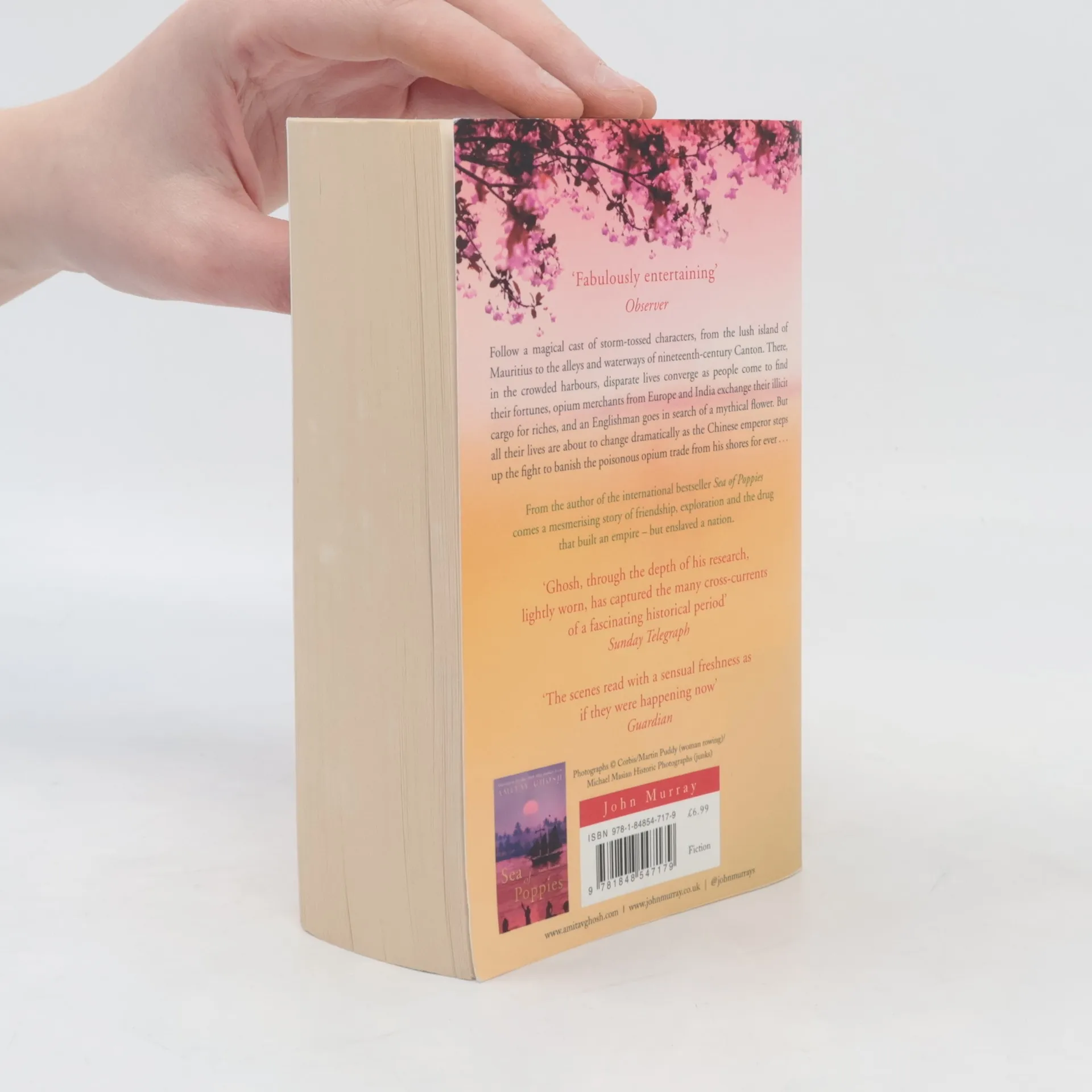In September 1838, a storm blows up on the Indian Ocean and the Ibis, a ship carrying a consignment of convicts and indentured laborers from Calcutta to Mauritius, is caught up in the whirlwind. River of Smoke follows its storm-tossed characters to the crowded harbors of China. There, despite efforts of the emperor to stop them, ships from Europe and India exchange their cargoes of opium for boxes tea, silk, porcelain and silver. Among them are Bahram Modi, a wealthy Parsi opium merchant out of Bombay, his estranged half-Chinese son Ah Fatt, the orphaned Paulette and a motley collection of others whose pursuit of romance, riches and a legendary rare flower have thrown together. All struggle to cope with their losses—and for some, unimaginable freedoms—in the alleys and crowded waterways of 19th-century Canton.