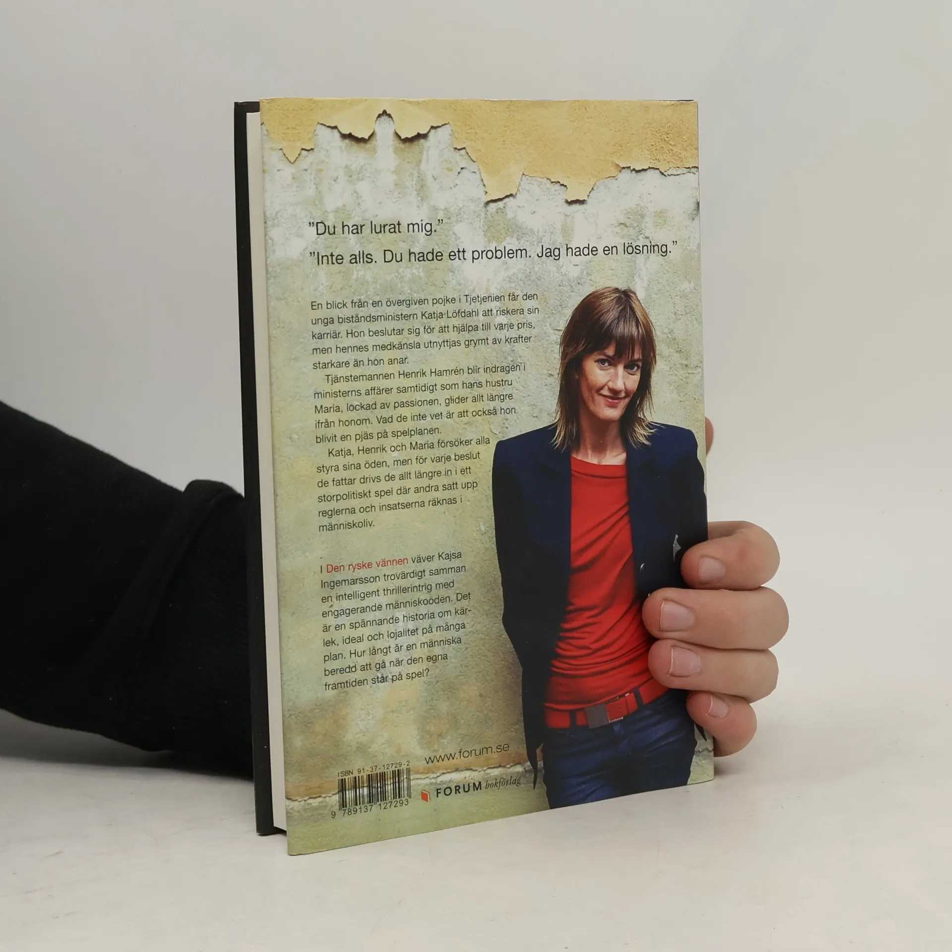 Du har lurat mig. Inte alls. Du hade ett problem. Jag hade en lösning. En blick från en övergiven pojke i Tjetjenien får den unga biståndsministern Katja Löfdahl att riskera sin karriär. Hon beslutar sig för att hjälpa till varje pris, men hennes medkänsla utnyttjas grymt av krafter starkare än hon anar. Tjänstemannen Henrik Hamrén blir indragen i ministerns affärer samtidigt som hans hustru Maria, lockad av passionen, glider allt längre ifrån honom. Vad de inte vet är att också hon blivit en pjäs på spelplanen. Katja, Henrik och Maria försöker alla styra sina öden, men för varje beslut de fattar drivs de allt längre in i ett storpolitiskt spel där andra satt upp reglerna och insatserna räknas i människoliv. I Den ryske vännen väver Kajsa Ingemarsson trovärdigt samman en intelligent thrillerintrig med engagerande människoöden. Det är en spännande historia om kärlek, ideal och lojalitet på många plan. Hur långt är en människa beredd att gå när den egna framtiden står på spel? Kajsa Ingemarsson, född 1965, har en bakgrund som tolk och diplomat samt var under flera år anställd på Säpos kontraspionage. Hennes tidigare böcker, På det fjärde ska det ske, Inte enklare än så och Små citroner gula har fått mycket beröm och sålts i stora upplagor. Hon kombinerar författandet med arbete som komiker och satiriker på radio och tv och hennes uppskattade krönikor kan läsas i bland annat Damernas värld.