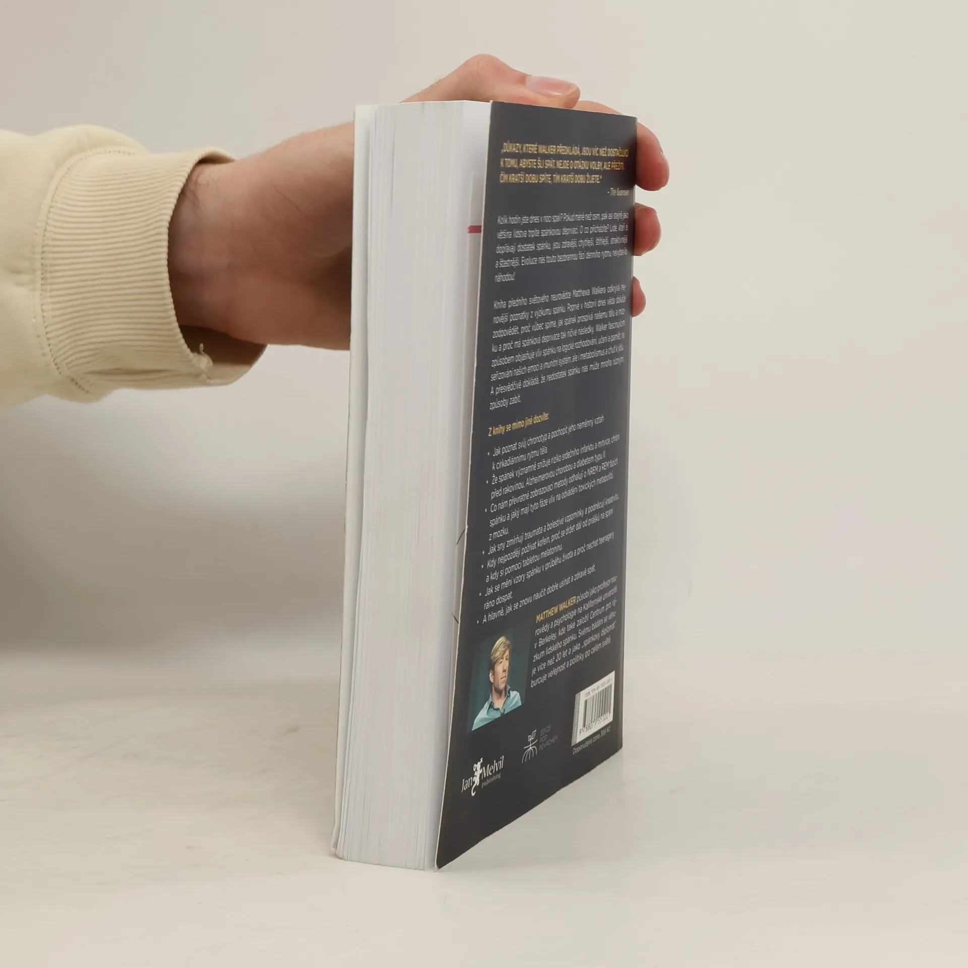 Kolik hodin jste dnes v noci spali? Pokud méně než osm, pak asi stejně jako většina lidstva trpíte spánkovou deprivací. O co přicházíte? Lidé, kteří si dopřávají dostatek spánku, jsou zdravější, chytřejší, štíhlejší, atraktivnější a šťastnější. Evoluce nás touto bezbrannou fází denního rytmu nevybavila náhodou! Kniha předního světového neurovědce Matthewa Walkera odkrývá nejnovější poznatky z výzkumu spánku. Poprvé v historii dnes věda dokáže zodpovědět, proč vůbec spíme, jak spánek prospívá našemu tělu a mozku a proč má spánková deprivace tak ničivé následky. Walker fascinujícím způsobem objasňuje vliv spánku na logické rozhodování, učení a paměť, na seřizování našich emocí a imunitní systém, ale i metabolismus a chuť k jídlu. A přesvědčivě dokládá, že nedostatek spánku nás může mnoha různými způsoby zabít.