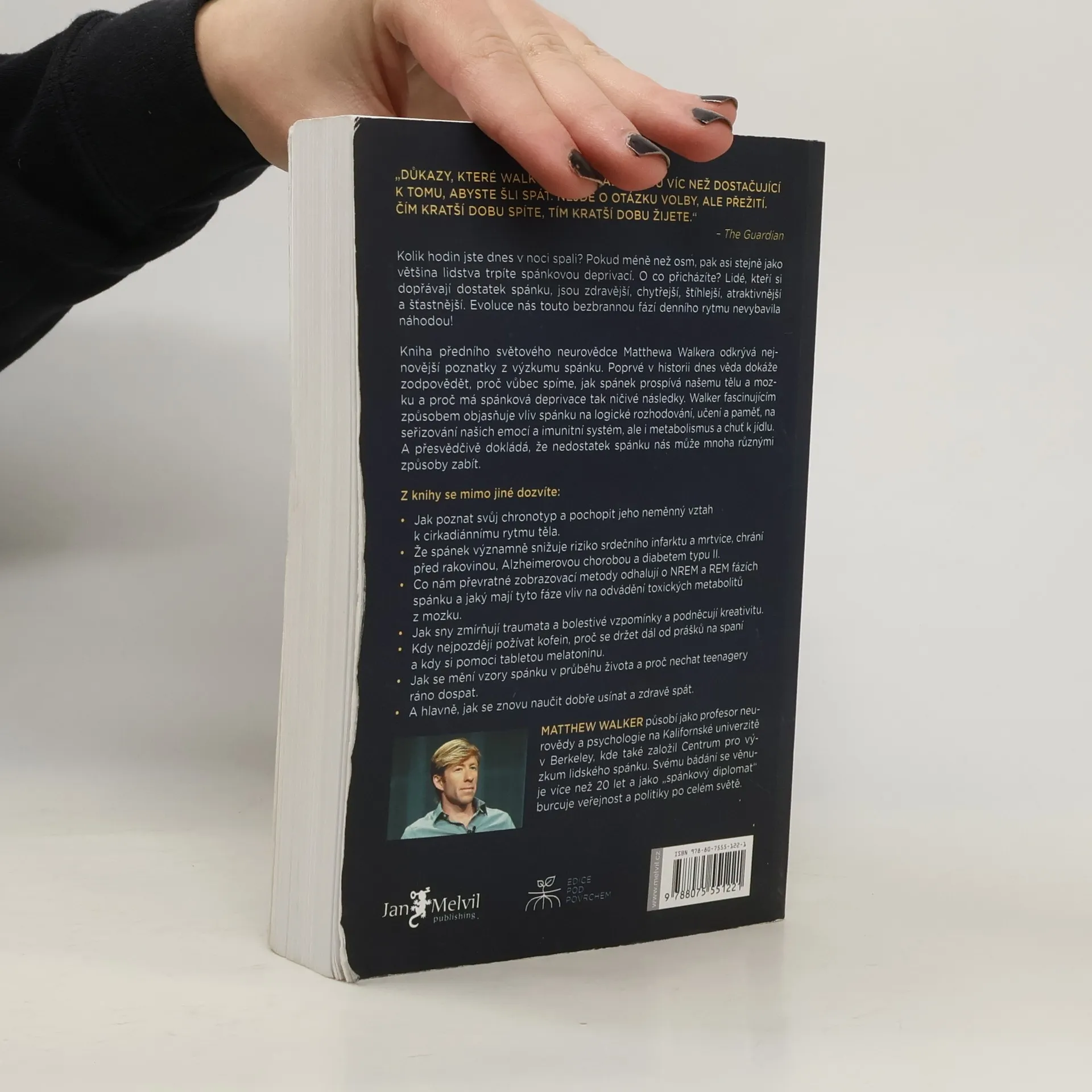 Kolik hodin jste dnes v noci spali? Pokud méně než osm, pak asi stejně jako většina lidstva trpíte spánkovou deprivací. O co přicházíte? Lidé, kteří si dopřávají dostatek spánku, jsou zdravější, chytřejší, štíhlejší, atraktivnější a šťastnější. Evoluce nás touto bezbrannou fází denního rytmu nevybavila náhodou! Kniha předního světového neurovědce Matthewa Walkera odkrývá nejnovější poznatky z výzkumu spánku. Poprvé v historii dnes věda dokáže zodpovědět, proč vůbec spíme, jak spánek prospívá našemu tělu a mozku a proč má spánková deprivace tak ničivé následky. Walker fascinujícím způsobem objasňuje vliv spánku na logické rozhodování, učení a paměť, na seřizování našich emocí a imunitní systém, ale i metabolismus a chuť k jídlu. A přesvědčivě dokládá, že nedostatek spánku nás může mnoha různými způsoby zabít.