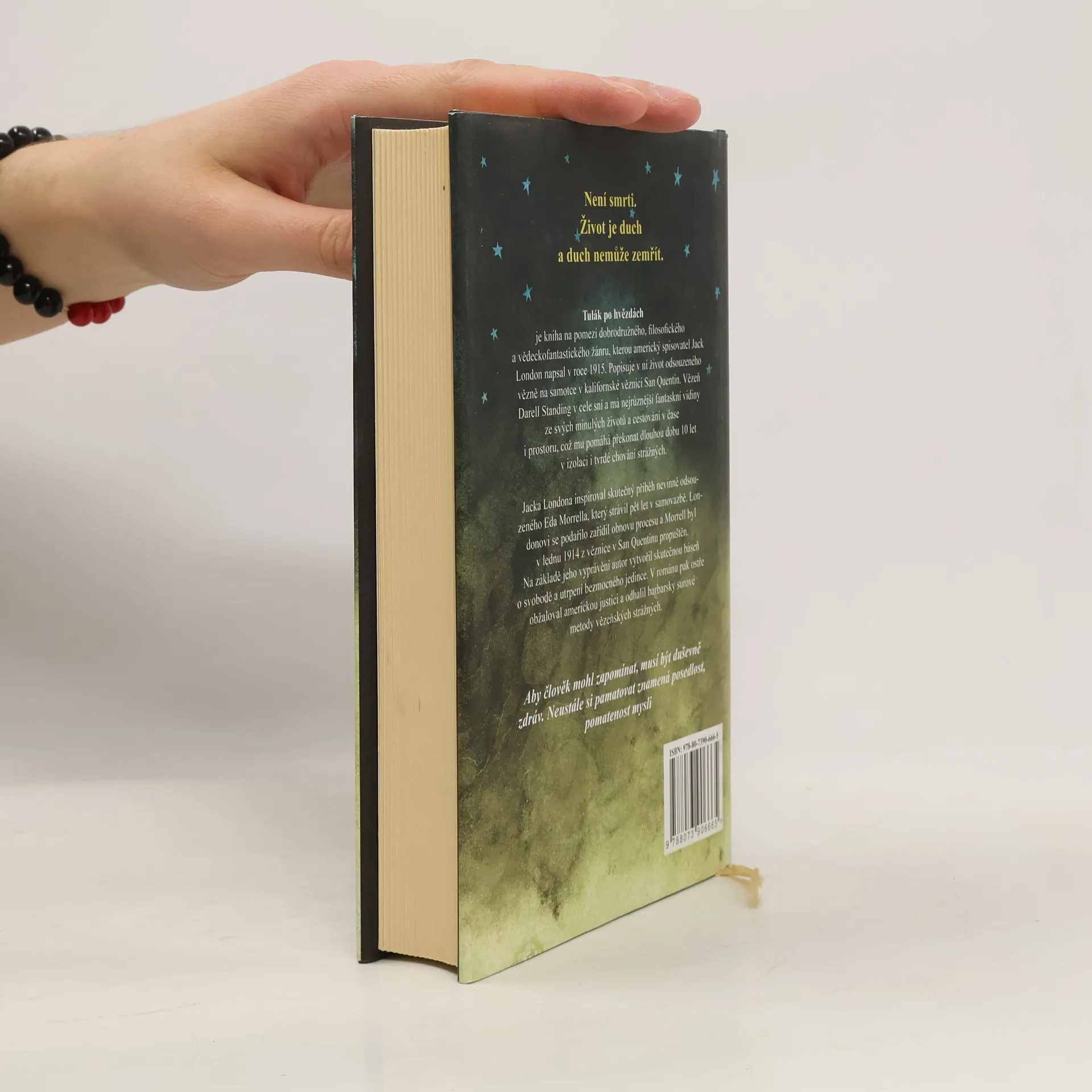 Není smrti. Život je duch a duch nemůže zemřít. Tulák po hvězdách je příběh na pomezí dobrodružného, filosofického a vědeckofantastického žánru, kterou americký spisovatel Jack London napsal v roce 1915. Popisuje v ní život odsouzeného vězně na samotce v kalifornské věznici San Quentin. Vězeň Darell Standing v cele sní a má nejrůznější fantaskní vidiny ze svých minulých životů a cestování v čase i prostoru, což mu pomáhá překonat dlouhou dobu 10 let v izolaci i tvrdé chování strážných Jacka Londona inspiroval skutečný příběh nevinně odsouzeného Eda Morrella, který strávil pět let v samovazbě. Londonovi se podařilo zařídil obnovu procesu a Morrell byl v lednu 1914 z věznice v San Quentinu propuštěn. Na základě jeho vyprávění autor vytvořil skutečnou báseň o svobodě a utrpení bezmocného jedince. V románu pak ostře obžaloval americkou justici a odhalil barbarsky surové metody vězeňských strážných. Aby člověk mohl zapomínat, musí být duševně zdráv. Neustále si pamatovat znamená posedlost, pomatenost mysli. Upravený překlad z roku 1922.
