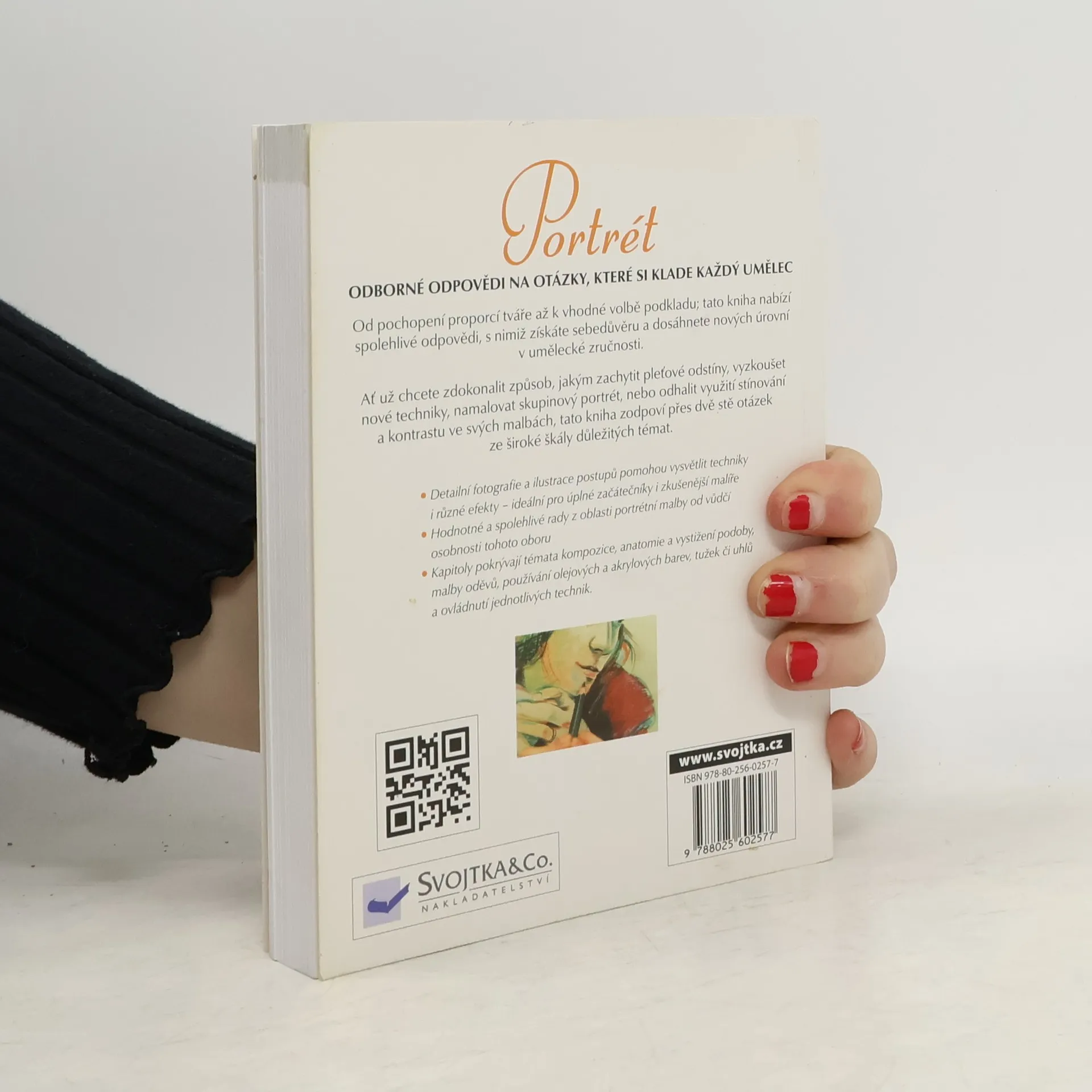 Tato kniha je ideálním pomocníkem jak pro začátečníky, tak pro zkušenější malíře. Ať už budete chtít lépe pochopit proporce tváře, zvolit vhodný podklad, zdokonalit způsob, jakým zachytíte odstíny pleti, vyzkoušet si nové techniky, namalovat skupinový portrét nebo odhalit využití stínování a kontrastu ve svých malbách – v této příručce naleznete potřebné odborné informace a odpovědi na více než 200 nejčastějších otázek, které se týkají široké škály témat portrétní malby, jako jsou kompozice, anatomie, vystižení podoby, malby oděvů, používání olejových a akrylových barev, tužek či uhlu a ovládnutí jednotlivých technik i různých efektů. K tomu, abyste vše dokonale zvládli, vám napomohou i detailní fotografie a ilustrace jednotlivých postupu znázorněné metodou krok za krokem. Získejte tedy sebedůvěru a dosáhnete vyšší umělecké úrovně v oblasti portrétní malby!